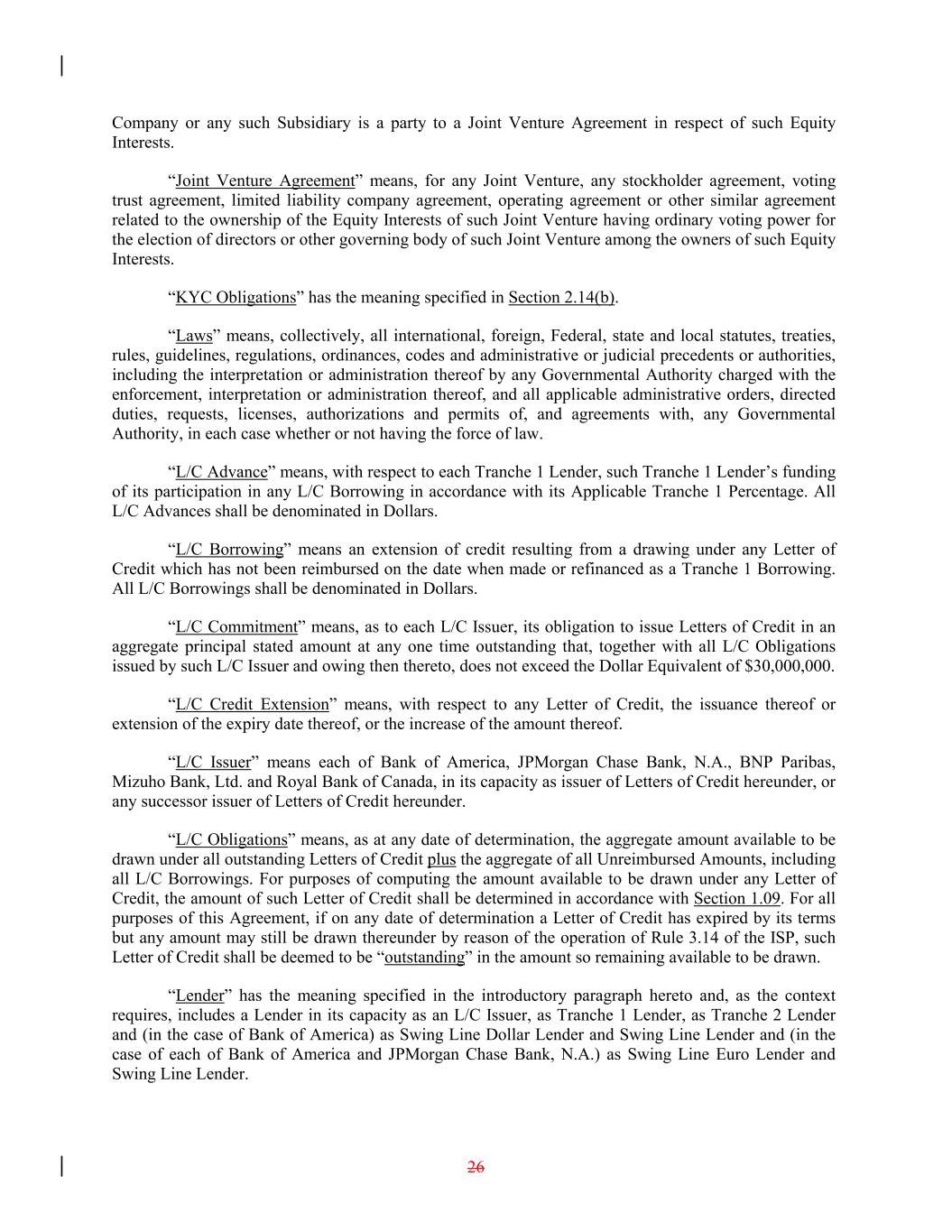 Company or any such Subsidiary is a party to a Joint Venture Agreement in respect of such Equity Interests. “Joint Venture Agreement” means, for any Joint Venture, any stockholder agreement, voting trust agreement, limited liability company agreement, operating agreement or other similar agreement related to the ownership of the Equity Interests of such Joint Venture having ordinary voting power for the election of directors or other governing body of such Joint Venture among the owners of such Equity Interests. “KYC Obligations” has the meaning specified in Section 2.14(b). “Laws” means, collectively, all international, foreign, Federal, state and local statutes, treaties, rules, guidelines, regulations, ordinances, codes and administrative or judicial precedents or authorities, including the interpretation or administration thereof by any Governmental Authority charged with the enforcement, interpretation or administration thereof, and all applicable administrative orders, directed duties, requests, licenses, authorizations and permits of, and agreements with, any Governmental Authority, in each case whether or not having the force of law. “L/C Advance” means, with respect to each Tranche 1 Lender, such Tranche 1 Lender’s funding of its participation in any L/C Borrowing in accordance with its Applicable Tranche 1 Percentage. All L/C Advances shall be denominated in Dollars. “L/C Borrowing” means an extension of credit resulting from a drawing under any Letter of Credit which has not been reimbursed on the date when made or refinanced as a Tranche 1 Borrowing. All L/C Borrowings shall be denominated in Dollars. “L/C Commitment” means, as to each L/C Issuer, its obligation to issue Letters of Credit in an aggregate principal stated amount at any one time outstanding that, together with all L/C Obligations issued by such L/C Issuer and owing then thereto, does not exceed the Dollar Equivalent of $30,000,000. “L/C Credit Extension” means, with respect to any Letter of Credit, the issuance thereof or extension of the expiry date thereof, or the increase of the amount thereof. “L/C Issuer” means each of Bank of America, JPMorgan Chase Bank, N.A., BNP Paribas, Mizuho Bank, Ltd. and Royal Bank of Canada, in its capacity as issuer of Letters of Credit hereunder, or any successor issuer of Letters of Credit hereunder. “L/C Obligations” means, as at any date of determination, the aggregate amount available to be drawn under all outstanding Letters of Credit plus the aggregate of all Unreimbursed Amounts, including all L/C Borrowings. For purposes of computing the amount available to be drawn under any Letter of Credit, the amount of such Letter of Credit shall be determined in accordance with Section 1.09. For all purposes of this Agreement, if on any date of determination a Letter of Credit has expired by its terms but any amount may still be drawn thereunder by reason of the operation of Rule 3.14 of the ISP, such Letter of Credit shall be deemed to be “outstanding” in the amount so remaining available to be drawn. “Lender” has the meaning specified in the introductory paragraph hereto and, as the context requires, includes a Lender in its capacity as an L/C Issuer, as Tranche 1 Lender, as Tranche 2 Lender and (in the case of Bank of America) as Swing Line Dollar Lender and Swing Line Lender and (in the case of each of Bank of America and JPMorgan Chase Bank, N.A.) as Swing Line Euro Lender and Swing Line Lender. 26
