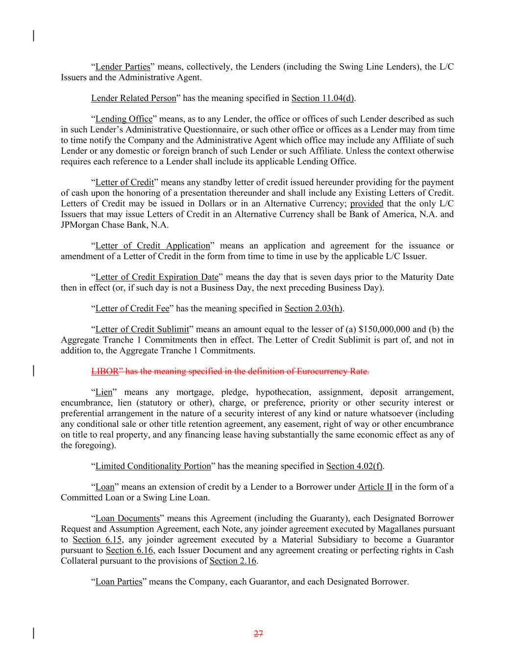 “Lender Parties” means, collectively, the Lenders (including the Swing Line Lenders), the L/C Issuers and the Administrative Agent. Lender Related Person” has the meaning specified in Section 11.04(d). “Lending Office” means, as to any Lender, the office or offices of such Lender described as such in such Lender’s Administrative Questionnaire, or such other office or offices as a Lender may from time to time notify the Company and the Administrative Agent which office may include any Affiliate of such Lender or any domestic or foreign branch of such Lender or such Affiliate. Unless the context otherwise requires each reference to a Lender shall include its applicable Lending Office. “Letter of Credit” means any standby letter of credit issued hereunder providing for the payment of cash upon the honoring of a presentation thereunder and shall include any Existing Letters of Credit. Letters of Credit may be issued in Dollars or in an Alternative Currency; provided that the only L/C Issuers that may issue Letters of Credit in an Alternative Currency shall be Bank of America, N.A. and JPMorgan Chase Bank, N.A. “Letter of Credit Application” means an application and agreement for the issuance or amendment of a Letter of Credit in the form from time to time in use by the applicable L/C Issuer. “Letter of Credit Expiration Date” means the day that is seven days prior to the Maturity Date then in effect (or, if such day is not a Business Day, the next preceding Business Day). “Letter of Credit Fee” has the meaning specified in Section 2.03(h). “Letter of Credit Sublimit” means an amount equal to the lesser of (a) $150,000,000 and (b) the Aggregate Tranche 1 Commitments then in effect. The Letter of Credit Sublimit is part of, and not in addition to, the Aggregate Tranche 1 Commitments. LIBOR” has the meaning specified in the definition of Eurocurrency Rate. “Lien” means any mortgage, pledge, hypothecation, assignment, deposit arrangement, encumbrance, lien (statutory or other), charge, or preference, priority or other security interest or preferential arrangement in the nature of a security interest of any kind or nature whatsoever (including any conditional sale or other title retention agreement, any easement, right of way or other encumbrance on title to real property, and any financing lease having substantially the same economic effect as any of the foregoing). “Limited Conditionality Portion” has the meaning specified in Section 4.02(f). “Loan” means an extension of credit by a Lender to a Borrower under Article II in the form of a Committed Loan or a Swing Line Loan. “Loan Documents” means this Agreement (including the Guaranty), each Designated Borrower Request and Assumption Agreement, each Note, any joinder agreement executed by Magallanes pursuant to Section 6.15, any joinder agreement executed by a Material Subsidiary to become a Guarantor pursuant to Section 6.16, each Issuer Document and any agreement creating or perfecting rights in Cash Collateral pursuant to the provisions of Section 2.16. “Loan Parties” means the Company, each Guarantor, and each Designated Borrower. 27