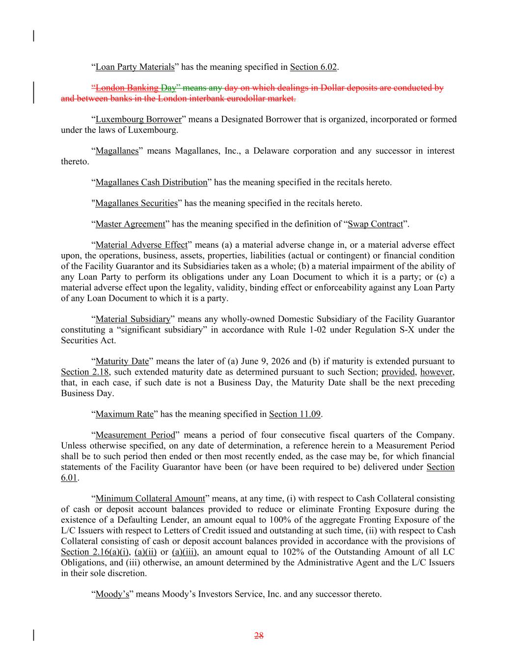 “Loan Party Materials” has the meaning specified in Section 6.02. “London Banking Day” means any day on which dealings in Dollar deposits are conducted by and between banks in the London interbank eurodollar market. “Luxembourg Borrower” means a Designated Borrower that is organized, incorporated or formed under the laws of Luxembourg. “Magallanes” means Magallanes, Inc., a Delaware corporation and any successor in interest thereto. “Magallanes Cash Distribution” has the meaning specified in the recitals hereto. "Magallanes Securities” has the meaning specified in the recitals hereto. “Master Agreement” has the meaning specified in the definition of “Swap Contract”. “Material Adverse Effect” means (a) a material adverse change in, or a material adverse effect upon, the operations, business, assets, properties, liabilities (actual or contingent) or financial condition of the Facility Guarantor and its Subsidiaries taken as a whole; (b) a material impairment of the ability of any Loan Party to perform its obligations under any Loan Document to which it is a party; or (c) a material adverse effect upon the legality, validity, binding effect or enforceability against any Loan Party of any Loan Document to which it is a party. “Material Subsidiary” means any wholly-owned Domestic Subsidiary of the Facility Guarantor constituting a “significant subsidiary” in accordance with Rule 1-02 under Regulation S-X under the Securities Act. “Maturity Date” means the later of (a) June 9, 2026 and (b) if maturity is extended pursuant to Section 2.18, such extended maturity date as determined pursuant to such Section; provided, however, that, in each case, if such date is not a Business Day, the Maturity Date shall be the next preceding Business Day. “Maximum Rate” has the meaning specified in Section 11.09. “Measurement Period” means a period of four consecutive fiscal quarters of the Company. Unless otherwise specified, on any date of determination, a reference herein to a Measurement Period shall be to such period then ended or then most recently ended, as the case may be, for which financial statements of the Facility Guarantor have been (or have been required to be) delivered under Section 6.01. “Minimum Collateral Amount” means, at any time, (i) with respect to Cash Collateral consisting of cash or deposit account balances provided to reduce or eliminate Fronting Exposure during the existence of a Defaulting Lender, an amount equal to 100% of the aggregate Fronting Exposure of the L/C Issuers with respect to Letters of Credit issued and outstanding at such time, (ii) with respect to Cash Collateral consisting of cash or deposit account balances provided in accordance with the provisions of Section 2.16(a)(i), (a)(ii) or (a)(iii), an amount equal to 102% of the Outstanding Amount of all LC Obligations, and (iii) otherwise, an amount determined by the Administrative Agent and the L/C Issuers in their sole discretion. “Moody’s” means Moody’s Investors Service, Inc. and any successor thereto. 28