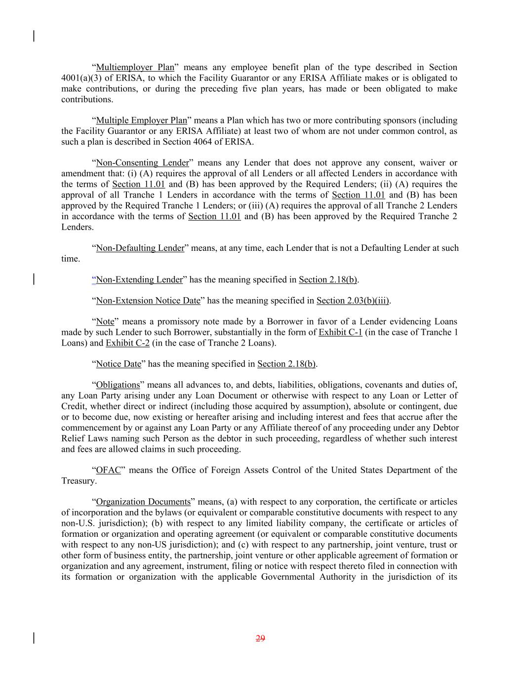 “Multiemployer Plan” means any employee benefit plan of the type described in Section 4001(a)(3) of ERISA, to which the Facility Guarantor or any ERISA Affiliate makes or is obligated to make contributions, or during the preceding five plan years, has made or been obligated to make contributions. “Multiple Employer Plan” means a Plan which has two or more contributing sponsors (including the Facility Guarantor or any ERISA Affiliate) at least two of whom are not under common control, as such a plan is described in Section 4064 of ERISA. “Non-Consenting Lender” means any Lender that does not approve any consent, waiver or amendment that: (i) (A) requires the approval of all Lenders or all affected Lenders in accordance with the terms of Section 11.01 and (B) has been approved by the Required Lenders; (ii) (A) requires the approval of all Tranche 1 Lenders in accordance with the terms of Section 11.01 and (B) has been approved by the Required Tranche 1 Lenders; or (iii) (A) requires the approval of all Tranche 2 Lenders in accordance with the terms of Section 11.01 and (B) has been approved by the Required Tranche 2 Lenders. “Non-Defaulting Lender” means, at any time, each Lender that is not a Defaulting Lender at such time. “Non-Extending Lender” has the meaning specified in Section 2.18(b). “Non-Extension Notice Date” has the meaning specified in Section 2.03(b)(iii). “Note” means a promissory note made by a Borrower in favor of a Lender evidencing Loans made by such Lender to such Borrower, substantially in the form of Exhibit C-1 (in the case of Tranche 1 Loans) and Exhibit C-2 (in the case of Tranche 2 Loans). “Notice Date” has the meaning specified in Section 2.18(b). “Obligations” means all advances to, and debts, liabilities, obligations, covenants and duties of, any Loan Party arising under any Loan Document or otherwise with respect to any Loan or Letter of Credit, whether direct or indirect (including those acquired by assumption), absolute or contingent, due or to become due, now existing or hereafter arising and including interest and fees that accrue after the commencement by or against any Loan Party or any Affiliate thereof of any proceeding under any Debtor Relief Laws naming such Person as the debtor in such proceeding, regardless of whether such interest and fees are allowed claims in such proceeding. “OFAC” means the Office of Foreign Assets Control of the United States Department of the Treasury. “Organization Documents” means, (a) with respect to any corporation, the certificate or articles of incorporation and the bylaws (or equivalent or comparable constitutive documents with respect to any non-U.S. jurisdiction); (b) with respect to any limited liability company, the certificate or articles of formation or organization and operating agreement (or equivalent or comparable constitutive documents with respect to any non-US jurisdiction); and (c) with respect to any partnership, joint venture, trust or other form of business entity, the partnership, joint venture or other applicable agreement of formation or organization and any agreement, instrument, filing or notice with respect thereto filed in connection with its formation or organization with the applicable Governmental Authority in the jurisdiction of its 29