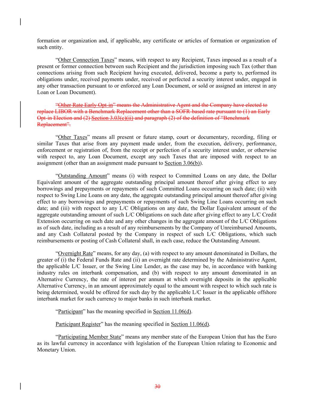 formation or organization and, if applicable, any certificate or articles of formation or organization of such entity. “Other Connection Taxes” means, with respect to any Recipient, Taxes imposed as a result of a present or former connection between such Recipient and the jurisdiction imposing such Tax (other than connections arising from such Recipient having executed, delivered, become a party to, performed its obligations under, received payments under, received or perfected a security interest under, engaged in any other transaction pursuant to or enforced any Loan Document, or sold or assigned an interest in any Loan or Loan Document). “Other Rate Early Opt-in” means the Administrative Agent and the Company have elected to replace LIBOR with a Benchmark Replacement other than a SOFR-based rate pursuant to (1) an Early Opt-in Election and (2) Section 3.03(c)(ii) and paragraph (2) of the definition of “Benchmark Replacement”. “Other Taxes” means all present or future stamp, court or documentary, recording, filing or similar Taxes that arise from any payment made under, from the execution, delivery, performance, enforcement or registration of, from the receipt or perfection of a security interest under, or otherwise with respect to, any Loan Document, except any such Taxes that are imposed with respect to an assignment (other than an assignment made pursuant to Section 3.06(b)). “Outstanding Amount” means (i) with respect to Committed Loans on any date, the Dollar Equivalent amount of the aggregate outstanding principal amount thereof after giving effect to any borrowings and prepayments or repayments of such Committed Loans occurring on such date; (ii) with respect to Swing Line Loans on any date, the aggregate outstanding principal amount thereof after giving effect to any borrowings and prepayments or repayments of such Swing Line Loans occurring on such date; and (iii) with respect to any L/C Obligations on any date, the Dollar Equivalent amount of the aggregate outstanding amount of such L/C Obligations on such date after giving effect to any L/C Credit Extension occurring on such date and any other changes in the aggregate amount of the L/C Obligations as of such date, including as a result of any reimbursements by the Company of Unreimbursed Amounts, and any Cash Collateral posted by the Company in respect of such L/C Obligations, which such reimbursements or posting of Cash Collateral shall, in each case, reduce the Outstanding Amount. “Overnight Rate” means, for any day, (a) with respect to any amount denominated in Dollars, the greater of (i) the Federal Funds Rate and (ii) an overnight rate determined by the Administrative Agent, the applicable L/C Issuer, or the Swing Line Lender, as the case may be, in accordance with banking industry rules on interbank compensation, and (b) with respect to any amount denominated in an Alternative Currency, the rate of interest per annum at which overnight deposits in the applicable Alternative Currency, in an amount approximately equal to the amount with respect to which such rate is being determined, would be offered for such day by the applicable L/C Issuer in the applicable offshore interbank market for such currency to major banks in such interbank market. “Participant” has the meaning specified in Section 11.06(d). Participant Register” has the meaning specified in Section 11.06(d). “Participating Member State” means any member state of the European Union that has the Euro as its lawful currency in accordance with legislation of the European Union relating to Economic and Monetary Union. 30