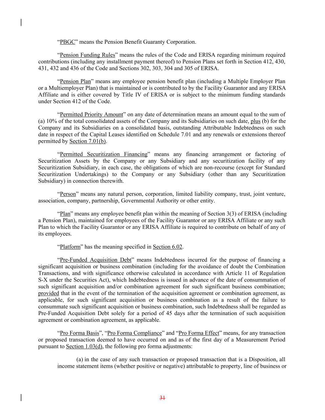 “PBGC” means the Pension Benefit Guaranty Corporation. “Pension Funding Rules” means the rules of the Code and ERISA regarding minimum required contributions (including any installment payment thereof) to Pension Plans set forth in Section 412, 430, 431, 432 and 436 of the Code and Sections 302, 303, 304 and 305 of ERISA. “Pension Plan” means any employee pension benefit plan (including a Multiple Employer Plan or a Multiemployer Plan) that is maintained or is contributed to by the Facility Guarantor and any ERISA Affiliate and is either covered by Title IV of ERISA or is subject to the minimum funding standards under Section 412 of the Code. “Permitted Priority Amount” on any date of determination means an amount equal to the sum of (a) 10% of the total consolidated assets of the Company and its Subsidiaries on such date, plus (b) for the Company and its Subsidiaries on a consolidated basis, outstanding Attributable Indebtedness on such date in respect of the Capital Leases identified on Schedule 7.01 and any renewals or extensions thereof permitted by Section 7.01(b). “Permitted Securitization Financing” means any financing arrangement or factoring of Securitization Assets by the Company or any Subsidiary and any securitization facility of any Securitization Subsidiary, in each case, the obligations of which are non-recourse (except for Standard Securitization Undertakings) to the Company or any Subsidiary (other than any Securitization Subsidiary) in connection therewith. “Person” means any natural person, corporation, limited liability company, trust, joint venture, association, company, partnership, Governmental Authority or other entity. “Plan” means any employee benefit plan within the meaning of Section 3(3) of ERISA (including a Pension Plan), maintained for employees of the Facility Guarantor or any ERISA Affiliate or any such Plan to which the Facility Guarantor or any ERISA Affiliate is required to contribute on behalf of any of its employees. “Platform” has the meaning specified in Section 6.02. “Pre-Funded Acquisition Debt” means Indebtedness incurred for the purpose of financing a significant acquisition or business combination (including for the avoidance of doubt the Combination Transactions, and with significance otherwise calculated in accordance with Article 11 of Regulation S-X under the Securities Act), which Indebtedness is issued in advance of the date of consummation of such significant acquisition and/or combination agreement for such significant business combination; provided that in the event of the termination of the acquisition agreement or combination agreement, as applicable, for such significant acquisition or business combination as a result of the failure to consummate such significant acquisition or business combination, such Indebtedness shall be regarded as Pre-Funded Acquisition Debt solely for a period of 45 days after the termination of such acquisition agreement or combination agreement, as applicable. “Pro Forma Basis”, “Pro Forma Compliance” and “Pro Forma Effect” means, for any transaction or proposed transaction deemed to have occurred on and as of the first day of a Measurement Period pursuant to Section 1.03(d), the following pro forma adjustments: (a) in the case of any such transaction or proposed transaction that is a Disposition, all income statement items (whether positive or negative) attributable to property, line of business or 31