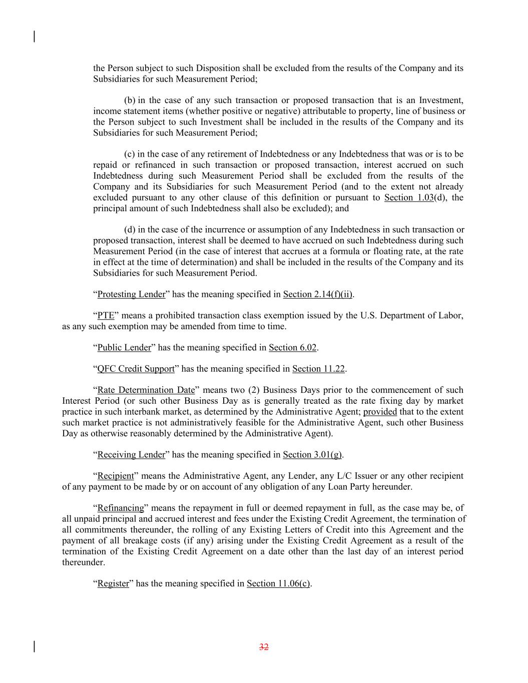 the Person subject to such Disposition shall be excluded from the results of the Company and its Subsidiaries for such Measurement Period; (b) in the case of any such transaction or proposed transaction that is an Investment, income statement items (whether positive or negative) attributable to property, line of business or the Person subject to such Investment shall be included in the results of the Company and its Subsidiaries for such Measurement Period; (c) in the case of any retirement of Indebtedness or any Indebtedness that was or is to be repaid or refinanced in such transaction or proposed transaction, interest accrued on such Indebtedness during such Measurement Period shall be excluded from the results of the Company and its Subsidiaries for such Measurement Period (and to the extent not already excluded pursuant to any other clause of this definition or pursuant to Section 1.03(d), the principal amount of such Indebtedness shall also be excluded); and (d) in the case of the incurrence or assumption of any Indebtedness in such transaction or proposed transaction, interest shall be deemed to have accrued on such Indebtedness during such Measurement Period (in the case of interest that accrues at a formula or floating rate, at the rate in effect at the time of determination) and shall be included in the results of the Company and its Subsidiaries for such Measurement Period. “Protesting Lender” has the meaning specified in Section 2.14(f)(ii). “PTE” means a prohibited transaction class exemption issued by the U.S. Department of Labor, as any such exemption may be amended from time to time. “Public Lender” has the meaning specified in Section 6.02. “QFC Credit Support” has the meaning specified in Section 11.22. “Rate Determination Date” means two (2) Business Days prior to the commencement of such Interest Period (or such other Business Day as is generally treated as the rate fixing day by market practice in such interbank market, as determined by the Administrative Agent; provided that to the extent such market practice is not administratively feasible for the Administrative Agent, such other Business Day as otherwise reasonably determined by the Administrative Agent). “Receiving Lender” has the meaning specified in Section 3.01(g). “Recipient” means the Administrative Agent, any Lender, any L/C Issuer or any other recipient of any payment to be made by or on account of any obligation of any Loan Party hereunder. “Refinancing” means the repayment in full or deemed repayment in full, as the case may be, of all unpaid principal and accrued interest and fees under the Existing Credit Agreement, the termination of all commitments thereunder, the rolling of any Existing Letters of Credit into this Agreement and the payment of all breakage costs (if any) arising under the Existing Credit Agreement as a result of the termination of the Existing Credit Agreement on a date other than the last day of an interest period thereunder. “Register” has the meaning specified in Section 11.06(c). 32