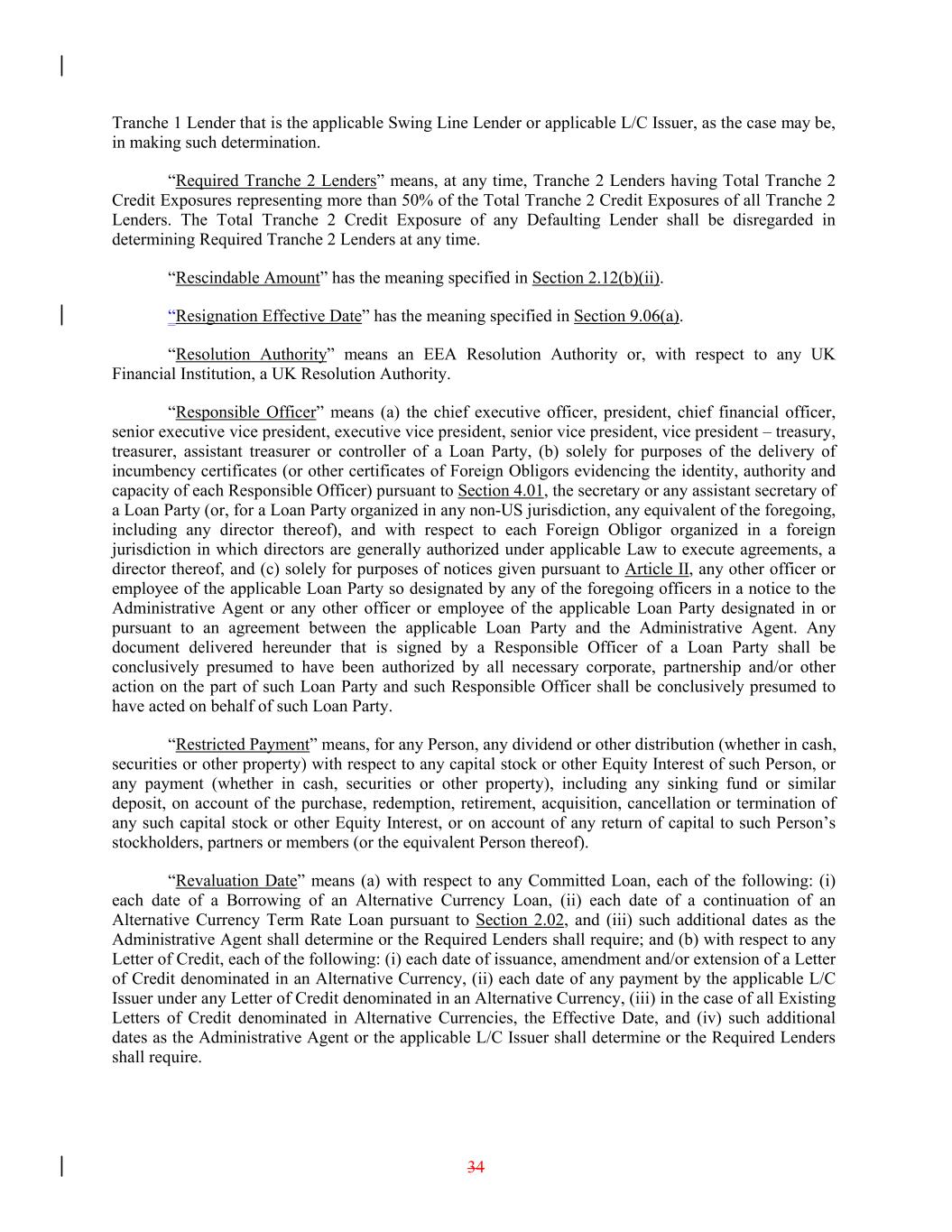 Tranche 1 Lender that is the applicable Swing Line Lender or applicable L/C Issuer, as the case may be, in making such determination. “Required Tranche 2 Lenders” means, at any time, Tranche 2 Lenders having Total Tranche 2 Credit Exposures representing more than 50% of the Total Tranche 2 Credit Exposures of all Tranche 2 Lenders. The Total Tranche 2 Credit Exposure of any Defaulting Lender shall be disregarded in determining Required Tranche 2 Lenders at any time. “Rescindable Amount” has the meaning specified in Section 2.12(b)(ii). “Resignation Effective Date” has the meaning specified in Section 9.06(a). “Resolution Authority” means an EEA Resolution Authority or, with respect to any UK Financial Institution, a UK Resolution Authority. “Responsible Officer” means (a) the chief executive officer, president, chief financial officer, senior executive vice president, executive vice president, senior vice president, vice president – treasury, treasurer, assistant treasurer or controller of a Loan Party, (b) solely for purposes of the delivery of incumbency certificates (or other certificates of Foreign Obligors evidencing the identity, authority and capacity of each Responsible Officer) pursuant to Section 4.01, the secretary or any assistant secretary of a Loan Party (or, for a Loan Party organized in any non-US jurisdiction, any equivalent of the foregoing, including any director thereof), and with respect to each Foreign Obligor organized in a foreign jurisdiction in which directors are generally authorized under applicable Law to execute agreements, a director thereof, and (c) solely for purposes of notices given pursuant to Article II, any other officer or employee of the applicable Loan Party so designated by any of the foregoing officers in a notice to the Administrative Agent or any other officer or employee of the applicable Loan Party designated in or pursuant to an agreement between the applicable Loan Party and the Administrative Agent. Any document delivered hereunder that is signed by a Responsible Officer of a Loan Party shall be conclusively presumed to have been authorized by all necessary corporate, partnership and/or other action on the part of such Loan Party and such Responsible Officer shall be conclusively presumed to have acted on behalf of such Loan Party. “Restricted Payment” means, for any Person, any dividend or other distribution (whether in cash, securities or other property) with respect to any capital stock or other Equity Interest of such Person, or any payment (whether in cash, securities or other property), including any sinking fund or similar deposit, on account of the purchase, redemption, retirement, acquisition, cancellation or termination of any such capital stock or other Equity Interest, or on account of any return of capital to such Person’s stockholders, partners or members (or the equivalent Person thereof). “Revaluation Date” means (a) with respect to any Committed Loan, each of the following: (i) each date of a Borrowing of an Alternative Currency Loan, (ii) each date of a continuation of an Alternative Currency Term Rate Loan pursuant to Section 2.02, and (iii) such additional dates as the Administrative Agent shall determine or the Required Lenders shall require; and (b) with respect to any Letter of Credit, each of the following: (i) each date of issuance, amendment and/or extension of a Letter of Credit denominated in an Alternative Currency, (ii) each date of any payment by the applicable L/C Issuer under any Letter of Credit denominated in an Alternative Currency, (iii) in the case of all Existing Letters of Credit denominated in Alternative Currencies, the Effective Date, and (iv) such additional dates as the Administrative Agent or the applicable L/C Issuer shall determine or the Required Lenders shall require. 34