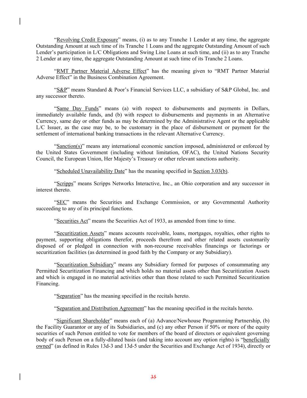“Revolving Credit Exposure” means, (i) as to any Tranche 1 Lender at any time, the aggregate Outstanding Amount at such time of its Tranche 1 Loans and the aggregate Outstanding Amount of such Lender’s participation in L/C Obligations and Swing Line Loans at such time, and (ii) as to any Tranche 2 Lender at any time, the aggregate Outstanding Amount at such time of its Tranche 2 Loans. “RMT Partner Material Adverse Effect” has the meaning given to “RMT Partner Material Adverse Effect” in the Business Combination Agreement. “S&P” means Standard & Poor’s Financial Services LLC, a subsidiary of S&P Global, Inc. and any successor thereto. “Same Day Funds” means (a) with respect to disbursements and payments in Dollars, immediately available funds, and (b) with respect to disbursements and payments in an Alternative Currency, same day or other funds as may be determined by the Administrative Agent or the applicable L/C Issuer, as the case may be, to be customary in the place of disbursement or payment for the settlement of international banking transactions in the relevant Alternative Currency. “Sanction(s)” means any international economic sanction imposed, administered or enforced by the United States Government (including without limitation, OFAC), the United Nations Security Council, the European Union, Her Majesty’s Treasury or other relevant sanctions authority. “Scheduled Unavailability Date” has the meaning specified in Section 3.03(b). “Scripps” means Scripps Networks Interactive, Inc., an Ohio corporation and any successor in interest thereto. “SEC” means the Securities and Exchange Commission, or any Governmental Authority succeeding to any of its principal functions. “Securities Act” means the Securities Act of 1933, as amended from time to time. “Securitization Assets” means accounts receivable, loans, mortgages, royalties, other rights to payment, supporting obligations therefor, proceeds therefrom and other related assets customarily disposed of or pledged in connection with non-recourse receivables financings or factorings or securitization facilities (as determined in good faith by the Company or any Subsidiary). “Securitization Subsidiary” means any Subsidiary formed for purposes of consummating any Permitted Securitization Financing and which holds no material assets other than Securitization Assets and which is engaged in no material activities other than those related to such Permitted Securitization Financing. “Separation” has the meaning specified in the recitals hereto. “Separation and Distribution Agreement” has the meaning specified in the recitals hereto. “Significant Shareholder” means each of (a) Advance/Newhouse Programming Partnership, (b) the Facility Guarantor or any of its Subsidiaries, and (c) any other Person if 50% or more of the equity securities of such Person entitled to vote for members of the board of directors or equivalent governing body of such Person on a fully-diluted basis (and taking into account any option rights) is “beneficially owned” (as defined in Rules 13d-3 and 13d-5 under the Securities and Exchange Act of 1934), directly or 35