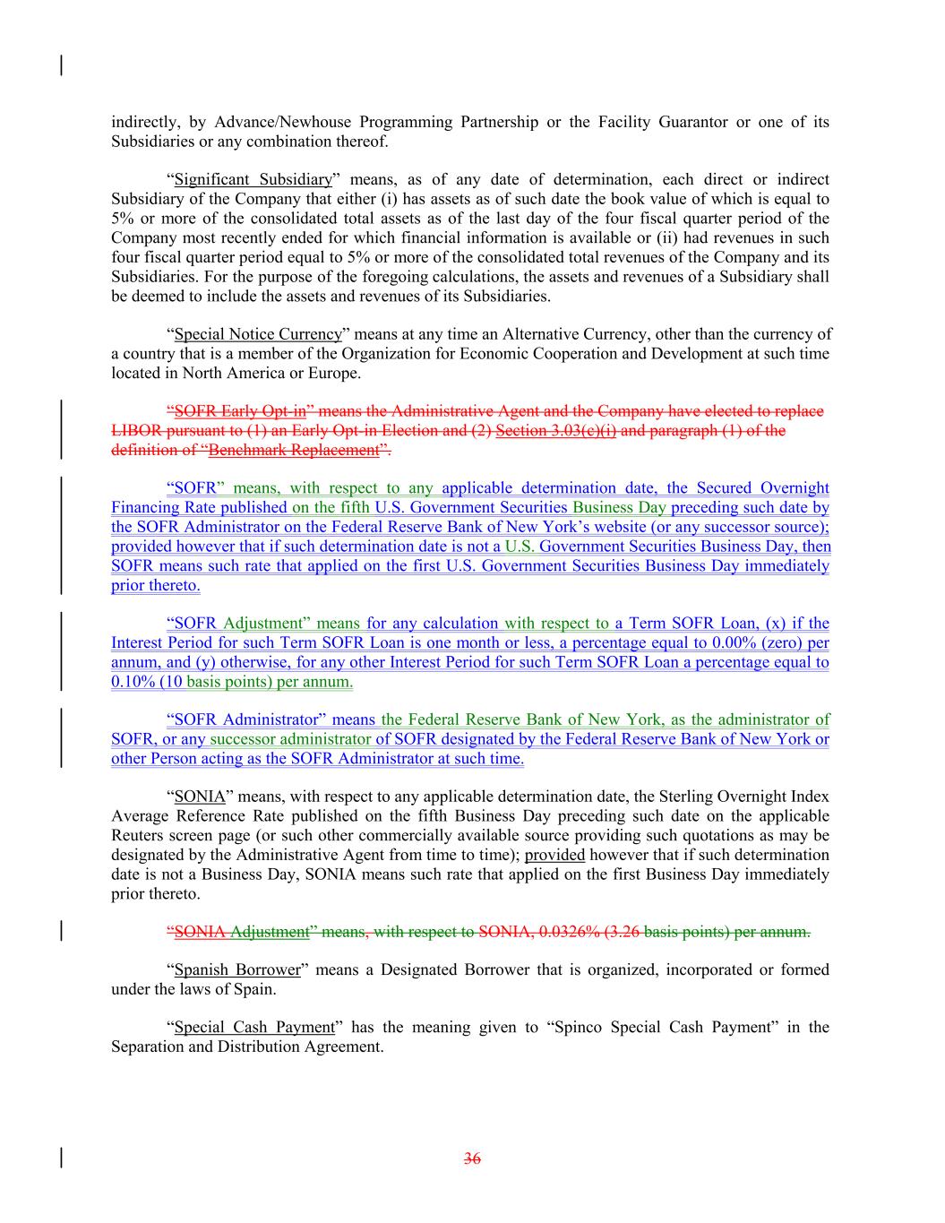 indirectly, by Advance/Newhouse Programming Partnership or the Facility Guarantor or one of its Subsidiaries or any combination thereof. “Significant Subsidiary” means, as of any date of determination, each direct or indirect Subsidiary of the Company that either (i) has assets as of such date the book value of which is equal to 5% or more of the consolidated total assets as of the last day of the four fiscal quarter period of the Company most recently ended for which financial information is available or (ii) had revenues in such four fiscal quarter period equal to 5% or more of the consolidated total revenues of the Company and its Subsidiaries. For the purpose of the foregoing calculations, the assets and revenues of a Subsidiary shall be deemed to include the assets and revenues of its Subsidiaries. “Special Notice Currency” means at any time an Alternative Currency, other than the currency of a country that is a member of the Organization for Economic Cooperation and Development at such time located in North America or Europe. “SOFR Early Opt-in” means the Administrative Agent and the Company have elected to replace LIBOR pursuant to (1) an Early Opt-in Election and (2) Section 3.03(c)(i) and paragraph (1) of the definition of “Benchmark Replacement”. “SOFR” means, with respect to any applicable determination date, the Secured Overnight Financing Rate published on the fifth U.S. Government Securities Business Day preceding such date by the SOFR Administrator on the Federal Reserve Bank of New York’s website (or any successor source); provided however that if such determination date is not a U.S. Government Securities Business Day, then SOFR means such rate that applied on the first U.S. Government Securities Business Day immediately prior thereto. “SOFR Adjustment” means for any calculation with respect to a Term SOFR Loan, (x) if the Interest Period for such Term SOFR Loan is one month or less, a percentage equal to 0.00% (zero) per annum, and (y) otherwise, for any other Interest Period for such Term SOFR Loan a percentage equal to 0.10% (10 basis points) per annum. “SOFR Administrator” means the Federal Reserve Bank of New York, as the administrator of SOFR, or any successor administrator of SOFR designated by the Federal Reserve Bank of New York or other Person acting as the SOFR Administrator at such time. “SONIA” means, with respect to any applicable determination date, the Sterling Overnight Index Average Reference Rate published on the fifth Business Day preceding such date on the applicable Reuters screen page (or such other commercially available source providing such quotations as may be designated by the Administrative Agent from time to time); provided however that if such determination date is not a Business Day, SONIA means such rate that applied on the first Business Day immediately prior thereto. “SONIA Adjustment” means, with respect to SONIA, 0.0326% (3.26 basis points) per annum. “Spanish Borrower” means a Designated Borrower that is organized, incorporated or formed under the laws of Spain. “Special Cash Payment” has the meaning given to “Spinco Special Cash Payment” in the Separation and Distribution Agreement. 36