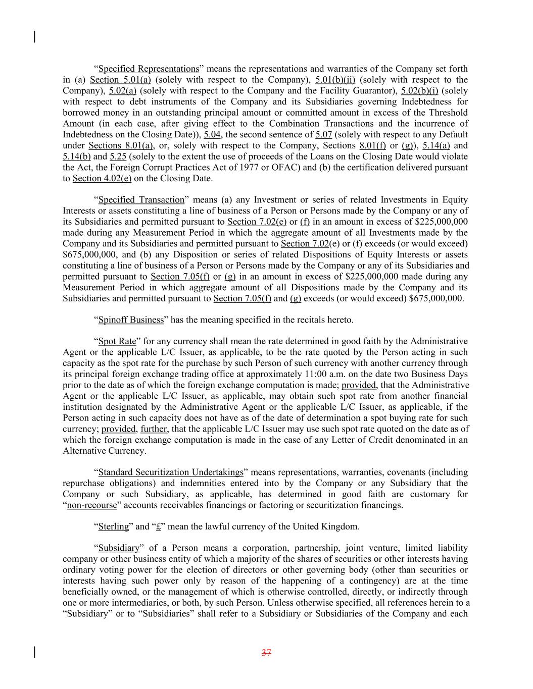 “Specified Representations” means the representations and warranties of the Company set forth in (a) Section 5.01(a) (solely with respect to the Company), 5.01(b)(ii) (solely with respect to the Company), 5.02(a) (solely with respect to the Company and the Facility Guarantor), 5.02(b)(i) (solely with respect to debt instruments of the Company and its Subsidiaries governing Indebtedness for borrowed money in an outstanding principal amount or committed amount in excess of the Threshold Amount (in each case, after giving effect to the Combination Transactions and the incurrence of Indebtedness on the Closing Date)), 5.04, the second sentence of 5.07 (solely with respect to any Default under Sections 8.01(a), or, solely with respect to the Company, Sections 8.01(f) or (g)), 5.14(a) and 5.14(b) and 5.25 (solely to the extent the use of proceeds of the Loans on the Closing Date would violate the Act, the Foreign Corrupt Practices Act of 1977 or OFAC) and (b) the certification delivered pursuant to Section 4.02(e) on the Closing Date. “Specified Transaction” means (a) any Investment or series of related Investments in Equity Interests or assets constituting a line of business of a Person or Persons made by the Company or any of its Subsidiaries and permitted pursuant to Section 7.02(e) or (f) in an amount in excess of $225,000,000 made during any Measurement Period in which the aggregate amount of all Investments made by the Company and its Subsidiaries and permitted pursuant to Section 7.02(e) or (f) exceeds (or would exceed) $675,000,000, and (b) any Disposition or series of related Dispositions of Equity Interests or assets constituting a line of business of a Person or Persons made by the Company or any of its Subsidiaries and permitted pursuant to Section 7.05(f) or (g) in an amount in excess of $225,000,000 made during any Measurement Period in which aggregate amount of all Dispositions made by the Company and its Subsidiaries and permitted pursuant to Section 7.05(f) and (g) exceeds (or would exceed) $675,000,000. “Spinoff Business” has the meaning specified in the recitals hereto. “Spot Rate” for any currency shall mean the rate determined in good faith by the Administrative Agent or the applicable L/C Issuer, as applicable, to be the rate quoted by the Person acting in such capacity as the spot rate for the purchase by such Person of such currency with another currency through its principal foreign exchange trading office at approximately 11:00 a.m. on the date two Business Days prior to the date as of which the foreign exchange computation is made; provided, that the Administrative Agent or the applicable L/C Issuer, as applicable, may obtain such spot rate from another financial institution designated by the Administrative Agent or the applicable L/C Issuer, as applicable, if the Person acting in such capacity does not have as of the date of determination a spot buying rate for such currency; provided, further, that the applicable L/C Issuer may use such spot rate quoted on the date as of which the foreign exchange computation is made in the case of any Letter of Credit denominated in an Alternative Currency. “Standard Securitization Undertakings” means representations, warranties, covenants (including repurchase obligations) and indemnities entered into by the Company or any Subsidiary that the Company or such Subsidiary, as applicable, has determined in good faith are customary for “non-recourse” accounts receivables financings or factoring or securitization financings. “Sterling” and “£” mean the lawful currency of the United Kingdom. “Subsidiary” of a Person means a corporation, partnership, joint venture, limited liability company or other business entity of which a majority of the shares of securities or other interests having ordinary voting power for the election of directors or other governing body (other than securities or interests having such power only by reason of the happening of a contingency) are at the time beneficially owned, or the management of which is otherwise controlled, directly, or indirectly through one or more intermediaries, or both, by such Person. Unless otherwise specified, all references herein to a “Subsidiary” or to “Subsidiaries” shall refer to a Subsidiary or Subsidiaries of the Company and each 37