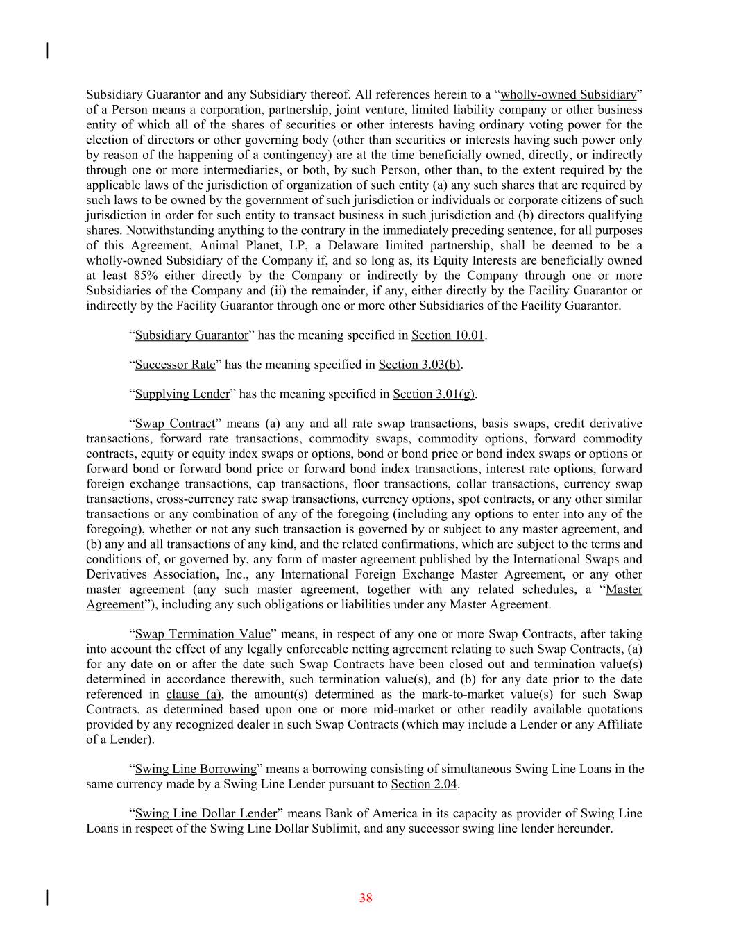 Subsidiary Guarantor and any Subsidiary thereof. All references herein to a “wholly-owned Subsidiary” of a Person means a corporation, partnership, joint venture, limited liability company or other business entity of which all of the shares of securities or other interests having ordinary voting power for the election of directors or other governing body (other than securities or interests having such power only by reason of the happening of a contingency) are at the time beneficially owned, directly, or indirectly through one or more intermediaries, or both, by such Person, other than, to the extent required by the applicable laws of the jurisdiction of organization of such entity (a) any such shares that are required by such laws to be owned by the government of such jurisdiction or individuals or corporate citizens of such jurisdiction in order for such entity to transact business in such jurisdiction and (b) directors qualifying shares. Notwithstanding anything to the contrary in the immediately preceding sentence, for all purposes of this Agreement, Animal Planet, LP, a Delaware limited partnership, shall be deemed to be a wholly-owned Subsidiary of the Company if, and so long as, its Equity Interests are beneficially owned at least 85% either directly by the Company or indirectly by the Company through one or more Subsidiaries of the Company and (ii) the remainder, if any, either directly by the Facility Guarantor or indirectly by the Facility Guarantor through one or more other Subsidiaries of the Facility Guarantor. “Subsidiary Guarantor” has the meaning specified in Section 10.01. “Successor Rate” has the meaning specified in Section 3.03(b). “Supplying Lender” has the meaning specified in Section 3.01(g). “Swap Contract” means (a) any and all rate swap transactions, basis swaps, credit derivative transactions, forward rate transactions, commodity swaps, commodity options, forward commodity contracts, equity or equity index swaps or options, bond or bond price or bond index swaps or options or forward bond or forward bond price or forward bond index transactions, interest rate options, forward foreign exchange transactions, cap transactions, floor transactions, collar transactions, currency swap transactions, cross-currency rate swap transactions, currency options, spot contracts, or any other similar transactions or any combination of any of the foregoing (including any options to enter into any of the foregoing), whether or not any such transaction is governed by or subject to any master agreement, and (b) any and all transactions of any kind, and the related confirmations, which are subject to the terms and conditions of, or governed by, any form of master agreement published by the International Swaps and Derivatives Association, Inc., any International Foreign Exchange Master Agreement, or any other master agreement (any such master agreement, together with any related schedules, a “Master Agreement”), including any such obligations or liabilities under any Master Agreement. “Swap Termination Value” means, in respect of any one or more Swap Contracts, after taking into account the effect of any legally enforceable netting agreement relating to such Swap Contracts, (a) for any date on or after the date such Swap Contracts have been closed out and termination value(s) determined in accordance therewith, such termination value(s), and (b) for any date prior to the date referenced in clause (a), the amount(s) determined as the mark-to-market value(s) for such Swap Contracts, as determined based upon one or more mid-market or other readily available quotations provided by any recognized dealer in such Swap Contracts (which may include a Lender or any Affiliate of a Lender). “Swing Line Borrowing” means a borrowing consisting of simultaneous Swing Line Loans in the same currency made by a Swing Line Lender pursuant to Section 2.04. “Swing Line Dollar Lender” means Bank of America in its capacity as provider of Swing Line Loans in respect of the Swing Line Dollar Sublimit, and any successor swing line lender hereunder. 38