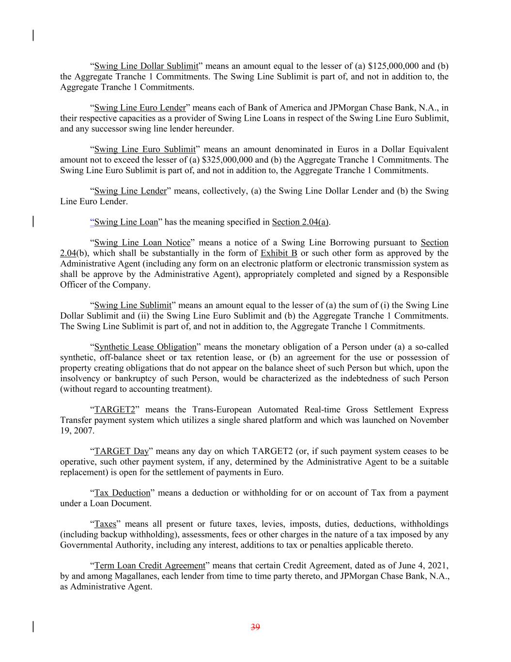 “Swing Line Dollar Sublimit” means an amount equal to the lesser of (a) $125,000,000 and (b) the Aggregate Tranche 1 Commitments. The Swing Line Sublimit is part of, and not in addition to, the Aggregate Tranche 1 Commitments. “Swing Line Euro Lender” means each of Bank of America and JPMorgan Chase Bank, N.A., in their respective capacities as a provider of Swing Line Loans in respect of the Swing Line Euro Sublimit, and any successor swing line lender hereunder. “Swing Line Euro Sublimit” means an amount denominated in Euros in a Dollar Equivalent amount not to exceed the lesser of (a) $325,000,000 and (b) the Aggregate Tranche 1 Commitments. The Swing Line Euro Sublimit is part of, and not in addition to, the Aggregate Tranche 1 Commitments. “Swing Line Lender” means, collectively, (a) the Swing Line Dollar Lender and (b) the Swing Line Euro Lender. “Swing Line Loan” has the meaning specified in Section 2.04(a). “Swing Line Loan Notice” means a notice of a Swing Line Borrowing pursuant to Section 2.04(b), which shall be substantially in the form of Exhibit B or such other form as approved by the Administrative Agent (including any form on an electronic platform or electronic transmission system as shall be approve by the Administrative Agent), appropriately completed and signed by a Responsible Officer of the Company. “Swing Line Sublimit” means an amount equal to the lesser of (a) the sum of (i) the Swing Line Dollar Sublimit and (ii) the Swing Line Euro Sublimit and (b) the Aggregate Tranche 1 Commitments. The Swing Line Sublimit is part of, and not in addition to, the Aggregate Tranche 1 Commitments. “Synthetic Lease Obligation” means the monetary obligation of a Person under (a) a so-called synthetic, off-balance sheet or tax retention lease, or (b) an agreement for the use or possession of property creating obligations that do not appear on the balance sheet of such Person but which, upon the insolvency or bankruptcy of such Person, would be characterized as the indebtedness of such Person (without regard to accounting treatment). “TARGET2” means the Trans-European Automated Real-time Gross Settlement Express Transfer payment system which utilizes a single shared platform and which was launched on November 19, 2007. “TARGET Day” means any day on which TARGET2 (or, if such payment system ceases to be operative, such other payment system, if any, determined by the Administrative Agent to be a suitable replacement) is open for the settlement of payments in Euro. “Tax Deduction” means a deduction or withholding for or on account of Tax from a payment under a Loan Document. “Taxes” means all present or future taxes, levies, imposts, duties, deductions, withholdings (including backup withholding), assessments, fees or other charges in the nature of a tax imposed by any Governmental Authority, including any interest, additions to tax or penalties applicable thereto. “Term Loan Credit Agreement” means that certain Credit Agreement, dated as of June 4, 2021, by and among Magallanes, each lender from time to time party thereto, and JPMorgan Chase Bank, N.A., as Administrative Agent. 39