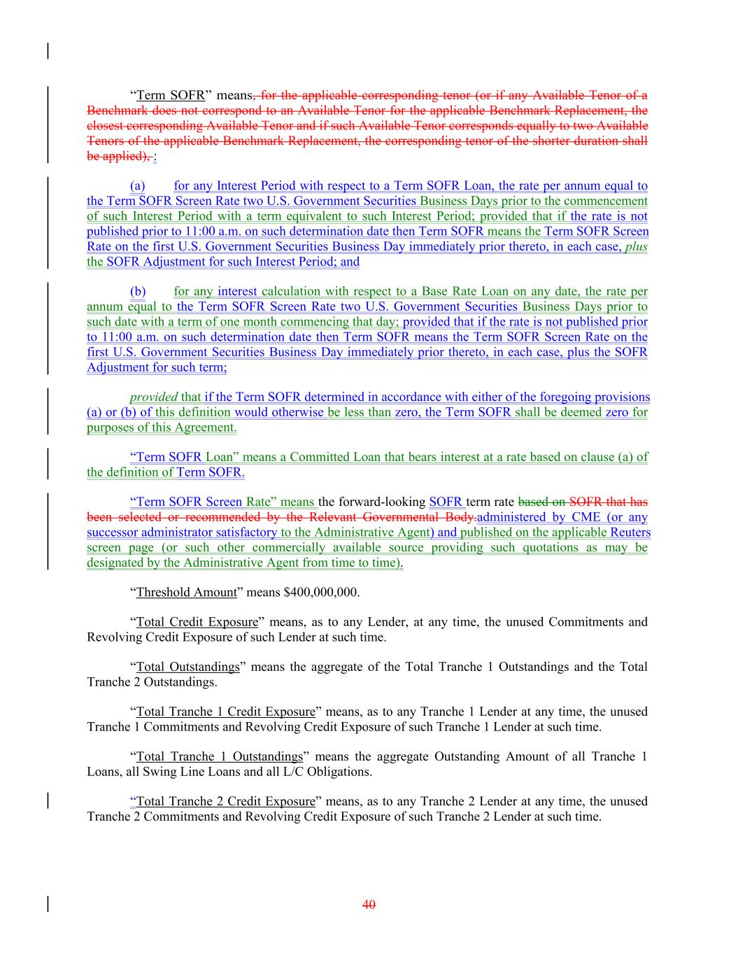 “Term SOFR” means, for the applicable corresponding tenor (or if any Available Tenor of a Benchmark does not correspond to an Available Tenor for the applicable Benchmark Replacement, the closest corresponding Available Tenor and if such Available Tenor corresponds equally to two Available Tenors of the applicable Benchmark Replacement, the corresponding tenor of the shorter duration shall be applied), : (a) for any Interest Period with respect to a Term SOFR Loan, the rate per annum equal to the Term SOFR Screen Rate two U.S. Government Securities Business Days prior to the commencement of such Interest Period with a term equivalent to such Interest Period; provided that if the rate is not published prior to 11:00 a.m. on such determination date then Term SOFR means the Term SOFR Screen Rate on the first U.S. Government Securities Business Day immediately prior thereto, in each case, plus the SOFR Adjustment for such Interest Period; and (b) for any interest calculation with respect to a Base Rate Loan on any date, the rate per annum equal to the Term SOFR Screen Rate two U.S. Government Securities Business Days prior to such date with a term of one month commencing that day; provided that if the rate is not published prior to 11:00 a.m. on such determination date then Term SOFR means the Term SOFR Screen Rate on the first U.S. Government Securities Business Day immediately prior thereto, in each case, plus the SOFR Adjustment for such term; provided that if the Term SOFR determined in accordance with either of the foregoing provisions (a) or (b) of this definition would otherwise be less than zero, the Term SOFR shall be deemed zero for purposes of this Agreement. “Term SOFR Loan” means a Committed Loan that bears interest at a rate based on clause (a) of the definition of Term SOFR. “Term SOFR Screen Rate” means the forward-looking SOFR term rate based on SOFR that has been selected or recommended by the Relevant Governmental Body.administered by CME (or any successor administrator satisfactory to the Administrative Agent) and published on the applicable Reuters screen page (or such other commercially available source providing such quotations as may be designated by the Administrative Agent from time to time). “Threshold Amount” means $400,000,000. “Total Credit Exposure” means, as to any Lender, at any time, the unused Commitments and Revolving Credit Exposure of such Lender at such time. “Total Outstandings” means the aggregate of the Total Tranche 1 Outstandings and the Total Tranche 2 Outstandings. “Total Tranche 1 Credit Exposure” means, as to any Tranche 1 Lender at any time, the unused Tranche 1 Commitments and Revolving Credit Exposure of such Tranche 1 Lender at such time. “Total Tranche 1 Outstandings” means the aggregate Outstanding Amount of all Tranche 1 Loans, all Swing Line Loans and all L/C Obligations. “Total Tranche 2 Credit Exposure” means, as to any Tranche 2 Lender at any time, the unused Tranche 2 Commitments and Revolving Credit Exposure of such Tranche 2 Lender at such time. 40