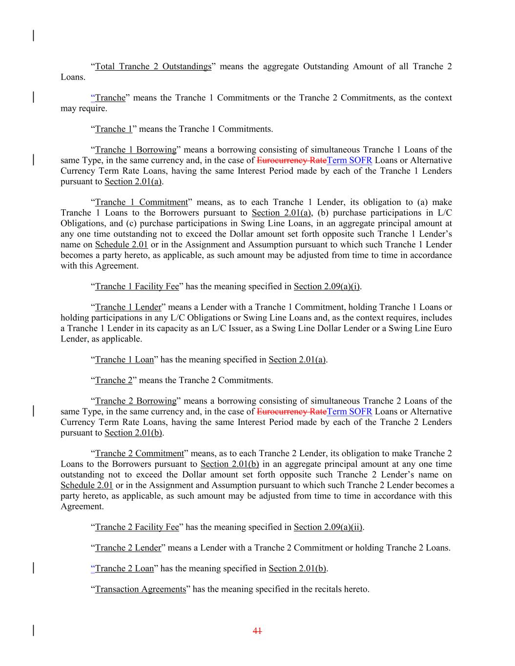 “Total Tranche 2 Outstandings” means the aggregate Outstanding Amount of all Tranche 2 Loans. “Tranche” means the Tranche 1 Commitments or the Tranche 2 Commitments, as the context may require. “Tranche 1” means the Tranche 1 Commitments. “Tranche 1 Borrowing” means a borrowing consisting of simultaneous Tranche 1 Loans of the same Type, in the same currency and, in the case of Eurocurrency RateTerm SOFR Loans or Alternative Currency Term Rate Loans, having the same Interest Period made by each of the Tranche 1 Lenders pursuant to Section 2.01(a). “Tranche 1 Commitment” means, as to each Tranche 1 Lender, its obligation to (a) make Tranche 1 Loans to the Borrowers pursuant to Section 2.01(a), (b) purchase participations in L/C Obligations, and (c) purchase participations in Swing Line Loans, in an aggregate principal amount at any one time outstanding not to exceed the Dollar amount set forth opposite such Tranche 1 Lender’s name on Schedule 2.01 or in the Assignment and Assumption pursuant to which such Tranche 1 Lender becomes a party hereto, as applicable, as such amount may be adjusted from time to time in accordance with this Agreement. “Tranche 1 Facility Fee” has the meaning specified in Section 2.09(a)(i). “Tranche 1 Lender” means a Lender with a Tranche 1 Commitment, holding Tranche 1 Loans or holding participations in any L/C Obligations or Swing Line Loans and, as the context requires, includes a Tranche 1 Lender in its capacity as an L/C Issuer, as a Swing Line Dollar Lender or a Swing Line Euro Lender, as applicable. “Tranche 1 Loan” has the meaning specified in Section 2.01(a). “Tranche 2” means the Tranche 2 Commitments. “Tranche 2 Borrowing” means a borrowing consisting of simultaneous Tranche 2 Loans of the same Type, in the same currency and, in the case of Eurocurrency RateTerm SOFR Loans or Alternative Currency Term Rate Loans, having the same Interest Period made by each of the Tranche 2 Lenders pursuant to Section 2.01(b). “Tranche 2 Commitment” means, as to each Tranche 2 Lender, its obligation to make Tranche 2 Loans to the Borrowers pursuant to Section 2.01(b) in an aggregate principal amount at any one time outstanding not to exceed the Dollar amount set forth opposite such Tranche 2 Lender’s name on Schedule 2.01 or in the Assignment and Assumption pursuant to which such Tranche 2 Lender becomes a party hereto, as applicable, as such amount may be adjusted from time to time in accordance with this Agreement. “Tranche 2 Facility Fee” has the meaning specified in Section 2.09(a)(ii). “Tranche 2 Lender” means a Lender with a Tranche 2 Commitment or holding Tranche 2 Loans. “Tranche 2 Loan” has the meaning specified in Section 2.01(b). “Transaction Agreements” has the meaning specified in the recitals hereto. 41