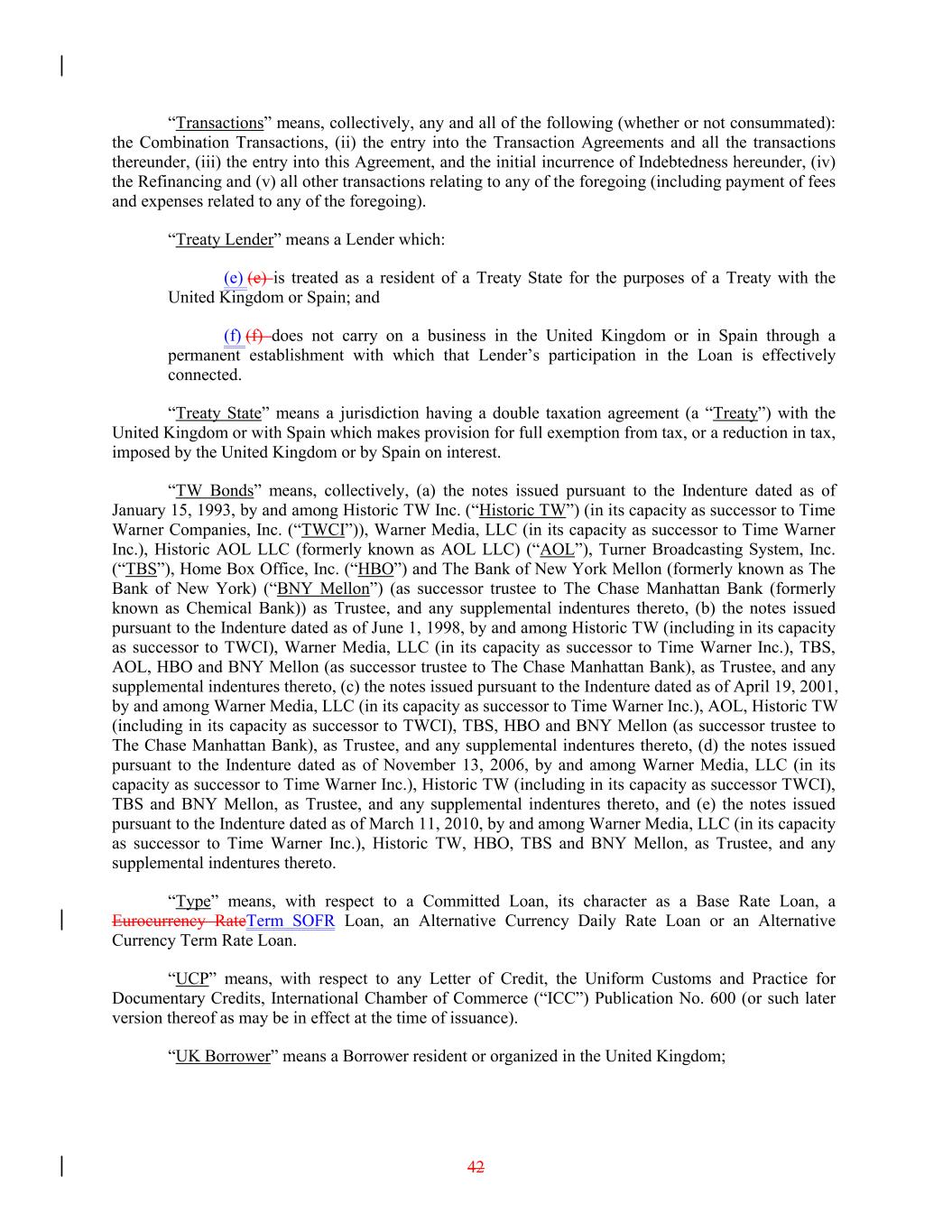 “Transactions” means, collectively, any and all of the following (whether or not consummated): the Combination Transactions, (ii) the entry into the Transaction Agreements and all the transactions thereunder, (iii) the entry into this Agreement, and the initial incurrence of Indebtedness hereunder, (iv) the Refinancing and (v) all other transactions relating to any of the foregoing (including payment of fees and expenses related to any of the foregoing). “Treaty Lender” means a Lender which: (e) (e) is treated as a resident of a Treaty State for the purposes of a Treaty with the United Kingdom or Spain; and (f) (f) does not carry on a business in the United Kingdom or in Spain through a permanent establishment with which that Lender’s participation in the Loan is effectively connected. “Treaty State” means a jurisdiction having a double taxation agreement (a “Treaty”) with the United Kingdom or with Spain which makes provision for full exemption from tax, or a reduction in tax, imposed by the United Kingdom or by Spain on interest. “TW Bonds” means, collectively, (a) the notes issued pursuant to the Indenture dated as of January 15, 1993, by and among Historic TW Inc. (“Historic TW”) (in its capacity as successor to Time Warner Companies, Inc. (“TWCI”)), Warner Media, LLC (in its capacity as successor to Time Warner Inc.), Historic AOL LLC (formerly known as AOL LLC) (“AOL”), Turner Broadcasting System, Inc. (“TBS”), Home Box Office, Inc. (“HBO”) and The Bank of New York Mellon (formerly known as The Bank of New York) (“BNY Mellon”) (as successor trustee to The Chase Manhattan Bank (formerly known as Chemical Bank)) as Trustee, and any supplemental indentures thereto, (b) the notes issued pursuant to the Indenture dated as of June 1, 1998, by and among Historic TW (including in its capacity as successor to TWCI), Warner Media, LLC (in its capacity as successor to Time Warner Inc.), TBS, AOL, HBO and BNY Mellon (as successor trustee to The Chase Manhattan Bank), as Trustee, and any supplemental indentures thereto, (c) the notes issued pursuant to the Indenture dated as of April 19, 2001, by and among Warner Media, LLC (in its capacity as successor to Time Warner Inc.), AOL, Historic TW (including in its capacity as successor to TWCI), TBS, HBO and BNY Mellon (as successor trustee to The Chase Manhattan Bank), as Trustee, and any supplemental indentures thereto, (d) the notes issued pursuant to the Indenture dated as of November 13, 2006, by and among Warner Media, LLC (in its capacity as successor to Time Warner Inc.), Historic TW (including in its capacity as successor TWCI), TBS and BNY Mellon, as Trustee, and any supplemental indentures thereto, and (e) the notes issued pursuant to the Indenture dated as of March 11, 2010, by and among Warner Media, LLC (in its capacity as successor to Time Warner Inc.), Historic TW, HBO, TBS and BNY Mellon, as Trustee, and any supplemental indentures thereto. “Type” means, with respect to a Committed Loan, its character as a Base Rate Loan, a Eurocurrency RateTerm SOFR Loan, an Alternative Currency Daily Rate Loan or an Alternative Currency Term Rate Loan. “UCP” means, with respect to any Letter of Credit, the Uniform Customs and Practice for Documentary Credits, International Chamber of Commerce (“ICC”) Publication No. 600 (or such later version thereof as may be in effect at the time of issuance). “UK Borrower” means a Borrower resident or organized in the United Kingdom; 42