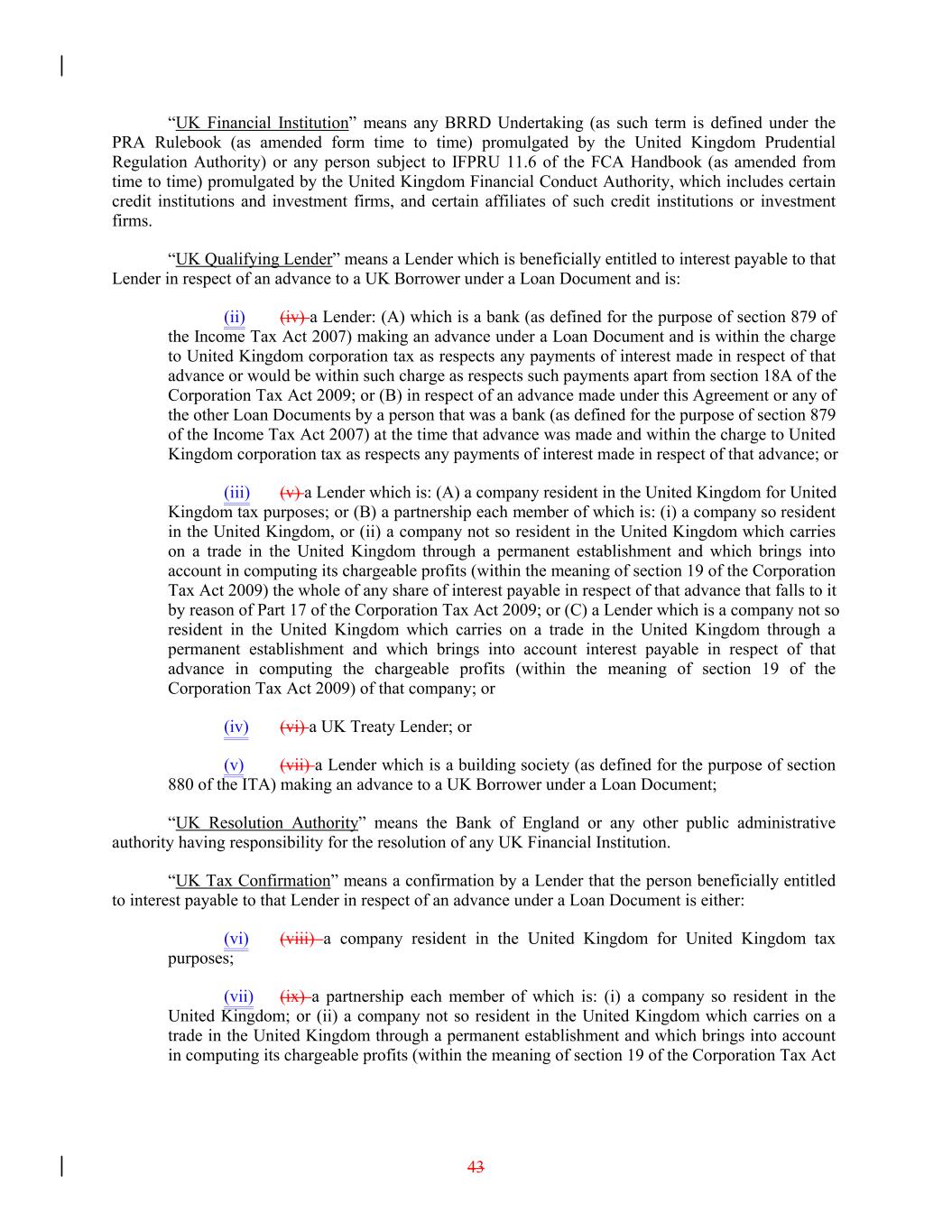 “UK Financial Institution” means any BRRD Undertaking (as such term is defined under the PRA Rulebook (as amended form time to time) promulgated by the United Kingdom Prudential Regulation Authority) or any person subject to IFPRU 11.6 of the FCA Handbook (as amended from time to time) promulgated by the United Kingdom Financial Conduct Authority, which includes certain credit institutions and investment firms, and certain affiliates of such credit institutions or investment firms. “UK Qualifying Lender” means a Lender which is beneficially entitled to interest payable to that Lender in respect of an advance to a UK Borrower under a Loan Document and is: (ii) (iv) a Lender: (A) which is a bank (as defined for the purpose of section 879 of the Income Tax Act 2007) making an advance under a Loan Document and is within the charge to United Kingdom corporation tax as respects any payments of interest made in respect of that advance or would be within such charge as respects such payments apart from section 18A of the Corporation Tax Act 2009; or (B) in respect of an advance made under this Agreement or any of the other Loan Documents by a person that was a bank (as defined for the purpose of section 879 of the Income Tax Act 2007) at the time that advance was made and within the charge to United Kingdom corporation tax as respects any payments of interest made in respect of that advance; or (iii) (v) a Lender which is: (A) a company resident in the United Kingdom for United Kingdom tax purposes; or (B) a partnership each member of which is: (i) a company so resident in the United Kingdom, or (ii) a company not so resident in the United Kingdom which carries on a trade in the United Kingdom through a permanent establishment and which brings into account in computing its chargeable profits (within the meaning of section 19 of the Corporation Tax Act 2009) the whole of any share of interest payable in respect of that advance that falls to it by reason of Part 17 of the Corporation Tax Act 2009; or (C) a Lender which is a company not so resident in the United Kingdom which carries on a trade in the United Kingdom through a permanent establishment and which brings into account interest payable in respect of that advance in computing the chargeable profits (within the meaning of section 19 of the Corporation Tax Act 2009) of that company; or (iv) (vi) a UK Treaty Lender; or (v) (vii) a Lender which is a building society (as defined for the purpose of section 880 of the ITA) making an advance to a UK Borrower under a Loan Document; “UK Resolution Authority” means the Bank of England or any other public administrative authority having responsibility for the resolution of any UK Financial Institution. “UK Tax Confirmation” means a confirmation by a Lender that the person beneficially entitled to interest payable to that Lender in respect of an advance under a Loan Document is either: (vi) (viii) a company resident in the United Kingdom for United Kingdom tax purposes; (vii) (ix) a partnership each member of which is: (i) a company so resident in the United Kingdom; or (ii) a company not so resident in the United Kingdom which carries on a trade in the United Kingdom through a permanent establishment and which brings into account in computing its chargeable profits (within the meaning of section 19 of the Corporation Tax Act 43