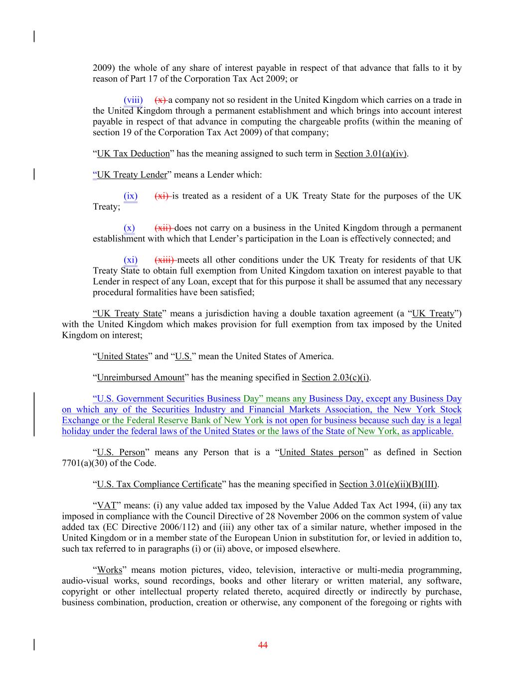 2009) the whole of any share of interest payable in respect of that advance that falls to it by reason of Part 17 of the Corporation Tax Act 2009; or (viii) (x) a company not so resident in the United Kingdom which carries on a trade in the United Kingdom through a permanent establishment and which brings into account interest payable in respect of that advance in computing the chargeable profits (within the meaning of section 19 of the Corporation Tax Act 2009) of that company; “UK Tax Deduction” has the meaning assigned to such term in Section 3.01(a)(iv). “UK Treaty Lender” means a Lender which: (ix) (xi) is treated as a resident of a UK Treaty State for the purposes of the UK Treaty; (x) (xii) does not carry on a business in the United Kingdom through a permanent establishment with which that Lender’s participation in the Loan is effectively connected; and (xi) (xiii) meets all other conditions under the UK Treaty for residents of that UK Treaty State to obtain full exemption from United Kingdom taxation on interest payable to that Lender in respect of any Loan, except that for this purpose it shall be assumed that any necessary procedural formalities have been satisfied; “UK Treaty State” means a jurisdiction having a double taxation agreement (a “UK Treaty”) with the United Kingdom which makes provision for full exemption from tax imposed by the United Kingdom on interest; “United States” and “U.S.” mean the United States of America. “Unreimbursed Amount” has the meaning specified in Section 2.03(c)(i). “U.S. Government Securities Business Day” means any Business Day, except any Business Day on which any of the Securities Industry and Financial Markets Association, the New York Stock Exchange or the Federal Reserve Bank of New York is not open for business because such day is a legal holiday under the federal laws of the United States or the laws of the State of New York, as applicable. “U.S. Person” means any Person that is a “United States person” as defined in Section 7701(a)(30) of the Code. “U.S. Tax Compliance Certificate” has the meaning specified in Section 3.01(e)(ii)(B)(III). “VAT” means: (i) any value added tax imposed by the Value Added Tax Act 1994, (ii) any tax imposed in compliance with the Council Directive of 28 November 2006 on the common system of value added tax (EC Directive 2006/112) and (iii) any other tax of a similar nature, whether imposed in the United Kingdom or in a member state of the European Union in substitution for, or levied in addition to, such tax referred to in paragraphs (i) or (ii) above, or imposed elsewhere. “Works” means motion pictures, video, television, interactive or multi-media programming, audio-visual works, sound recordings, books and other literary or written material, any software, copyright or other intellectual property related thereto, acquired directly or indirectly by purchase, business combination, production, creation or otherwise, any component of the foregoing or rights with 44