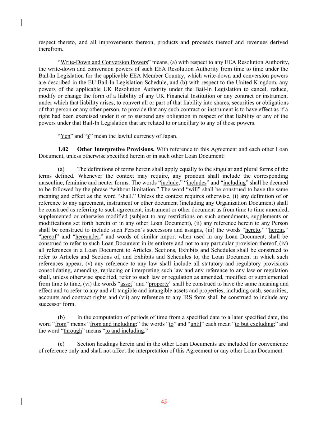 respect thereto, and all improvements thereon, products and proceeds thereof and revenues derived therefrom. “Write-Down and Conversion Powers” means, (a) with respect to any EEA Resolution Authority, the write-down and conversion powers of such EEA Resolution Authority from time to time under the Bail-In Legislation for the applicable EEA Member Country, which write-down and conversion powers are described in the EU Bail-In Legislation Schedule, and (b) with respect to the United Kingdom, any powers of the applicable UK Resolution Authority under the Bail-In Legislation to cancel, reduce, modify or change the form of a liability of any UK Financial Institution or any contract or instrument under which that liability arises, to convert all or part of that liability into shares, securities or obligations of that person or any other person, to provide that any such contract or instrument is to have effect as if a right had been exercised under it or to suspend any obligation in respect of that liability or any of the powers under that Bail-In Legislation that are related to or ancillary to any of those powers. “Yen” and “¥” mean the lawful currency of Japan. 1.02 Other Interpretive Provisions. With reference to this Agreement and each other Loan Document, unless otherwise specified herein or in such other Loan Document: (a) The definitions of terms herein shall apply equally to the singular and plural forms of the terms defined. Whenever the context may require, any pronoun shall include the corresponding masculine, feminine and neuter forms. The words “include,” “includes” and “including” shall be deemed to be followed by the phrase “without limitation.” The word “will” shall be construed to have the same meaning and effect as the word “shall.” Unless the context requires otherwise, (i) any definition of or reference to any agreement, instrument or other document (including any Organization Document) shall be construed as referring to such agreement, instrument or other document as from time to time amended, supplemented or otherwise modified (subject to any restrictions on such amendments, supplements or modifications set forth herein or in any other Loan Document), (ii) any reference herein to any Person shall be construed to include such Person’s successors and assigns, (iii) the words “hereto,” “herein,” “hereof” and “hereunder,” and words of similar import when used in any Loan Document, shall be construed to refer to such Loan Document in its entirety and not to any particular provision thereof, (iv) all references in a Loan Document to Articles, Sections, Exhibits and Schedules shall be construed to refer to Articles and Sections of, and Exhibits and Schedules to, the Loan Document in which such references appear, (v) any reference to any law shall include all statutory and regulatory provisions consolidating, amending, replacing or interpreting such law and any reference to any law or regulation shall, unless otherwise specified, refer to such law or regulation as amended, modified or supplemented from time to time, (vi) the words “asset” and “property” shall be construed to have the same meaning and effect and to refer to any and all tangible and intangible assets and properties, including cash, securities, accounts and contract rights and (vii) any reference to any IRS form shall be construed to include any successor form. (b) In the computation of periods of time from a specified date to a later specified date, the word “from” means “from and including;” the words “to” and “until” each mean “to but excluding;” and the word “through” means “to and including.” (c) Section headings herein and in the other Loan Documents are included for convenience of reference only and shall not affect the interpretation of this Agreement or any other Loan Document. 45