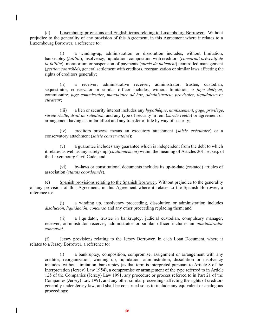 (d) Luxembourg provisions and English terms relating to Luxembourg Borrowers. Without prejudice to the generality of any provision of this Agreement, in this Agreement where it relates to a Luxembourg Borrower, a reference to: (i) a winding-up, administration or dissolution includes, without limitation, bankruptcy (faillite), insolvency, liquidation, composition with creditors (concordat préventif de la faillite), moratorium or suspension of payments (sursis de paiement), controlled management (gestion contrôlée), general settlement with creditors, reorganization or similar laws affecting the rights of creditors generally; (ii) a receiver, administrative receiver, administrator, trustee, custodian, sequestrator, conservator or similar officer includes, without limitation, a juge délégué, commissaire, juge commissaire, mandataire ad hoc, administrateur provisoire, liquidateur or curateur; (iii) a lien or security interest includes any hypothèque, nantissement, gage, privilège, sûreté réelle, droit de rétention, and any type of security in rem (sûreté réelle) or agreement or arrangement having a similar effect and any transfer of title by way of security; (iv) creditors process means an executory attachment (saisie exécutoire) or a conservatory attachment (saisie conservatoire); (v) a guarantee includes any guarantee which is independent from the debt to which it relates as well as any suretyship (cautionnement) within the meaning of Articles 2011 et seq. of the Luxembourg Civil Code; and (vi) by-laws or constitutional documents includes its up-to-date (restated) articles of association (statuts coordonnés). (e) Spanish provisions relating to the Spanish Borrower. Without prejudice to the generality of any provision of this Agreement, in this Agreement where it relates to the Spanish Borrower, a reference to: (i) a winding up, insolvency proceeding, dissolution or administration includes disolución, liquidación, concurso and any other proceeding replacing them; and (ii) a liquidator, trustee in bankruptcy, judicial custodian, compulsory manager, receiver, administrator receiver, administrator or similar officer includes an administrador concursal. (f) Jersey provisions relating to the Jersey Borrower. In each Loan Document, where it relates to a Jersey Borrower, a reference to: (i) a bankruptcy, composition, compromise, assignment or arrangement with any creditor, reorganization, winding up, liquidation, administration, dissolution or insolvency includes, without limitation, bankruptcy (as that term is interpreted pursuant to Article 8 of the Interpretation (Jersey) Law 1954), a compromise or arrangement of the type referred to in Article 125 of the Companies (Jersey) Law 1991, any procedure or process referred to in Part 21 of the Companies (Jersey) Law 1991, and any other similar proceedings affecting the rights of creditors generally under Jersey law, and shall be construed so as to include any equivalent or analogous proceedings; 46
