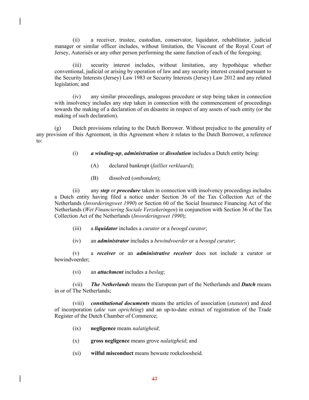 (ii) a receiver, trustee, custodian, conservator, liquidator, rehabilitator, judicial manager or similar officer includes, without limitation, the Viscount of the Royal Court of Jersey, Autorisés or any other person performing the same function of each of the foregoing; (iii) security interest includes, without limitation, any hypothèque whether conventional, judicial or arising by operation of law and any security interest created pursuant to the Security Interests (Jersey) Law 1983 or Security Interests (Jersey) Law 2012 and any related legislation; and (iv) any similar proceedings, analogous procedure or step being taken in connection with insolvency includes any step taken in connection with the commencement of proceedings towards the making of a declaration of en désastre in respect of any assets of such entity (or the making of such declaration). (g) Dutch provisions relating to the Dutch Borrower. Without prejudice to the generality of any provision of this Agreement, in this Agreement where it relates to the Dutch Borrower, a reference to: (i) a winding-up, administration or dissolution includes a Dutch entity being: (A) declared bankrupt (failliet verklaard); (B) dissolved (ontbonden); (ii) any step or procedure taken in connection with insolvency proceedings includes a Dutch entity having filed a notice under Section 36 of the Tax Collection Act of the Netherlands (Invorderingswet 1990) or Section 60 of the Social Insurance Financing Act of the Netherlands (Wet Financiering Sociale Verzekeringen) in conjunction with Section 36 of the Tax Collection Act of the Netherlands (Invorderingswet 1990); (iii) a liquidator includes a curator or a beoogd curator; (iv) an administrator includes a bewindvoerder or a beoogd curator; (v) a receiver or an administrative receiver does not include a curator or bewindvoerder; (vi) an attachment includes a beslag; (vii) The Netherlands means the European part of the Netherlands and Dutch means in or of The Netherlands; (viii) constitutional documents means the articles of association (statuten) and deed of incorporation (akte van oprichting) and an up-to-date extract of registration of the Trade Register of the Dutch Chamber of Commerce; (ix) negligence means nalatigheid; (x) gross negligence means grove nalatigheid; and (xi) wilful misconduct means bewuste roekeloosheid. 47