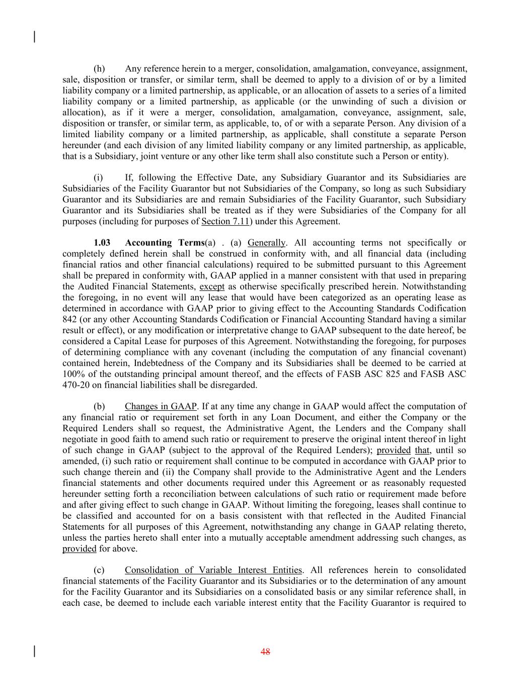 (h) Any reference herein to a merger, consolidation, amalgamation, conveyance, assignment, sale, disposition or transfer, or similar term, shall be deemed to apply to a division of or by a limited liability company or a limited partnership, as applicable, or an allocation of assets to a series of a limited liability company or a limited partnership, as applicable (or the unwinding of such a division or allocation), as if it were a merger, consolidation, amalgamation, conveyance, assignment, sale, disposition or transfer, or similar term, as applicable, to, of or with a separate Person. Any division of a limited liability company or a limited partnership, as applicable, shall constitute a separate Person hereunder (and each division of any limited liability company or any limited partnership, as applicable, that is a Subsidiary, joint venture or any other like term shall also constitute such a Person or entity). (i) If, following the Effective Date, any Subsidiary Guarantor and its Subsidiaries are Subsidiaries of the Facility Guarantor but not Subsidiaries of the Company, so long as such Subsidiary Guarantor and its Subsidiaries are and remain Subsidiaries of the Facility Guarantor, such Subsidiary Guarantor and its Subsidiaries shall be treated as if they were Subsidiaries of the Company for all purposes (including for purposes of Section 7.11) under this Agreement. 1.03 Accounting Terms(a) . (a) Generally. All accounting terms not specifically or completely defined herein shall be construed in conformity with, and all financial data (including financial ratios and other financial calculations) required to be submitted pursuant to this Agreement shall be prepared in conformity with, GAAP applied in a manner consistent with that used in preparing the Audited Financial Statements, except as otherwise specifically prescribed herein. Notwithstanding the foregoing, in no event will any lease that would have been categorized as an operating lease as determined in accordance with GAAP prior to giving effect to the Accounting Standards Codification 842 (or any other Accounting Standards Codification or Financial Accounting Standard having a similar result or effect), or any modification or interpretative change to GAAP subsequent to the date hereof, be considered a Capital Lease for purposes of this Agreement. Notwithstanding the foregoing, for purposes of determining compliance with any covenant (including the computation of any financial covenant) contained herein, Indebtedness of the Company and its Subsidiaries shall be deemed to be carried at 100% of the outstanding principal amount thereof, and the effects of FASB ASC 825 and FASB ASC 470-20 on financial liabilities shall be disregarded. (b) Changes in GAAP. If at any time any change in GAAP would affect the computation of any financial ratio or requirement set forth in any Loan Document, and either the Company or the Required Lenders shall so request, the Administrative Agent, the Lenders and the Company shall negotiate in good faith to amend such ratio or requirement to preserve the original intent thereof in light of such change in GAAP (subject to the approval of the Required Lenders); provided that, until so amended, (i) such ratio or requirement shall continue to be computed in accordance with GAAP prior to such change therein and (ii) the Company shall provide to the Administrative Agent and the Lenders financial statements and other documents required under this Agreement or as reasonably requested hereunder setting forth a reconciliation between calculations of such ratio or requirement made before and after giving effect to such change in GAAP. Without limiting the foregoing, leases shall continue to be classified and accounted for on a basis consistent with that reflected in the Audited Financial Statements for all purposes of this Agreement, notwithstanding any change in GAAP relating thereto, unless the parties hereto shall enter into a mutually acceptable amendment addressing such changes, as provided for above. (c) Consolidation of Variable Interest Entities. All references herein to consolidated financial statements of the Facility Guarantor and its Subsidiaries or to the determination of any amount for the Facility Guarantor and its Subsidiaries on a consolidated basis or any similar reference shall, in each case, be deemed to include each variable interest entity that the Facility Guarantor is required to 48