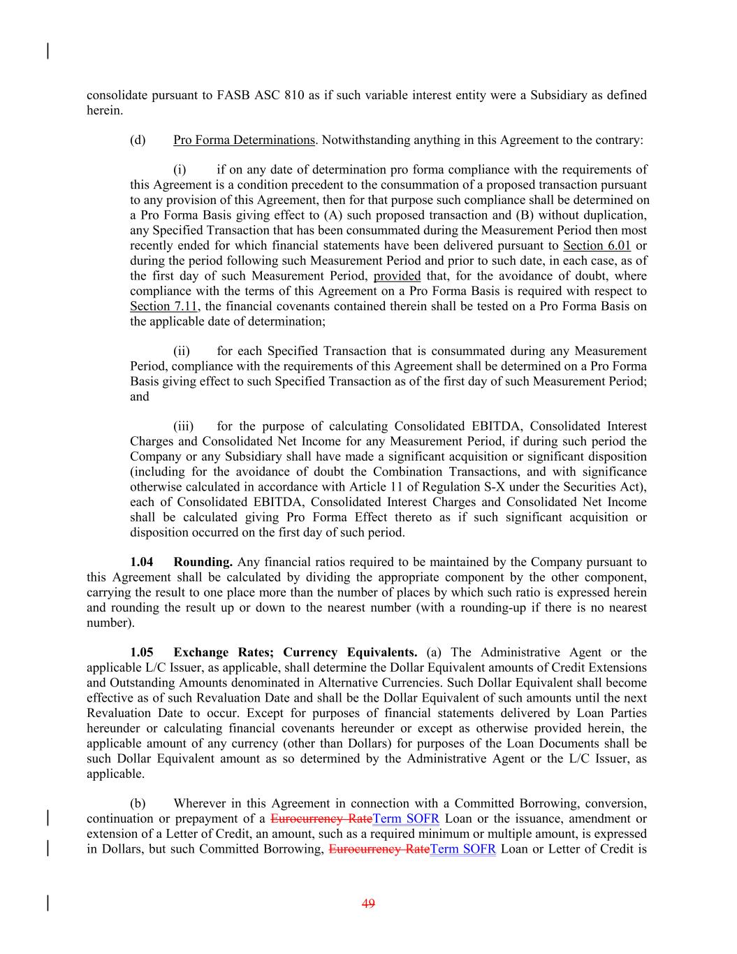 consolidate pursuant to FASB ASC 810 as if such variable interest entity were a Subsidiary as defined herein. (d) Pro Forma Determinations. Notwithstanding anything in this Agreement to the contrary: (i) if on any date of determination pro forma compliance with the requirements of this Agreement is a condition precedent to the consummation of a proposed transaction pursuant to any provision of this Agreement, then for that purpose such compliance shall be determined on a Pro Forma Basis giving effect to (A) such proposed transaction and (B) without duplication, any Specified Transaction that has been consummated during the Measurement Period then most recently ended for which financial statements have been delivered pursuant to Section 6.01 or during the period following such Measurement Period and prior to such date, in each case, as of the first day of such Measurement Period, provided that, for the avoidance of doubt, where compliance with the terms of this Agreement on a Pro Forma Basis is required with respect to Section 7.11, the financial covenants contained therein shall be tested on a Pro Forma Basis on the applicable date of determination; (ii) for each Specified Transaction that is consummated during any Measurement Period, compliance with the requirements of this Agreement shall be determined on a Pro Forma Basis giving effect to such Specified Transaction as of the first day of such Measurement Period; and (iii) for the purpose of calculating Consolidated EBITDA, Consolidated Interest Charges and Consolidated Net Income for any Measurement Period, if during such period the Company or any Subsidiary shall have made a significant acquisition or significant disposition (including for the avoidance of doubt the Combination Transactions, and with significance otherwise calculated in accordance with Article 11 of Regulation S-X under the Securities Act), each of Consolidated EBITDA, Consolidated Interest Charges and Consolidated Net Income shall be calculated giving Pro Forma Effect thereto as if such significant acquisition or disposition occurred on the first day of such period. 1.04 Rounding. Any financial ratios required to be maintained by the Company pursuant to this Agreement shall be calculated by dividing the appropriate component by the other component, carrying the result to one place more than the number of places by which such ratio is expressed herein and rounding the result up or down to the nearest number (with a rounding-up if there is no nearest number). 1.05 Exchange Rates; Currency Equivalents. (a) The Administrative Agent or the applicable L/C Issuer, as applicable, shall determine the Dollar Equivalent amounts of Credit Extensions and Outstanding Amounts denominated in Alternative Currencies. Such Dollar Equivalent shall become effective as of such Revaluation Date and shall be the Dollar Equivalent of such amounts until the next Revaluation Date to occur. Except for purposes of financial statements delivered by Loan Parties hereunder or calculating financial covenants hereunder or except as otherwise provided herein, the applicable amount of any currency (other than Dollars) for purposes of the Loan Documents shall be such Dollar Equivalent amount as so determined by the Administrative Agent or the L/C Issuer, as applicable. (b) Wherever in this Agreement in connection with a Committed Borrowing, conversion, continuation or prepayment of a Eurocurrency RateTerm SOFR Loan or the issuance, amendment or extension of a Letter of Credit, an amount, such as a required minimum or multiple amount, is expressed in Dollars, but such Committed Borrowing, Eurocurrency RateTerm SOFR Loan or Letter of Credit is 49