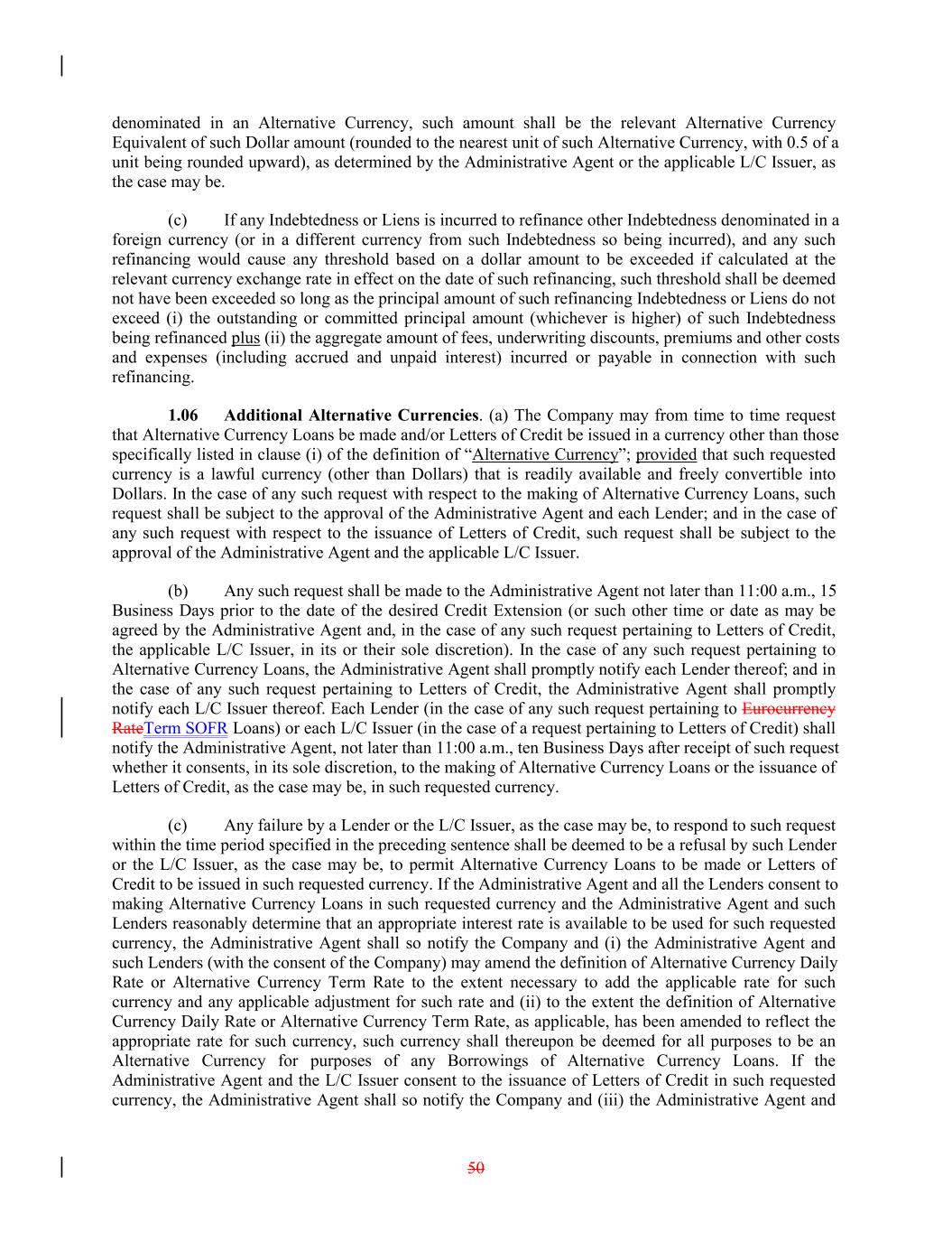 denominated in an Alternative Currency, such amount shall be the relevant Alternative Currency Equivalent of such Dollar amount (rounded to the nearest unit of such Alternative Currency, with 0.5 of a unit being rounded upward), as determined by the Administrative Agent or the applicable L/C Issuer, as the case may be. (c) If any Indebtedness or Liens is incurred to refinance other Indebtedness denominated in a foreign currency (or in a different currency from such Indebtedness so being incurred), and any such refinancing would cause any threshold based on a dollar amount to be exceeded if calculated at the relevant currency exchange rate in effect on the date of such refinancing, such threshold shall be deemed not have been exceeded so long as the principal amount of such refinancing Indebtedness or Liens do not exceed (i) the outstanding or committed principal amount (whichever is higher) of such Indebtedness being refinanced plus (ii) the aggregate amount of fees, underwriting discounts, premiums and other costs and expenses (including accrued and unpaid interest) incurred or payable in connection with such refinancing. 1.06 Additional Alternative Currencies. (a) The Company may from time to time request that Alternative Currency Loans be made and/or Letters of Credit be issued in a currency other than those specifically listed in clause (i) of the definition of “Alternative Currency”; provided that such requested currency is a lawful currency (other than Dollars) that is readily available and freely convertible into Dollars. In the case of any such request with respect to the making of Alternative Currency Loans, such request shall be subject to the approval of the Administrative Agent and each Lender; and in the case of any such request with respect to the issuance of Letters of Credit, such request shall be subject to the approval of the Administrative Agent and the applicable L/C Issuer. (b) Any such request shall be made to the Administrative Agent not later than 11:00 a.m., 15 Business Days prior to the date of the desired Credit Extension (or such other time or date as may be agreed by the Administrative Agent and, in the case of any such request pertaining to Letters of Credit, the applicable L/C Issuer, in its or their sole discretion). In the case of any such request pertaining to Alternative Currency Loans, the Administrative Agent shall promptly notify each Lender thereof; and in the case of any such request pertaining to Letters of Credit, the Administrative Agent shall promptly notify each L/C Issuer thereof. Each Lender (in the case of any such request pertaining to Eurocurrency RateTerm SOFR Loans) or each L/C Issuer (in the case of a request pertaining to Letters of Credit) shall notify the Administrative Agent, not later than 11:00 a.m., ten Business Days after receipt of such request whether it consents, in its sole discretion, to the making of Alternative Currency Loans or the issuance of Letters of Credit, as the case may be, in such requested currency. (c) Any failure by a Lender or the L/C Issuer, as the case may be, to respond to such request within the time period specified in the preceding sentence shall be deemed to be a refusal by such Lender or the L/C Issuer, as the case may be, to permit Alternative Currency Loans to be made or Letters of Credit to be issued in such requested currency. If the Administrative Agent and all the Lenders consent to making Alternative Currency Loans in such requested currency and the Administrative Agent and such Lenders reasonably determine that an appropriate interest rate is available to be used for such requested currency, the Administrative Agent shall so notify the Company and (i) the Administrative Agent and such Lenders (with the consent of the Company) may amend the definition of Alternative Currency Daily Rate or Alternative Currency Term Rate to the extent necessary to add the applicable rate for such currency and any applicable adjustment for such rate and (ii) to the extent the definition of Alternative Currency Daily Rate or Alternative Currency Term Rate, as applicable, has been amended to reflect the appropriate rate for such currency, such currency shall thereupon be deemed for all purposes to be an Alternative Currency for purposes of any Borrowings of Alternative Currency Loans. If the Administrative Agent and the L/C Issuer consent to the issuance of Letters of Credit in such requested currency, the Administrative Agent shall so notify the Company and (iii) the Administrative Agent and 50