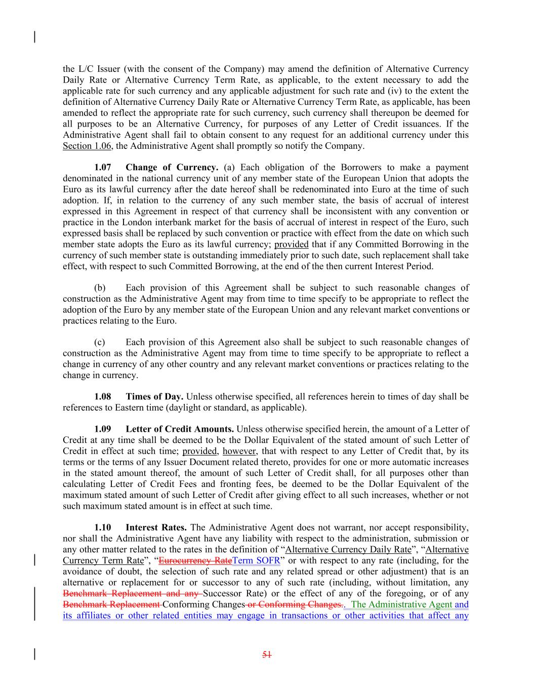 the L/C Issuer (with the consent of the Company) may amend the definition of Alternative Currency Daily Rate or Alternative Currency Term Rate, as applicable, to the extent necessary to add the applicable rate for such currency and any applicable adjustment for such rate and (iv) to the extent the definition of Alternative Currency Daily Rate or Alternative Currency Term Rate, as applicable, has been amended to reflect the appropriate rate for such currency, such currency shall thereupon be deemed for all purposes to be an Alternative Currency, for purposes of any Letter of Credit issuances. If the Administrative Agent shall fail to obtain consent to any request for an additional currency under this Section 1.06, the Administrative Agent shall promptly so notify the Company. 1.07 Change of Currency. (a) Each obligation of the Borrowers to make a payment denominated in the national currency unit of any member state of the European Union that adopts the Euro as its lawful currency after the date hereof shall be redenominated into Euro at the time of such adoption. If, in relation to the currency of any such member state, the basis of accrual of interest expressed in this Agreement in respect of that currency shall be inconsistent with any convention or practice in the London interbank market for the basis of accrual of interest in respect of the Euro, such expressed basis shall be replaced by such convention or practice with effect from the date on which such member state adopts the Euro as its lawful currency; provided that if any Committed Borrowing in the currency of such member state is outstanding immediately prior to such date, such replacement shall take effect, with respect to such Committed Borrowing, at the end of the then current Interest Period. (b) Each provision of this Agreement shall be subject to such reasonable changes of construction as the Administrative Agent may from time to time specify to be appropriate to reflect the adoption of the Euro by any member state of the European Union and any relevant market conventions or practices relating to the Euro. (c) Each provision of this Agreement also shall be subject to such reasonable changes of construction as the Administrative Agent may from time to time specify to be appropriate to reflect a change in currency of any other country and any relevant market conventions or practices relating to the change in currency. 1.08 Times of Day. Unless otherwise specified, all references herein to times of day shall be references to Eastern time (daylight or standard, as applicable). 1.09 Letter of Credit Amounts. Unless otherwise specified herein, the amount of a Letter of Credit at any time shall be deemed to be the Dollar Equivalent of the stated amount of such Letter of Credit in effect at such time; provided, however, that with respect to any Letter of Credit that, by its terms or the terms of any Issuer Document related thereto, provides for one or more automatic increases in the stated amount thereof, the amount of such Letter of Credit shall, for all purposes other than calculating Letter of Credit Fees and fronting fees, be deemed to be the Dollar Equivalent of the maximum stated amount of such Letter of Credit after giving effect to all such increases, whether or not such maximum stated amount is in effect at such time. 1.10 Interest Rates. The Administrative Agent does not warrant, nor accept responsibility, nor shall the Administrative Agent have any liability with respect to the administration, submission or any other matter related to the rates in the definition of “Alternative Currency Daily Rate”, “Alternative Currency Term Rate”, “Eurocurrency RateTerm SOFR” or with respect to any rate (including, for the avoidance of doubt, the selection of such rate and any related spread or other adjustment) that is an alternative or replacement for or successor to any of such rate (including, without limitation, any Benchmark Replacement and any Successor Rate) or the effect of any of the foregoing, or of any Benchmark Replacement Conforming Changes or Conforming Changes.. The Administrative Agent and its affiliates or other related entities may engage in transactions or other activities that affect any 51