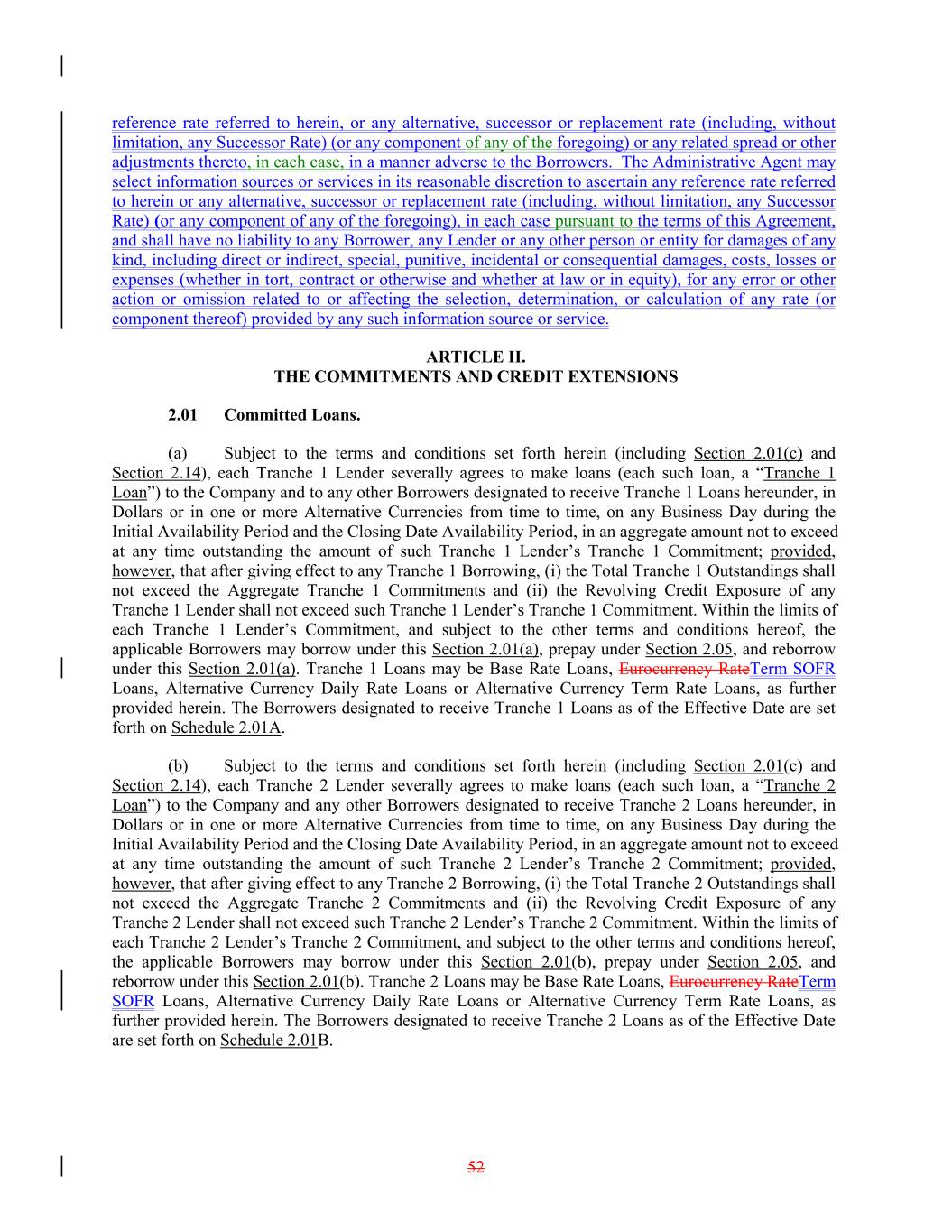 reference rate referred to herein, or any alternative, successor or replacement rate (including, without limitation, any Successor Rate) (or any component of any of the foregoing) or any related spread or other adjustments thereto, in each case, in a manner adverse to the Borrowers. The Administrative Agent may select information sources or services in its reasonable discretion to ascertain any reference rate referred to herein or any alternative, successor or replacement rate (including, without limitation, any Successor Rate) (or any component of any of the foregoing), in each case pursuant to the terms of this Agreement, and shall have no liability to any Borrower, any Lender or any other person or entity for damages of any kind, including direct or indirect, special, punitive, incidental or consequential damages, costs, losses or expenses (whether in tort, contract or otherwise and whether at law or in equity), for any error or other action or omission related to or affecting the selection, determination, or calculation of any rate (or component thereof) provided by any such information source or service. ARTICLE II. THE COMMITMENTS AND CREDIT EXTENSIONS 2.01 Committed Loans. (a) Subject to the terms and conditions set forth herein (including Section 2.01(c) and Section 2.14), each Tranche 1 Lender severally agrees to make loans (each such loan, a “Tranche 1 Loan”) to the Company and to any other Borrowers designated to receive Tranche 1 Loans hereunder, in Dollars or in one or more Alternative Currencies from time to time, on any Business Day during the Initial Availability Period and the Closing Date Availability Period, in an aggregate amount not to exceed at any time outstanding the amount of such Tranche 1 Lender’s Tranche 1 Commitment; provided, however, that after giving effect to any Tranche 1 Borrowing, (i) the Total Tranche 1 Outstandings shall not exceed the Aggregate Tranche 1 Commitments and (ii) the Revolving Credit Exposure of any Tranche 1 Lender shall not exceed such Tranche 1 Lender’s Tranche 1 Commitment. Within the limits of each Tranche 1 Lender’s Commitment, and subject to the other terms and conditions hereof, the applicable Borrowers may borrow under this Section 2.01(a), prepay under Section 2.05, and reborrow under this Section 2.01(a). Tranche 1 Loans may be Base Rate Loans, Eurocurrency RateTerm SOFR Loans, Alternative Currency Daily Rate Loans or Alternative Currency Term Rate Loans, as further provided herein. The Borrowers designated to receive Tranche 1 Loans as of the Effective Date are set forth on Schedule 2.01A. (b) Subject to the terms and conditions set forth herein (including Section 2.01(c) and Section 2.14), each Tranche 2 Lender severally agrees to make loans (each such loan, a “Tranche 2 Loan”) to the Company and any other Borrowers designated to receive Tranche 2 Loans hereunder, in Dollars or in one or more Alternative Currencies from time to time, on any Business Day during the Initial Availability Period and the Closing Date Availability Period, in an aggregate amount not to exceed at any time outstanding the amount of such Tranche 2 Lender’s Tranche 2 Commitment; provided, however, that after giving effect to any Tranche 2 Borrowing, (i) the Total Tranche 2 Outstandings shall not exceed the Aggregate Tranche 2 Commitments and (ii) the Revolving Credit Exposure of any Tranche 2 Lender shall not exceed such Tranche 2 Lender’s Tranche 2 Commitment. Within the limits of each Tranche 2 Lender’s Tranche 2 Commitment, and subject to the other terms and conditions hereof, the applicable Borrowers may borrow under this Section 2.01(b), prepay under Section 2.05, and reborrow under this Section 2.01(b). Tranche 2 Loans may be Base Rate Loans, Eurocurrency RateTerm SOFR Loans, Alternative Currency Daily Rate Loans or Alternative Currency Term Rate Loans, as further provided herein. The Borrowers designated to receive Tranche 2 Loans as of the Effective Date are set forth on Schedule 2.01B. 52