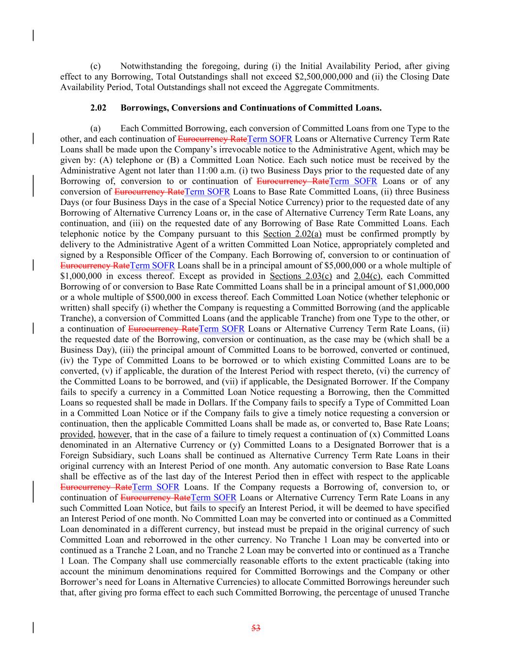 (c) Notwithstanding the foregoing, during (i) the Initial Availability Period, after giving effect to any Borrowing, Total Outstandings shall not exceed $2,500,000,000 and (ii) the Closing Date Availability Period, Total Outstandings shall not exceed the Aggregate Commitments. 2.02 Borrowings, Conversions and Continuations of Committed Loans. (a) Each Committed Borrowing, each conversion of Committed Loans from one Type to the other, and each continuation of Eurocurrency RateTerm SOFR Loans or Alternative Currency Term Rate Loans shall be made upon the Company’s irrevocable notice to the Administrative Agent, which may be given by: (A) telephone or (B) a Committed Loan Notice. Each such notice must be received by the Administrative Agent not later than 11:00 a.m. (i) two Business Days prior to the requested date of any Borrowing of, conversion to or continuation of Eurocurrency RateTerm SOFR Loans or of any conversion of Eurocurrency RateTerm SOFR Loans to Base Rate Committed Loans, (ii) three Business Days (or four Business Days in the case of a Special Notice Currency) prior to the requested date of any Borrowing of Alternative Currency Loans or, in the case of Alternative Currency Term Rate Loans, any continuation, and (iii) on the requested date of any Borrowing of Base Rate Committed Loans. Each telephonic notice by the Company pursuant to this Section 2.02(a) must be confirmed promptly by delivery to the Administrative Agent of a written Committed Loan Notice, appropriately completed and signed by a Responsible Officer of the Company. Each Borrowing of, conversion to or continuation of Eurocurrency RateTerm SOFR Loans shall be in a principal amount of $5,000,000 or a whole multiple of $1,000,000 in excess thereof. Except as provided in Sections 2.03(c) and 2.04(c), each Committed Borrowing of or conversion to Base Rate Committed Loans shall be in a principal amount of $1,000,000 or a whole multiple of $500,000 in excess thereof. Each Committed Loan Notice (whether telephonic or written) shall specify (i) whether the Company is requesting a Committed Borrowing (and the applicable Tranche), a conversion of Committed Loans (and the applicable Tranche) from one Type to the other, or a continuation of Eurocurrency RateTerm SOFR Loans or Alternative Currency Term Rate Loans, (ii) the requested date of the Borrowing, conversion or continuation, as the case may be (which shall be a Business Day), (iii) the principal amount of Committed Loans to be borrowed, converted or continued, (iv) the Type of Committed Loans to be borrowed or to which existing Committed Loans are to be converted, (v) if applicable, the duration of the Interest Period with respect thereto, (vi) the currency of the Committed Loans to be borrowed, and (vii) if applicable, the Designated Borrower. If the Company fails to specify a currency in a Committed Loan Notice requesting a Borrowing, then the Committed Loans so requested shall be made in Dollars. If the Company fails to specify a Type of Committed Loan in a Committed Loan Notice or if the Company fails to give a timely notice requesting a conversion or continuation, then the applicable Committed Loans shall be made as, or converted to, Base Rate Loans; provided, however, that in the case of a failure to timely request a continuation of (x) Committed Loans denominated in an Alternative Currency or (y) Committed Loans to a Designated Borrower that is a Foreign Subsidiary, such Loans shall be continued as Alternative Currency Term Rate Loans in their original currency with an Interest Period of one month. Any automatic conversion to Base Rate Loans shall be effective as of the last day of the Interest Period then in effect with respect to the applicable Eurocurrency RateTerm SOFR Loans. If the Company requests a Borrowing of, conversion to, or continuation of Eurocurrency RateTerm SOFR Loans or Alternative Currency Term Rate Loans in any such Committed Loan Notice, but fails to specify an Interest Period, it will be deemed to have specified an Interest Period of one month. No Committed Loan may be converted into or continued as a Committed Loan denominated in a different currency, but instead must be prepaid in the original currency of such Committed Loan and reborrowed in the other currency. No Tranche 1 Loan may be converted into or continued as a Tranche 2 Loan, and no Tranche 2 Loan may be converted into or continued as a Tranche 1 Loan. The Company shall use commercially reasonable efforts to the extent practicable (taking into account the minimum denominations required for Committed Borrowings and the Company or other Borrower’s need for Loans in Alternative Currencies) to allocate Committed Borrowings hereunder such that, after giving pro forma effect to each such Committed Borrowing, the percentage of unused Tranche 53