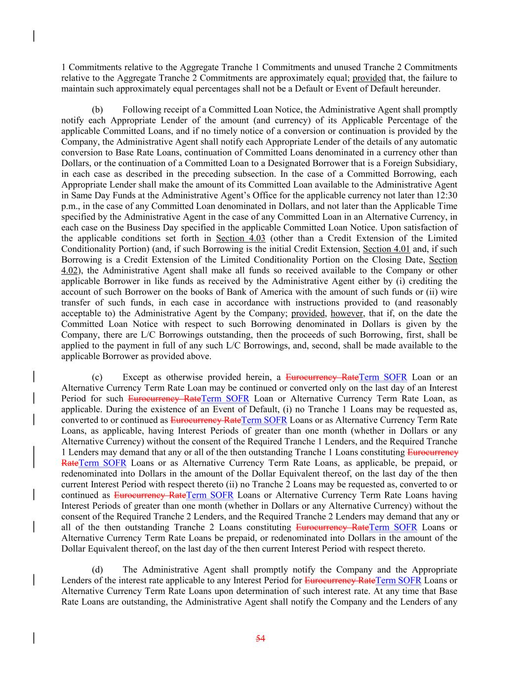 1 Commitments relative to the Aggregate Tranche 1 Commitments and unused Tranche 2 Commitments relative to the Aggregate Tranche 2 Commitments are approximately equal; provided that, the failure to maintain such approximately equal percentages shall not be a Default or Event of Default hereunder. (b) Following receipt of a Committed Loan Notice, the Administrative Agent shall promptly notify each Appropriate Lender of the amount (and currency) of its Applicable Percentage of the applicable Committed Loans, and if no timely notice of a conversion or continuation is provided by the Company, the Administrative Agent shall notify each Appropriate Lender of the details of any automatic conversion to Base Rate Loans, continuation of Committed Loans denominated in a currency other than Dollars, or the continuation of a Committed Loan to a Designated Borrower that is a Foreign Subsidiary, in each case as described in the preceding subsection. In the case of a Committed Borrowing, each Appropriate Lender shall make the amount of its Committed Loan available to the Administrative Agent in Same Day Funds at the Administrative Agent’s Office for the applicable currency not later than 12:30 p.m., in the case of any Committed Loan denominated in Dollars, and not later than the Applicable Time specified by the Administrative Agent in the case of any Committed Loan in an Alternative Currency, in each case on the Business Day specified in the applicable Committed Loan Notice. Upon satisfaction of the applicable conditions set forth in Section 4.03 (other than a Credit Extension of the Limited Conditionality Portion) (and, if such Borrowing is the initial Credit Extension, Section 4.01 and, if such Borrowing is a Credit Extension of the Limited Conditionality Portion on the Closing Date, Section 4.02), the Administrative Agent shall make all funds so received available to the Company or other applicable Borrower in like funds as received by the Administrative Agent either by (i) crediting the account of such Borrower on the books of Bank of America with the amount of such funds or (ii) wire transfer of such funds, in each case in accordance with instructions provided to (and reasonably acceptable to) the Administrative Agent by the Company; provided, however, that if, on the date the Committed Loan Notice with respect to such Borrowing denominated in Dollars is given by the Company, there are L/C Borrowings outstanding, then the proceeds of such Borrowing, first, shall be applied to the payment in full of any such L/C Borrowings, and, second, shall be made available to the applicable Borrower as provided above. (c) Except as otherwise provided herein, a Eurocurrency RateTerm SOFR Loan or an Alternative Currency Term Rate Loan may be continued or converted only on the last day of an Interest Period for such Eurocurrency RateTerm SOFR Loan or Alternative Currency Term Rate Loan, as applicable. During the existence of an Event of Default, (i) no Tranche 1 Loans may be requested as, converted to or continued as Eurocurrency RateTerm SOFR Loans or as Alternative Currency Term Rate Loans, as applicable, having Interest Periods of greater than one month (whether in Dollars or any Alternative Currency) without the consent of the Required Tranche 1 Lenders, and the Required Tranche 1 Lenders may demand that any or all of the then outstanding Tranche 1 Loans constituting Eurocurrency RateTerm SOFR Loans or as Alternative Currency Term Rate Loans, as applicable, be prepaid, or redenominated into Dollars in the amount of the Dollar Equivalent thereof, on the last day of the then current Interest Period with respect thereto (ii) no Tranche 2 Loans may be requested as, converted to or continued as Eurocurrency RateTerm SOFR Loans or Alternative Currency Term Rate Loans having Interest Periods of greater than one month (whether in Dollars or any Alternative Currency) without the consent of the Required Tranche 2 Lenders, and the Required Tranche 2 Lenders may demand that any or all of the then outstanding Tranche 2 Loans constituting Eurocurrency RateTerm SOFR Loans or Alternative Currency Term Rate Loans be prepaid, or redenominated into Dollars in the amount of the Dollar Equivalent thereof, on the last day of the then current Interest Period with respect thereto. (d) The Administrative Agent shall promptly notify the Company and the Appropriate Lenders of the interest rate applicable to any Interest Period for Eurocurrency RateTerm SOFR Loans or Alternative Currency Term Rate Loans upon determination of such interest rate. At any time that Base Rate Loans are outstanding, the Administrative Agent shall notify the Company and the Lenders of any 54