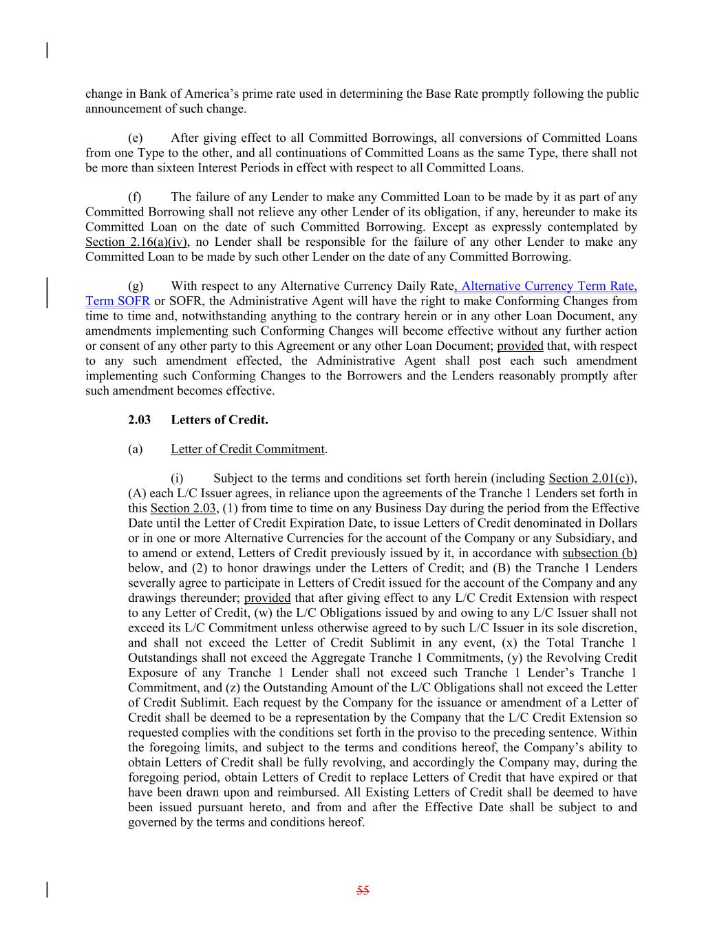 change in Bank of America’s prime rate used in determining the Base Rate promptly following the public announcement of such change. (e) After giving effect to all Committed Borrowings, all conversions of Committed Loans from one Type to the other, and all continuations of Committed Loans as the same Type, there shall not be more than sixteen Interest Periods in effect with respect to all Committed Loans. (f) The failure of any Lender to make any Committed Loan to be made by it as part of any Committed Borrowing shall not relieve any other Lender of its obligation, if any, hereunder to make its Committed Loan on the date of such Committed Borrowing. Except as expressly contemplated by Section 2.16(a)(iv), no Lender shall be responsible for the failure of any other Lender to make any Committed Loan to be made by such other Lender on the date of any Committed Borrowing. (g) With respect to any Alternative Currency Daily Rate, Alternative Currency Term Rate, Term SOFR or SOFR, the Administrative Agent will have the right to make Conforming Changes from time to time and, notwithstanding anything to the contrary herein or in any other Loan Document, any amendments implementing such Conforming Changes will become effective without any further action or consent of any other party to this Agreement or any other Loan Document; provided that, with respect to any such amendment effected, the Administrative Agent shall post each such amendment implementing such Conforming Changes to the Borrowers and the Lenders reasonably promptly after such amendment becomes effective. 2.03 Letters of Credit. (a) Letter of Credit Commitment. (i) Subject to the terms and conditions set forth herein (including Section 2.01(c)), (A) each L/C Issuer agrees, in reliance upon the agreements of the Tranche 1 Lenders set forth in this Section 2.03, (1) from time to time on any Business Day during the period from the Effective Date until the Letter of Credit Expiration Date, to issue Letters of Credit denominated in Dollars or in one or more Alternative Currencies for the account of the Company or any Subsidiary, and to amend or extend, Letters of Credit previously issued by it, in accordance with subsection (b) below, and (2) to honor drawings under the Letters of Credit; and (B) the Tranche 1 Lenders severally agree to participate in Letters of Credit issued for the account of the Company and any drawings thereunder; provided that after giving effect to any L/C Credit Extension with respect to any Letter of Credit, (w) the L/C Obligations issued by and owing to any L/C Issuer shall not exceed its L/C Commitment unless otherwise agreed to by such L/C Issuer in its sole discretion, and shall not exceed the Letter of Credit Sublimit in any event, (x) the Total Tranche 1 Outstandings shall not exceed the Aggregate Tranche 1 Commitments, (y) the Revolving Credit Exposure of any Tranche 1 Lender shall not exceed such Tranche 1 Lender’s Tranche 1 Commitment, and (z) the Outstanding Amount of the L/C Obligations shall not exceed the Letter of Credit Sublimit. Each request by the Company for the issuance or amendment of a Letter of Credit shall be deemed to be a representation by the Company that the L/C Credit Extension so requested complies with the conditions set forth in the proviso to the preceding sentence. Within the foregoing limits, and subject to the terms and conditions hereof, the Company’s ability to obtain Letters of Credit shall be fully revolving, and accordingly the Company may, during the foregoing period, obtain Letters of Credit to replace Letters of Credit that have expired or that have been drawn upon and reimbursed. All Existing Letters of Credit shall be deemed to have been issued pursuant hereto, and from and after the Effective Date shall be subject to and governed by the terms and conditions hereof. 55