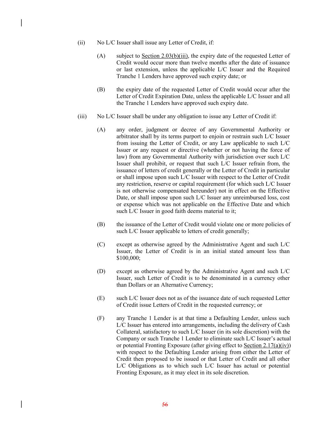 (ii) No L/C Issuer shall issue any Letter of Credit, if: (A) subject to Section 2.03(b)(iii), the expiry date of the requested Letter of Credit would occur more than twelve months after the date of issuance or last extension, unless the applicable L/C Issuer and the Required Tranche 1 Lenders have approved such expiry date; or (B) the expiry date of the requested Letter of Credit would occur after the Letter of Credit Expiration Date, unless the applicable L/C Issuer and all the Tranche 1 Lenders have approved such expiry date. (iii) No L/C Issuer shall be under any obligation to issue any Letter of Credit if: (A) any order, judgment or decree of any Governmental Authority or arbitrator shall by its terms purport to enjoin or restrain such L/C Issuer from issuing the Letter of Credit, or any Law applicable to such L/C Issuer or any request or directive (whether or not having the force of law) from any Governmental Authority with jurisdiction over such L/C Issuer shall prohibit, or request that such L/C Issuer refrain from, the issuance of letters of credit generally or the Letter of Credit in particular or shall impose upon such L/C Issuer with respect to the Letter of Credit any restriction, reserve or capital requirement (for which such L/C Issuer is not otherwise compensated hereunder) not in effect on the Effective Date, or shall impose upon such L/C Issuer any unreimbursed loss, cost or expense which was not applicable on the Effective Date and which such L/C Issuer in good faith deems material to it; (B) the issuance of the Letter of Credit would violate one or more policies of such L/C Issuer applicable to letters of credit generally; (C) except as otherwise agreed by the Administrative Agent and such L/C Issuer, the Letter of Credit is in an initial stated amount less than $100,000; (D) except as otherwise agreed by the Administrative Agent and such L/C Issuer, such Letter of Credit is to be denominated in a currency other than Dollars or an Alternative Currency; (E) such L/C Issuer does not as of the issuance date of such requested Letter of Credit issue Letters of Credit in the requested currency; or (F) any Tranche 1 Lender is at that time a Defaulting Lender, unless such L/C Issuer has entered into arrangements, including the delivery of Cash Collateral, satisfactory to such L/C Issuer (in its sole discretion) with the Company or such Tranche 1 Lender to eliminate such L/C Issuer’s actual or potential Fronting Exposure (after giving effect to Section 2.17(a)(iv)) with respect to the Defaulting Lender arising from either the Letter of Credit then proposed to be issued or that Letter of Credit and all other L/C Obligations as to which such L/C Issuer has actual or potential Fronting Exposure, as it may elect in its sole discretion. 56