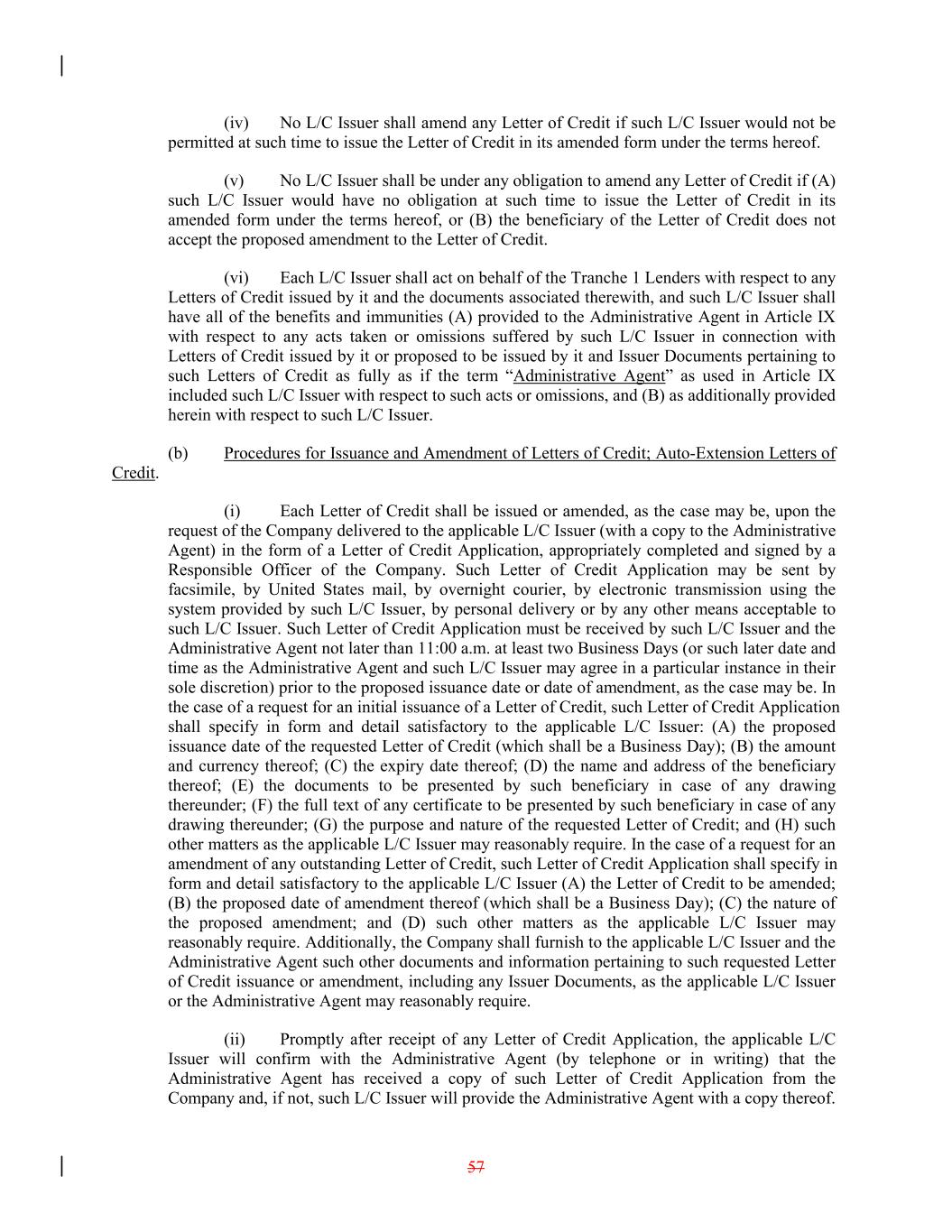 (iv) No L/C Issuer shall amend any Letter of Credit if such L/C Issuer would not be permitted at such time to issue the Letter of Credit in its amended form under the terms hereof. (v) No L/C Issuer shall be under any obligation to amend any Letter of Credit if (A) such L/C Issuer would have no obligation at such time to issue the Letter of Credit in its amended form under the terms hereof, or (B) the beneficiary of the Letter of Credit does not accept the proposed amendment to the Letter of Credit. (vi) Each L/C Issuer shall act on behalf of the Tranche 1 Lenders with respect to any Letters of Credit issued by it and the documents associated therewith, and such L/C Issuer shall have all of the benefits and immunities (A) provided to the Administrative Agent in Article IX with respect to any acts taken or omissions suffered by such L/C Issuer in connection with Letters of Credit issued by it or proposed to be issued by it and Issuer Documents pertaining to such Letters of Credit as fully as if the term “Administrative Agent” as used in Article IX included such L/C Issuer with respect to such acts or omissions, and (B) as additionally provided herein with respect to such L/C Issuer. (b) Procedures for Issuance and Amendment of Letters of Credit; Auto-Extension Letters of Credit. (i) Each Letter of Credit shall be issued or amended, as the case may be, upon the request of the Company delivered to the applicable L/C Issuer (with a copy to the Administrative Agent) in the form of a Letter of Credit Application, appropriately completed and signed by a Responsible Officer of the Company. Such Letter of Credit Application may be sent by facsimile, by United States mail, by overnight courier, by electronic transmission using the system provided by such L/C Issuer, by personal delivery or by any other means acceptable to such L/C Issuer. Such Letter of Credit Application must be received by such L/C Issuer and the Administrative Agent not later than 11:00 a.m. at least two Business Days (or such later date and time as the Administrative Agent and such L/C Issuer may agree in a particular instance in their sole discretion) prior to the proposed issuance date or date of amendment, as the case may be. In the case of a request for an initial issuance of a Letter of Credit, such Letter of Credit Application shall specify in form and detail satisfactory to the applicable L/C Issuer: (A) the proposed issuance date of the requested Letter of Credit (which shall be a Business Day); (B) the amount and currency thereof; (C) the expiry date thereof; (D) the name and address of the beneficiary thereof; (E) the documents to be presented by such beneficiary in case of any drawing thereunder; (F) the full text of any certificate to be presented by such beneficiary in case of any drawing thereunder; (G) the purpose and nature of the requested Letter of Credit; and (H) such other matters as the applicable L/C Issuer may reasonably require. In the case of a request for an amendment of any outstanding Letter of Credit, such Letter of Credit Application shall specify in form and detail satisfactory to the applicable L/C Issuer (A) the Letter of Credit to be amended; (B) the proposed date of amendment thereof (which shall be a Business Day); (C) the nature of the proposed amendment; and (D) such other matters as the applicable L/C Issuer may reasonably require. Additionally, the Company shall furnish to the applicable L/C Issuer and the Administrative Agent such other documents and information pertaining to such requested Letter of Credit issuance or amendment, including any Issuer Documents, as the applicable L/C Issuer or the Administrative Agent may reasonably require. (ii) Promptly after receipt of any Letter of Credit Application, the applicable L/C Issuer will confirm with the Administrative Agent (by telephone or in writing) that the Administrative Agent has received a copy of such Letter of Credit Application from the Company and, if not, such L/C Issuer will provide the Administrative Agent with a copy thereof. 57