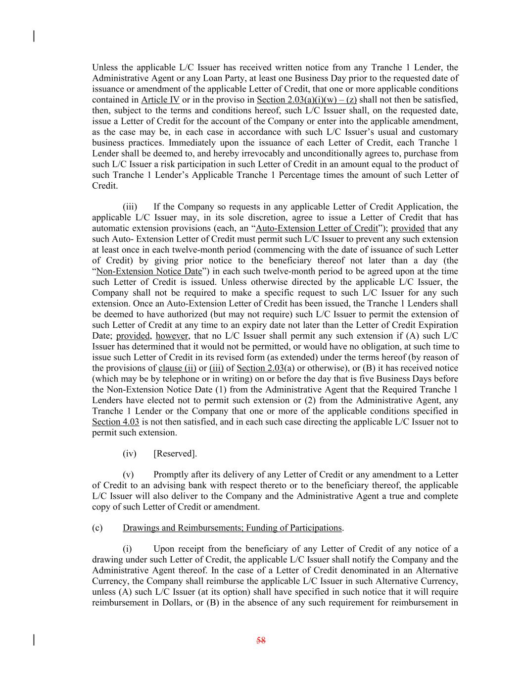 Unless the applicable L/C Issuer has received written notice from any Tranche 1 Lender, the Administrative Agent or any Loan Party, at least one Business Day prior to the requested date of issuance or amendment of the applicable Letter of Credit, that one or more applicable conditions contained in Article IV or in the proviso in Section 2.03(a)(i)(w) – (z) shall not then be satisfied, then, subject to the terms and conditions hereof, such L/C Issuer shall, on the requested date, issue a Letter of Credit for the account of the Company or enter into the applicable amendment, as the case may be, in each case in accordance with such L/C Issuer’s usual and customary business practices. Immediately upon the issuance of each Letter of Credit, each Tranche 1 Lender shall be deemed to, and hereby irrevocably and unconditionally agrees to, purchase from such L/C Issuer a risk participation in such Letter of Credit in an amount equal to the product of such Tranche 1 Lender’s Applicable Tranche 1 Percentage times the amount of such Letter of Credit. (iii) If the Company so requests in any applicable Letter of Credit Application, the applicable L/C Issuer may, in its sole discretion, agree to issue a Letter of Credit that has automatic extension provisions (each, an “Auto-Extension Letter of Credit”); provided that any such Auto- Extension Letter of Credit must permit such L/C Issuer to prevent any such extension at least once in each twelve-month period (commencing with the date of issuance of such Letter of Credit) by giving prior notice to the beneficiary thereof not later than a day (the “Non-Extension Notice Date”) in each such twelve-month period to be agreed upon at the time such Letter of Credit is issued. Unless otherwise directed by the applicable L/C Issuer, the Company shall not be required to make a specific request to such L/C Issuer for any such extension. Once an Auto-Extension Letter of Credit has been issued, the Tranche 1 Lenders shall be deemed to have authorized (but may not require) such L/C Issuer to permit the extension of such Letter of Credit at any time to an expiry date not later than the Letter of Credit Expiration Date; provided, however, that no L/C Issuer shall permit any such extension if (A) such L/C Issuer has determined that it would not be permitted, or would have no obligation, at such time to issue such Letter of Credit in its revised form (as extended) under the terms hereof (by reason of the provisions of clause (ii) or (iii) of Section 2.03(a) or otherwise), or (B) it has received notice (which may be by telephone or in writing) on or before the day that is five Business Days before the Non-Extension Notice Date (1) from the Administrative Agent that the Required Tranche 1 Lenders have elected not to permit such extension or (2) from the Administrative Agent, any Tranche 1 Lender or the Company that one or more of the applicable conditions specified in Section 4.03 is not then satisfied, and in each such case directing the applicable L/C Issuer not to permit such extension. (iv) [Reserved]. (v) Promptly after its delivery of any Letter of Credit or any amendment to a Letter of Credit to an advising bank with respect thereto or to the beneficiary thereof, the applicable L/C Issuer will also deliver to the Company and the Administrative Agent a true and complete copy of such Letter of Credit or amendment. (c) Drawings and Reimbursements; Funding of Participations. (i) Upon receipt from the beneficiary of any Letter of Credit of any notice of a drawing under such Letter of Credit, the applicable L/C Issuer shall notify the Company and the Administrative Agent thereof. In the case of a Letter of Credit denominated in an Alternative Currency, the Company shall reimburse the applicable L/C Issuer in such Alternative Currency, unless (A) such L/C Issuer (at its option) shall have specified in such notice that it will require reimbursement in Dollars, or (B) in the absence of any such requirement for reimbursement in 58