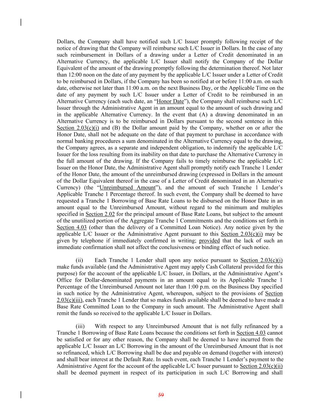 Dollars, the Company shall have notified such L/C Issuer promptly following receipt of the notice of drawing that the Company will reimburse such L/C Issuer in Dollars. In the case of any such reimbursement in Dollars of a drawing under a Letter of Credit denominated in an Alternative Currency, the applicable L/C Issuer shall notify the Company of the Dollar Equivalent of the amount of the drawing promptly following the determination thereof. Not later than 12:00 noon on the date of any payment by the applicable L/C Issuer under a Letter of Credit to be reimbursed in Dollars, if the Company has been so notified at or before 11:00 a.m. on such date, otherwise not later than 11:00 a.m. on the next Business Day, or the Applicable Time on the date of any payment by such L/C Issuer under a Letter of Credit to be reimbursed in an Alternative Currency (each such date, an “Honor Date”), the Company shall reimburse such L/C Issuer through the Administrative Agent in an amount equal to the amount of such drawing and in the applicable Alternative Currency. In the event that (A) a drawing denominated in an Alternative Currency is to be reimbursed in Dollars pursuant to the second sentence in this Section 2.03(c)(i) and (B) the Dollar amount paid by the Company, whether on or after the Honor Date, shall not be adequate on the date of that payment to purchase in accordance with normal banking procedures a sum denominated in the Alternative Currency equal to the drawing, the Company agrees, as a separate and independent obligation, to indemnify the applicable L/C Issuer for the loss resulting from its inability on that date to purchase the Alternative Currency in the full amount of the drawing. If the Company fails to timely reimburse the applicable L/C Issuer on the Honor Date, the Administrative Agent shall promptly notify each Tranche 1 Lender of the Honor Date, the amount of the unreimbursed drawing (expressed in Dollars in the amount of the Dollar Equivalent thereof in the case of a Letter of Credit denominated in an Alternative Currency) (the “Unreimbursed Amount”), and the amount of such Tranche 1 Lender’s Applicable Tranche 1 Percentage thereof. In such event, the Company shall be deemed to have requested a Tranche 1 Borrowing of Base Rate Loans to be disbursed on the Honor Date in an amount equal to the Unreimbursed Amount, without regard to the minimum and multiples specified in Section 2.02 for the principal amount of Base Rate Loans, but subject to the amount of the unutilized portion of the Aggregate Tranche 1 Commitments and the conditions set forth in Section 4.03 (other than the delivery of a Committed Loan Notice). Any notice given by the applicable L/C Issuer or the Administrative Agent pursuant to this Section 2.03(c)(i) may be given by telephone if immediately confirmed in writing; provided that the lack of such an immediate confirmation shall not affect the conclusiveness or binding effect of such notice. (ii) Each Tranche 1 Lender shall upon any notice pursuant to Section 2.03(c)(i) make funds available (and the Administrative Agent may apply Cash Collateral provided for this purpose) for the account of the applicable L/C Issuer, in Dollars, at the Administrative Agent’s Office for Dollar-denominated payments in an amount equal to its Applicable Tranche 1 Percentage of the Unreimbursed Amount not later than 1:00 p.m. on the Business Day specified in such notice by the Administrative Agent, whereupon, subject to the provisions of Section 2.03(c)(iii), each Tranche 1 Lender that so makes funds available shall be deemed to have made a Base Rate Committed Loan to the Company in such amount. The Administrative Agent shall remit the funds so received to the applicable L/C Issuer in Dollars. (iii) With respect to any Unreimbursed Amount that is not fully refinanced by a Tranche 1 Borrowing of Base Rate Loans because the conditions set forth in Section 4.03 cannot be satisfied or for any other reason, the Company shall be deemed to have incurred from the applicable L/C Issuer an L/C Borrowing in the amount of the Unreimbursed Amount that is not so refinanced, which L/C Borrowing shall be due and payable on demand (together with interest) and shall bear interest at the Default Rate. In such event, each Tranche 1 Lender’s payment to the Administrative Agent for the account of the applicable L/C Issuer pursuant to Section 2.03(c)(ii) shall be deemed payment in respect of its participation in such L/C Borrowing and shall 59