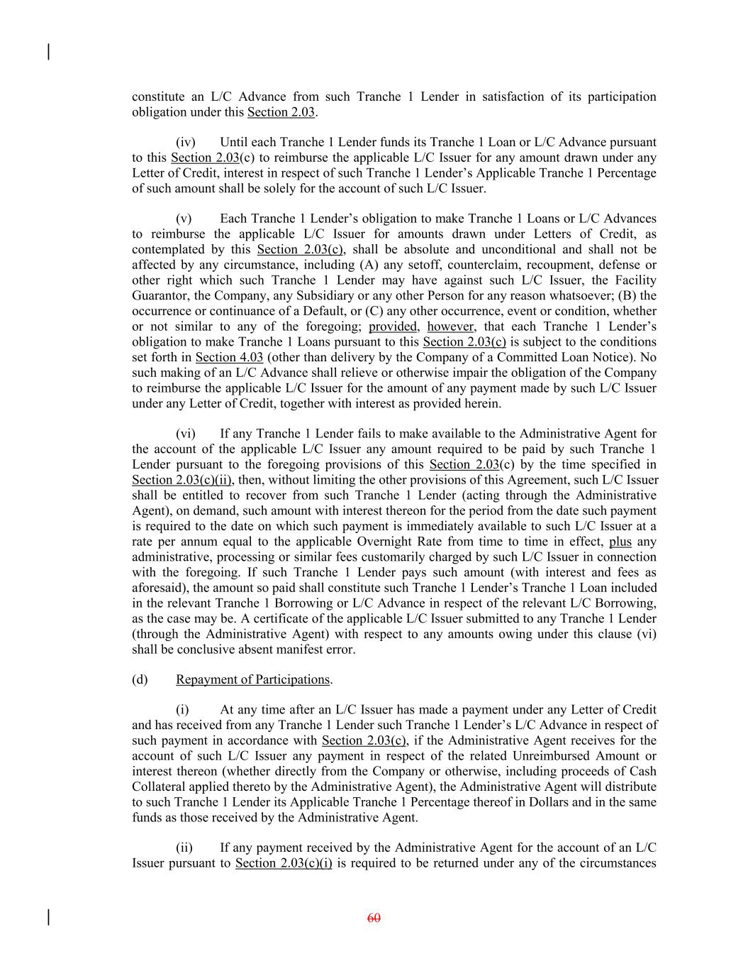 constitute an L/C Advance from such Tranche 1 Lender in satisfaction of its participation obligation under this Section 2.03. (iv) Until each Tranche 1 Lender funds its Tranche 1 Loan or L/C Advance pursuant to this Section 2.03(c) to reimburse the applicable L/C Issuer for any amount drawn under any Letter of Credit, interest in respect of such Tranche 1 Lender’s Applicable Tranche 1 Percentage of such amount shall be solely for the account of such L/C Issuer. (v) Each Tranche 1 Lender’s obligation to make Tranche 1 Loans or L/C Advances to reimburse the applicable L/C Issuer for amounts drawn under Letters of Credit, as contemplated by this Section 2.03(c), shall be absolute and unconditional and shall not be affected by any circumstance, including (A) any setoff, counterclaim, recoupment, defense or other right which such Tranche 1 Lender may have against such L/C Issuer, the Facility Guarantor, the Company, any Subsidiary or any other Person for any reason whatsoever; (B) the occurrence or continuance of a Default, or (C) any other occurrence, event or condition, whether or not similar to any of the foregoing; provided, however, that each Tranche 1 Lender’s obligation to make Tranche 1 Loans pursuant to this Section 2.03(c) is subject to the conditions set forth in Section 4.03 (other than delivery by the Company of a Committed Loan Notice). No such making of an L/C Advance shall relieve or otherwise impair the obligation of the Company to reimburse the applicable L/C Issuer for the amount of any payment made by such L/C Issuer under any Letter of Credit, together with interest as provided herein. (vi) If any Tranche 1 Lender fails to make available to the Administrative Agent for the account of the applicable L/C Issuer any amount required to be paid by such Tranche 1 Lender pursuant to the foregoing provisions of this Section 2.03(c) by the time specified in Section 2.03(c)(ii), then, without limiting the other provisions of this Agreement, such L/C Issuer shall be entitled to recover from such Tranche 1 Lender (acting through the Administrative Agent), on demand, such amount with interest thereon for the period from the date such payment is required to the date on which such payment is immediately available to such L/C Issuer at a rate per annum equal to the applicable Overnight Rate from time to time in effect, plus any administrative, processing or similar fees customarily charged by such L/C Issuer in connection with the foregoing. If such Tranche 1 Lender pays such amount (with interest and fees as aforesaid), the amount so paid shall constitute such Tranche 1 Lender’s Tranche 1 Loan included in the relevant Tranche 1 Borrowing or L/C Advance in respect of the relevant L/C Borrowing, as the case may be. A certificate of the applicable L/C Issuer submitted to any Tranche 1 Lender (through the Administrative Agent) with respect to any amounts owing under this clause (vi) shall be conclusive absent manifest error. (d) Repayment of Participations. (i) At any time after an L/C Issuer has made a payment under any Letter of Credit and has received from any Tranche 1 Lender such Tranche 1 Lender’s L/C Advance in respect of such payment in accordance with Section 2.03(c), if the Administrative Agent receives for the account of such L/C Issuer any payment in respect of the related Unreimbursed Amount or interest thereon (whether directly from the Company or otherwise, including proceeds of Cash Collateral applied thereto by the Administrative Agent), the Administrative Agent will distribute to such Tranche 1 Lender its Applicable Tranche 1 Percentage thereof in Dollars and in the same funds as those received by the Administrative Agent. (ii) If any payment received by the Administrative Agent for the account of an L/C Issuer pursuant to Section 2.03(c)(i) is required to be returned under any of the circumstances 60