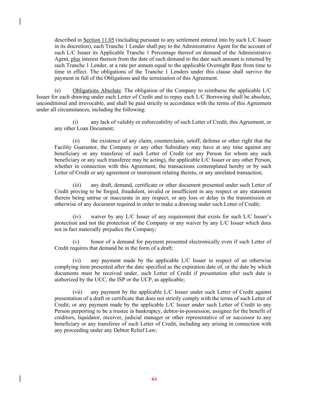 described in Section 11.05 (including pursuant to any settlement entered into by such L/C Issuer in its discretion), each Tranche 1 Lender shall pay to the Administrative Agent for the account of such L/C Issuer its Applicable Tranche 1 Percentage thereof on demand of the Administrative Agent, plus interest thereon from the date of such demand to the date such amount is returned by such Tranche 1 Lender, at a rate per annum equal to the applicable Overnight Rate from time to time in effect. The obligations of the Tranche 1 Lenders under this clause shall survive the payment in full of the Obligations and the termination of this Agreement. (e) Obligations Absolute. The obligation of the Company to reimburse the applicable L/C Issuer for each drawing under each Letter of Credit and to repay each L/C Borrowing shall be absolute, unconditional and irrevocable, and shall be paid strictly in accordance with the terms of this Agreement under all circumstances, including the following: (i) any lack of validity or enforceability of such Letter of Credit, this Agreement, or any other Loan Document; (ii) the existence of any claim, counterclaim, setoff, defense or other right that the Facility Guarantor, the Company or any other Subsidiary may have at any time against any beneficiary or any transferee of such Letter of Credit (or any Person for whom any such beneficiary or any such transferee may be acting), the applicable L/C Issuer or any other Person, whether in connection with this Agreement, the transactions contemplated hereby or by such Letter of Credit or any agreement or instrument relating thereto, or any unrelated transaction; (iii) any draft, demand, certificate or other document presented under such Letter of Credit proving to be forged, fraudulent, invalid or insufficient in any respect or any statement therein being untrue or inaccurate in any respect; or any loss or delay in the transmission or otherwise of any document required in order to make a drawing under such Letter of Credit; (iv) waiver by any L/C Issuer of any requirement that exists for such L/C Issuer’s protection and not the protection of the Company or any waiver by any L/C Issuer which does not in fact materially prejudice the Company; (v) honor of a demand for payment presented electronically even if such Letter of Credit requires that demand be in the form of a draft; (vi) any payment made by the applicable L/C Issuer in respect of an otherwise complying item presented after the date specified as the expiration date of, or the date by which documents must be received under, such Letter of Credit if presentation after such date is authorized by the UCC, the ISP or the UCP, as applicable; (vii) any payment by the applicable L/C Issuer under such Letter of Credit against presentation of a draft or certificate that does not strictly comply with the terms of such Letter of Credit; or any payment made by the applicable L/C Issuer under such Letter of Credit to any Person purporting to be a trustee in bankruptcy, debtor-in-possession, assignee for the benefit of creditors, liquidator, receiver, judicial manager or other representative of or successor to any beneficiary or any transferee of such Letter of Credit, including any arising in connection with any proceeding under any Debtor Relief Law; 61