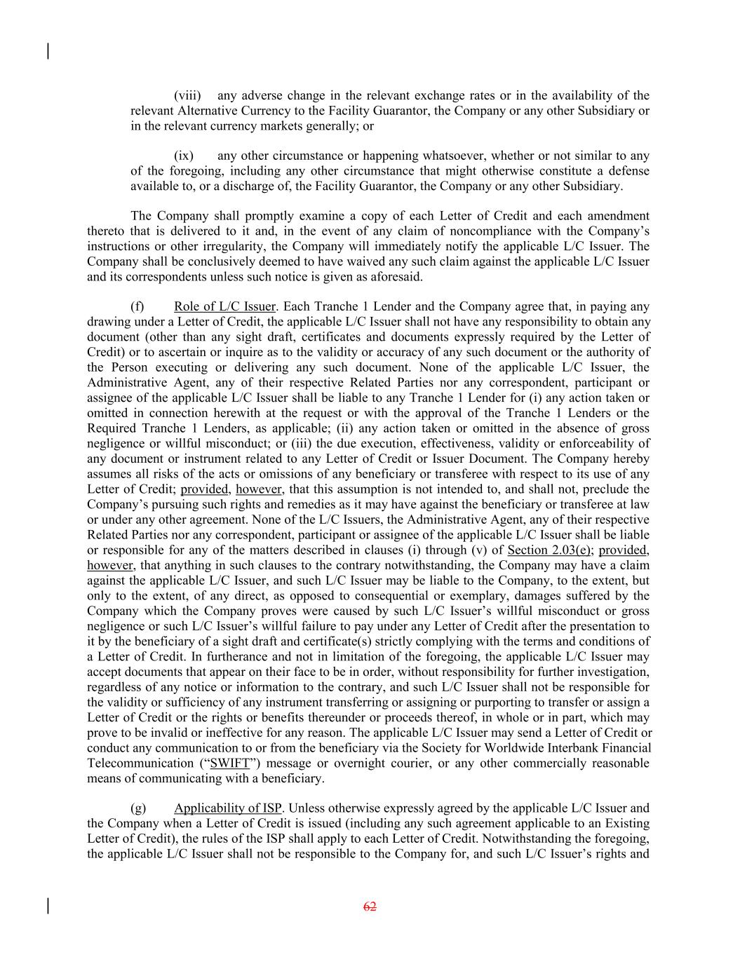(viii) any adverse change in the relevant exchange rates or in the availability of the relevant Alternative Currency to the Facility Guarantor, the Company or any other Subsidiary or in the relevant currency markets generally; or (ix) any other circumstance or happening whatsoever, whether or not similar to any of the foregoing, including any other circumstance that might otherwise constitute a defense available to, or a discharge of, the Facility Guarantor, the Company or any other Subsidiary. The Company shall promptly examine a copy of each Letter of Credit and each amendment thereto that is delivered to it and, in the event of any claim of noncompliance with the Company’s instructions or other irregularity, the Company will immediately notify the applicable L/C Issuer. The Company shall be conclusively deemed to have waived any such claim against the applicable L/C Issuer and its correspondents unless such notice is given as aforesaid. (f) Role of L/C Issuer. Each Tranche 1 Lender and the Company agree that, in paying any drawing under a Letter of Credit, the applicable L/C Issuer shall not have any responsibility to obtain any document (other than any sight draft, certificates and documents expressly required by the Letter of Credit) or to ascertain or inquire as to the validity or accuracy of any such document or the authority of the Person executing or delivering any such document. None of the applicable L/C Issuer, the Administrative Agent, any of their respective Related Parties nor any correspondent, participant or assignee of the applicable L/C Issuer shall be liable to any Tranche 1 Lender for (i) any action taken or omitted in connection herewith at the request or with the approval of the Tranche 1 Lenders or the Required Tranche 1 Lenders, as applicable; (ii) any action taken or omitted in the absence of gross negligence or willful misconduct; or (iii) the due execution, effectiveness, validity or enforceability of any document or instrument related to any Letter of Credit or Issuer Document. The Company hereby assumes all risks of the acts or omissions of any beneficiary or transferee with respect to its use of any Letter of Credit; provided, however, that this assumption is not intended to, and shall not, preclude the Company’s pursuing such rights and remedies as it may have against the beneficiary or transferee at law or under any other agreement. None of the L/C Issuers, the Administrative Agent, any of their respective Related Parties nor any correspondent, participant or assignee of the applicable L/C Issuer shall be liable or responsible for any of the matters described in clauses (i) through (v) of Section 2.03(e); provided, however, that anything in such clauses to the contrary notwithstanding, the Company may have a claim against the applicable L/C Issuer, and such L/C Issuer may be liable to the Company, to the extent, but only to the extent, of any direct, as opposed to consequential or exemplary, damages suffered by the Company which the Company proves were caused by such L/C Issuer’s willful misconduct or gross negligence or such L/C Issuer’s willful failure to pay under any Letter of Credit after the presentation to it by the beneficiary of a sight draft and certificate(s) strictly complying with the terms and conditions of a Letter of Credit. In furtherance and not in limitation of the foregoing, the applicable L/C Issuer may accept documents that appear on their face to be in order, without responsibility for further investigation, regardless of any notice or information to the contrary, and such L/C Issuer shall not be responsible for the validity or sufficiency of any instrument transferring or assigning or purporting to transfer or assign a Letter of Credit or the rights or benefits thereunder or proceeds thereof, in whole or in part, which may prove to be invalid or ineffective for any reason. The applicable L/C Issuer may send a Letter of Credit or conduct any communication to or from the beneficiary via the Society for Worldwide Interbank Financial Telecommunication (“SWIFT”) message or overnight courier, or any other commercially reasonable means of communicating with a beneficiary. (g) Applicability of ISP. Unless otherwise expressly agreed by the applicable L/C Issuer and the Company when a Letter of Credit is issued (including any such agreement applicable to an Existing Letter of Credit), the rules of the ISP shall apply to each Letter of Credit. Notwithstanding the foregoing, the applicable L/C Issuer shall not be responsible to the Company for, and such L/C Issuer’s rights and 62