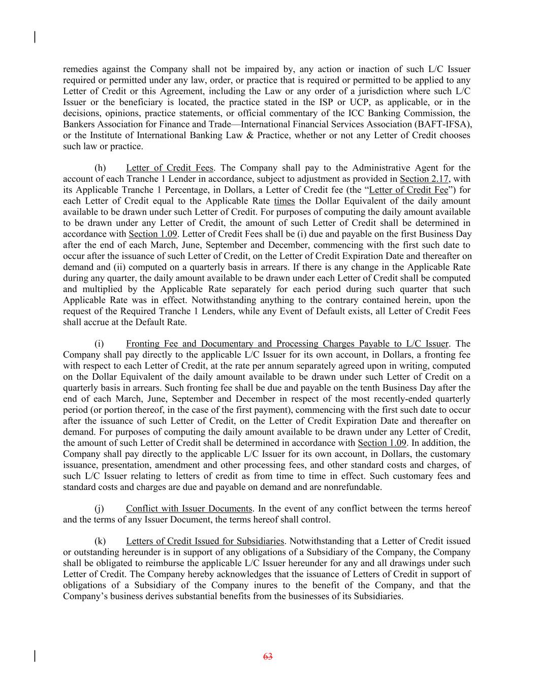 remedies against the Company shall not be impaired by, any action or inaction of such L/C Issuer required or permitted under any law, order, or practice that is required or permitted to be applied to any Letter of Credit or this Agreement, including the Law or any order of a jurisdiction where such L/C Issuer or the beneficiary is located, the practice stated in the ISP or UCP, as applicable, or in the decisions, opinions, practice statements, or official commentary of the ICC Banking Commission, the Bankers Association for Finance and Trade—International Financial Services Association (BAFT-IFSA), or the Institute of International Banking Law & Practice, whether or not any Letter of Credit chooses such law or practice. (h) Letter of Credit Fees. The Company shall pay to the Administrative Agent for the account of each Tranche 1 Lender in accordance, subject to adjustment as provided in Section 2.17, with its Applicable Tranche 1 Percentage, in Dollars, a Letter of Credit fee (the “Letter of Credit Fee”) for each Letter of Credit equal to the Applicable Rate times the Dollar Equivalent of the daily amount available to be drawn under such Letter of Credit. For purposes of computing the daily amount available to be drawn under any Letter of Credit, the amount of such Letter of Credit shall be determined in accordance with Section 1.09. Letter of Credit Fees shall be (i) due and payable on the first Business Day after the end of each March, June, September and December, commencing with the first such date to occur after the issuance of such Letter of Credit, on the Letter of Credit Expiration Date and thereafter on demand and (ii) computed on a quarterly basis in arrears. If there is any change in the Applicable Rate during any quarter, the daily amount available to be drawn under each Letter of Credit shall be computed and multiplied by the Applicable Rate separately for each period during such quarter that such Applicable Rate was in effect. Notwithstanding anything to the contrary contained herein, upon the request of the Required Tranche 1 Lenders, while any Event of Default exists, all Letter of Credit Fees shall accrue at the Default Rate. (i) Fronting Fee and Documentary and Processing Charges Payable to L/C Issuer. The Company shall pay directly to the applicable L/C Issuer for its own account, in Dollars, a fronting fee with respect to each Letter of Credit, at the rate per annum separately agreed upon in writing, computed on the Dollar Equivalent of the daily amount available to be drawn under such Letter of Credit on a quarterly basis in arrears. Such fronting fee shall be due and payable on the tenth Business Day after the end of each March, June, September and December in respect of the most recently-ended quarterly period (or portion thereof, in the case of the first payment), commencing with the first such date to occur after the issuance of such Letter of Credit, on the Letter of Credit Expiration Date and thereafter on demand. For purposes of computing the daily amount available to be drawn under any Letter of Credit, the amount of such Letter of Credit shall be determined in accordance with Section 1.09. In addition, the Company shall pay directly to the applicable L/C Issuer for its own account, in Dollars, the customary issuance, presentation, amendment and other processing fees, and other standard costs and charges, of such L/C Issuer relating to letters of credit as from time to time in effect. Such customary fees and standard costs and charges are due and payable on demand and are nonrefundable. (j) Conflict with Issuer Documents. In the event of any conflict between the terms hereof and the terms of any Issuer Document, the terms hereof shall control. (k) Letters of Credit Issued for Subsidiaries. Notwithstanding that a Letter of Credit issued or outstanding hereunder is in support of any obligations of a Subsidiary of the Company, the Company shall be obligated to reimburse the applicable L/C Issuer hereunder for any and all drawings under such Letter of Credit. The Company hereby acknowledges that the issuance of Letters of Credit in support of obligations of a Subsidiary of the Company inures to the benefit of the Company, and that the Company’s business derives substantial benefits from the businesses of its Subsidiaries. 63