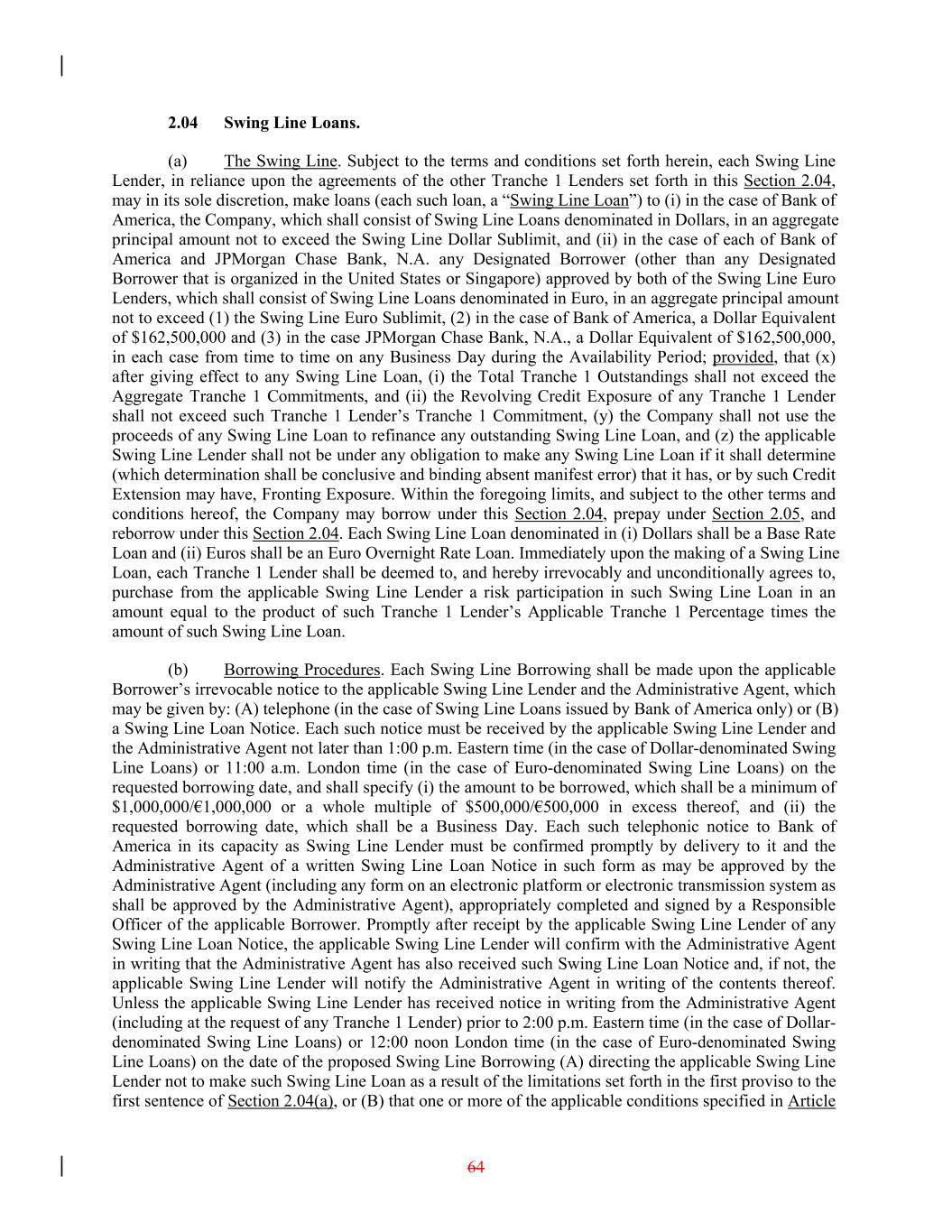 2.04 Swing Line Loans. (a) The Swing Line. Subject to the terms and conditions set forth herein, each Swing Line Lender, in reliance upon the agreements of the other Tranche 1 Lenders set forth in this Section 2.04, may in its sole discretion, make loans (each such loan, a “Swing Line Loan”) to (i) in the case of Bank of America, the Company, which shall consist of Swing Line Loans denominated in Dollars, in an aggregate principal amount not to exceed the Swing Line Dollar Sublimit, and (ii) in the case of each of Bank of America and JPMorgan Chase Bank, N.A. any Designated Borrower (other than any Designated Borrower that is organized in the United States or Singapore) approved by both of the Swing Line Euro Lenders, which shall consist of Swing Line Loans denominated in Euro, in an aggregate principal amount not to exceed (1) the Swing Line Euro Sublimit, (2) in the case of Bank of America, a Dollar Equivalent of $162,500,000 and (3) in the case JPMorgan Chase Bank, N.A., a Dollar Equivalent of $162,500,000, in each case from time to time on any Business Day during the Availability Period; provided, that (x) after giving effect to any Swing Line Loan, (i) the Total Tranche 1 Outstandings shall not exceed the Aggregate Tranche 1 Commitments, and (ii) the Revolving Credit Exposure of any Tranche 1 Lender shall not exceed such Tranche 1 Lender’s Tranche 1 Commitment, (y) the Company shall not use the proceeds of any Swing Line Loan to refinance any outstanding Swing Line Loan, and (z) the applicable Swing Line Lender shall not be under any obligation to make any Swing Line Loan if it shall determine (which determination shall be conclusive and binding absent manifest error) that it has, or by such Credit Extension may have, Fronting Exposure. Within the foregoing limits, and subject to the other terms and conditions hereof, the Company may borrow under this Section 2.04, prepay under Section 2.05, and reborrow under this Section 2.04. Each Swing Line Loan denominated in (i) Dollars shall be a Base Rate Loan and (ii) Euros shall be an Euro Overnight Rate Loan. Immediately upon the making of a Swing Line Loan, each Tranche 1 Lender shall be deemed to, and hereby irrevocably and unconditionally agrees to, purchase from the applicable Swing Line Lender a risk participation in such Swing Line Loan in an amount equal to the product of such Tranche 1 Lender’s Applicable Tranche 1 Percentage times the amount of such Swing Line Loan. (b) Borrowing Procedures. Each Swing Line Borrowing shall be made upon the applicable Borrower’s irrevocable notice to the applicable Swing Line Lender and the Administrative Agent, which may be given by: (A) telephone (in the case of Swing Line Loans issued by Bank of America only) or (B) a Swing Line Loan Notice. Each such notice must be received by the applicable Swing Line Lender and the Administrative Agent not later than 1:00 p.m. Eastern time (in the case of Dollar-denominated Swing Line Loans) or 11:00 a.m. London time (in the case of Euro-denominated Swing Line Loans) on the requested borrowing date, and shall specify (i) the amount to be borrowed, which shall be a minimum of $1,000,000/€1,000,000 or a whole multiple of $500,000/€500,000 in excess thereof, and (ii) the requested borrowing date, which shall be a Business Day. Each such telephonic notice to Bank of America in its capacity as Swing Line Lender must be confirmed promptly by delivery to it and the Administrative Agent of a written Swing Line Loan Notice in such form as may be approved by the Administrative Agent (including any form on an electronic platform or electronic transmission system as shall be approved by the Administrative Agent), appropriately completed and signed by a Responsible Officer of the applicable Borrower. Promptly after receipt by the applicable Swing Line Lender of any Swing Line Loan Notice, the applicable Swing Line Lender will confirm with the Administrative Agent in writing that the Administrative Agent has also received such Swing Line Loan Notice and, if not, the applicable Swing Line Lender will notify the Administrative Agent in writing of the contents thereof. Unless the applicable Swing Line Lender has received notice in writing from the Administrative Agent (including at the request of any Tranche 1 Lender) prior to 2:00 p.m. Eastern time (in the case of Dollar- denominated Swing Line Loans) or 12:00 noon London time (in the case of Euro-denominated Swing Line Loans) on the date of the proposed Swing Line Borrowing (A) directing the applicable Swing Line Lender not to make such Swing Line Loan as a result of the limitations set forth in the first proviso to the first sentence of Section 2.04(a), or (B) that one or more of the applicable conditions specified in Article 64