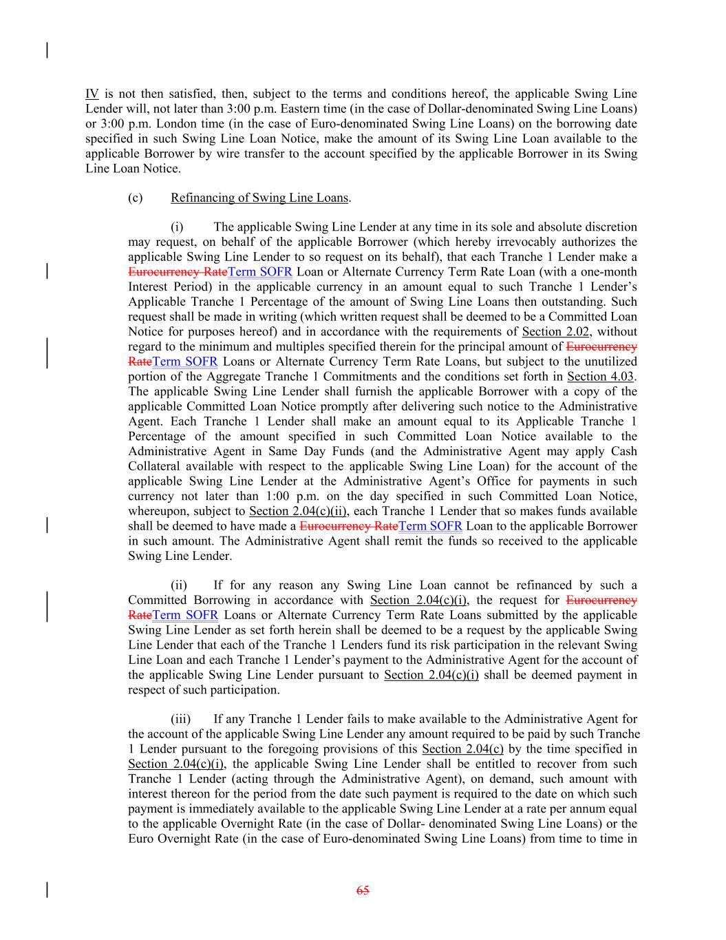 IV is not then satisfied, then, subject to the terms and conditions hereof, the applicable Swing Line Lender will, not later than 3:00 p.m. Eastern time (in the case of Dollar-denominated Swing Line Loans) or 3:00 p.m. London time (in the case of Euro-denominated Swing Line Loans) on the borrowing date specified in such Swing Line Loan Notice, make the amount of its Swing Line Loan available to the applicable Borrower by wire transfer to the account specified by the applicable Borrower in its Swing Line Loan Notice. (c) Refinancing of Swing Line Loans. (i) The applicable Swing Line Lender at any time in its sole and absolute discretion may request, on behalf of the applicable Borrower (which hereby irrevocably authorizes the applicable Swing Line Lender to so request on its behalf), that each Tranche 1 Lender make a Eurocurrency RateTerm SOFR Loan or Alternate Currency Term Rate Loan (with a one-month Interest Period) in the applicable currency in an amount equal to such Tranche 1 Lender’s Applicable Tranche 1 Percentage of the amount of Swing Line Loans then outstanding. Such request shall be made in writing (which written request shall be deemed to be a Committed Loan Notice for purposes hereof) and in accordance with the requirements of Section 2.02, without regard to the minimum and multiples specified therein for the principal amount of Eurocurrency RateTerm SOFR Loans or Alternate Currency Term Rate Loans, but subject to the unutilized portion of the Aggregate Tranche 1 Commitments and the conditions set forth in Section 4.03. The applicable Swing Line Lender shall furnish the applicable Borrower with a copy of the applicable Committed Loan Notice promptly after delivering such notice to the Administrative Agent. Each Tranche 1 Lender shall make an amount equal to its Applicable Tranche 1 Percentage of the amount specified in such Committed Loan Notice available to the Administrative Agent in Same Day Funds (and the Administrative Agent may apply Cash Collateral available with respect to the applicable Swing Line Loan) for the account of the applicable Swing Line Lender at the Administrative Agent’s Office for payments in such currency not later than 1:00 p.m. on the day specified in such Committed Loan Notice, whereupon, subject to Section 2.04(c)(ii), each Tranche 1 Lender that so makes funds available shall be deemed to have made a Eurocurrency RateTerm SOFR Loan to the applicable Borrower in such amount. The Administrative Agent shall remit the funds so received to the applicable Swing Line Lender. (ii) If for any reason any Swing Line Loan cannot be refinanced by such a Committed Borrowing in accordance with Section 2.04(c)(i), the request for Eurocurrency RateTerm SOFR Loans or Alternate Currency Term Rate Loans submitted by the applicable Swing Line Lender as set forth herein shall be deemed to be a request by the applicable Swing Line Lender that each of the Tranche 1 Lenders fund its risk participation in the relevant Swing Line Loan and each Tranche 1 Lender’s payment to the Administrative Agent for the account of the applicable Swing Line Lender pursuant to Section 2.04(c)(i) shall be deemed payment in respect of such participation. (iii) If any Tranche 1 Lender fails to make available to the Administrative Agent for the account of the applicable Swing Line Lender any amount required to be paid by such Tranche 1 Lender pursuant to the foregoing provisions of this Section 2.04(c) by the time specified in Section 2.04(c)(i), the applicable Swing Line Lender shall be entitled to recover from such Tranche 1 Lender (acting through the Administrative Agent), on demand, such amount with interest thereon for the period from the date such payment is required to the date on which such payment is immediately available to the applicable Swing Line Lender at a rate per annum equal to the applicable Overnight Rate (in the case of Dollar- denominated Swing Line Loans) or the Euro Overnight Rate (in the case of Euro-denominated Swing Line Loans) from time to time in 65