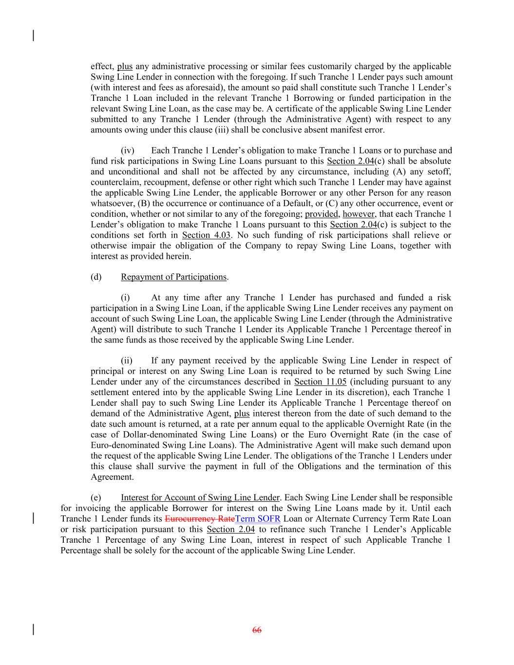 effect, plus any administrative processing or similar fees customarily charged by the applicable Swing Line Lender in connection with the foregoing. If such Tranche 1 Lender pays such amount (with interest and fees as aforesaid), the amount so paid shall constitute such Tranche 1 Lender’s Tranche 1 Loan included in the relevant Tranche 1 Borrowing or funded participation in the relevant Swing Line Loan, as the case may be. A certificate of the applicable Swing Line Lender submitted to any Tranche 1 Lender (through the Administrative Agent) with respect to any amounts owing under this clause (iii) shall be conclusive absent manifest error. (iv) Each Tranche 1 Lender’s obligation to make Tranche 1 Loans or to purchase and fund risk participations in Swing Line Loans pursuant to this Section 2.04(c) shall be absolute and unconditional and shall not be affected by any circumstance, including (A) any setoff, counterclaim, recoupment, defense or other right which such Tranche 1 Lender may have against the applicable Swing Line Lender, the applicable Borrower or any other Person for any reason whatsoever, (B) the occurrence or continuance of a Default, or (C) any other occurrence, event or condition, whether or not similar to any of the foregoing; provided, however, that each Tranche 1 Lender’s obligation to make Tranche 1 Loans pursuant to this Section 2.04(c) is subject to the conditions set forth in Section 4.03. No such funding of risk participations shall relieve or otherwise impair the obligation of the Company to repay Swing Line Loans, together with interest as provided herein. (d) Repayment of Participations. (i) At any time after any Tranche 1 Lender has purchased and funded a risk participation in a Swing Line Loan, if the applicable Swing Line Lender receives any payment on account of such Swing Line Loan, the applicable Swing Line Lender (through the Administrative Agent) will distribute to such Tranche 1 Lender its Applicable Tranche 1 Percentage thereof in the same funds as those received by the applicable Swing Line Lender. (ii) If any payment received by the applicable Swing Line Lender in respect of principal or interest on any Swing Line Loan is required to be returned by such Swing Line Lender under any of the circumstances described in Section 11.05 (including pursuant to any settlement entered into by the applicable Swing Line Lender in its discretion), each Tranche 1 Lender shall pay to such Swing Line Lender its Applicable Tranche 1 Percentage thereof on demand of the Administrative Agent, plus interest thereon from the date of such demand to the date such amount is returned, at a rate per annum equal to the applicable Overnight Rate (in the case of Dollar-denominated Swing Line Loans) or the Euro Overnight Rate (in the case of Euro-denominated Swing Line Loans). The Administrative Agent will make such demand upon the request of the applicable Swing Line Lender. The obligations of the Tranche 1 Lenders under this clause shall survive the payment in full of the Obligations and the termination of this Agreement. (e) Interest for Account of Swing Line Lender. Each Swing Line Lender shall be responsible for invoicing the applicable Borrower for interest on the Swing Line Loans made by it. Until each Tranche 1 Lender funds its Eurocurrency RateTerm SOFR Loan or Alternate Currency Term Rate Loan or risk participation pursuant to this Section 2.04 to refinance such Tranche 1 Lender’s Applicable Tranche 1 Percentage of any Swing Line Loan, interest in respect of such Applicable Tranche 1 Percentage shall be solely for the account of the applicable Swing Line Lender. 66