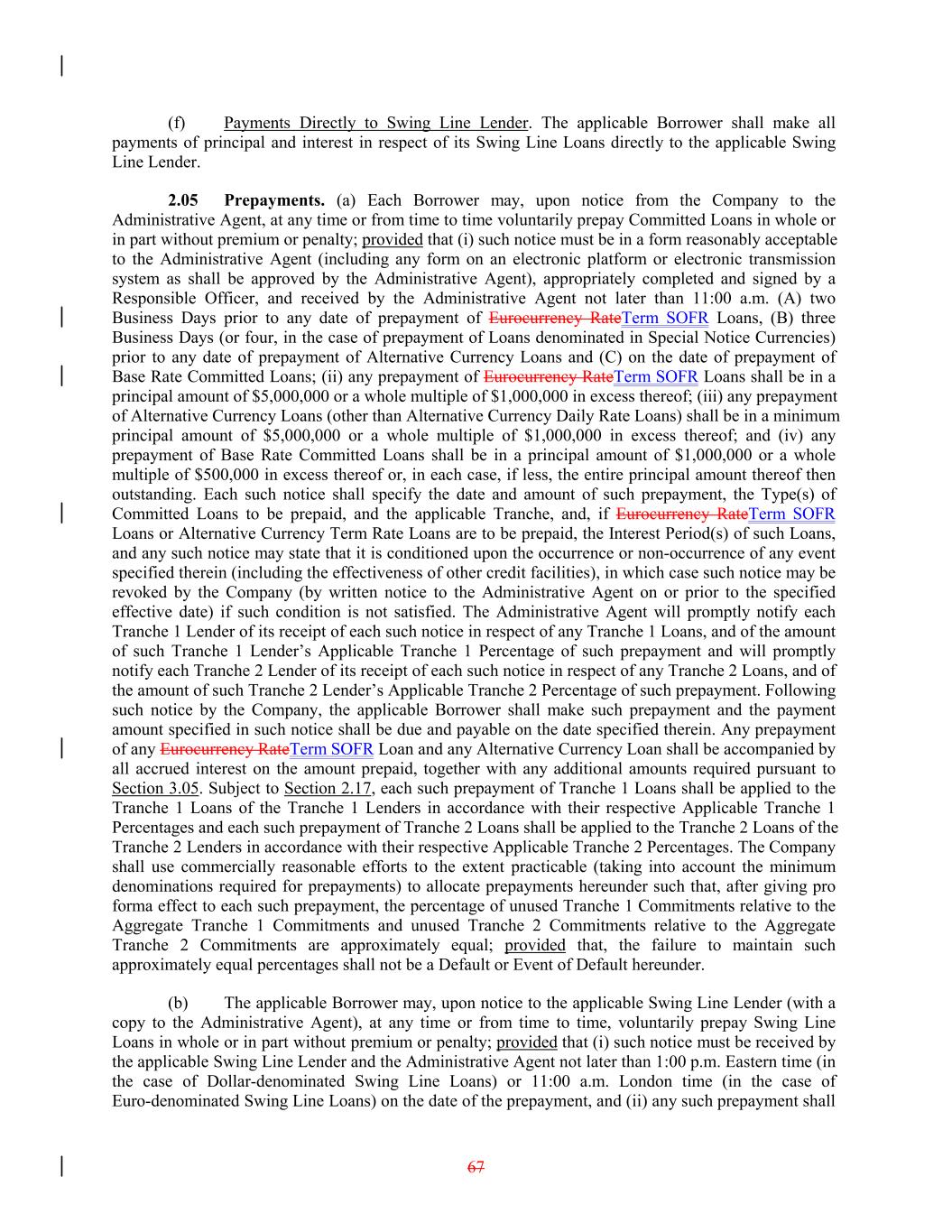(f) Payments Directly to Swing Line Lender. The applicable Borrower shall make all payments of principal and interest in respect of its Swing Line Loans directly to the applicable Swing Line Lender. 2.05 Prepayments. (a) Each Borrower may, upon notice from the Company to the Administrative Agent, at any time or from time to time voluntarily prepay Committed Loans in whole or in part without premium or penalty; provided that (i) such notice must be in a form reasonably acceptable to the Administrative Agent (including any form on an electronic platform or electronic transmission system as shall be approved by the Administrative Agent), appropriately completed and signed by a Responsible Officer, and received by the Administrative Agent not later than 11:00 a.m. (A) two Business Days prior to any date of prepayment of Eurocurrency RateTerm SOFR Loans, (B) three Business Days (or four, in the case of prepayment of Loans denominated in Special Notice Currencies) prior to any date of prepayment of Alternative Currency Loans and (C) on the date of prepayment of Base Rate Committed Loans; (ii) any prepayment of Eurocurrency RateTerm SOFR Loans shall be in a principal amount of $5,000,000 or a whole multiple of $1,000,000 in excess thereof; (iii) any prepayment of Alternative Currency Loans (other than Alternative Currency Daily Rate Loans) shall be in a minimum principal amount of $5,000,000 or a whole multiple of $1,000,000 in excess thereof; and (iv) any prepayment of Base Rate Committed Loans shall be in a principal amount of $1,000,000 or a whole multiple of $500,000 in excess thereof or, in each case, if less, the entire principal amount thereof then outstanding. Each such notice shall specify the date and amount of such prepayment, the Type(s) of Committed Loans to be prepaid, and the applicable Tranche, and, if Eurocurrency RateTerm SOFR Loans or Alternative Currency Term Rate Loans are to be prepaid, the Interest Period(s) of such Loans, and any such notice may state that it is conditioned upon the occurrence or non-occurrence of any event specified therein (including the effectiveness of other credit facilities), in which case such notice may be revoked by the Company (by written notice to the Administrative Agent on or prior to the specified effective date) if such condition is not satisfied. The Administrative Agent will promptly notify each Tranche 1 Lender of its receipt of each such notice in respect of any Tranche 1 Loans, and of the amount of such Tranche 1 Lender’s Applicable Tranche 1 Percentage of such prepayment and will promptly notify each Tranche 2 Lender of its receipt of each such notice in respect of any Tranche 2 Loans, and of the amount of such Tranche 2 Lender’s Applicable Tranche 2 Percentage of such prepayment. Following such notice by the Company, the applicable Borrower shall make such prepayment and the payment amount specified in such notice shall be due and payable on the date specified therein. Any prepayment of any Eurocurrency RateTerm SOFR Loan and any Alternative Currency Loan shall be accompanied by all accrued interest on the amount prepaid, together with any additional amounts required pursuant to Section 3.05. Subject to Section 2.17, each such prepayment of Tranche 1 Loans shall be applied to the Tranche 1 Loans of the Tranche 1 Lenders in accordance with their respective Applicable Tranche 1 Percentages and each such prepayment of Tranche 2 Loans shall be applied to the Tranche 2 Loans of the Tranche 2 Lenders in accordance with their respective Applicable Tranche 2 Percentages. The Company shall use commercially reasonable efforts to the extent practicable (taking into account the minimum denominations required for prepayments) to allocate prepayments hereunder such that, after giving pro forma effect to each such prepayment, the percentage of unused Tranche 1 Commitments relative to the Aggregate Tranche 1 Commitments and unused Tranche 2 Commitments relative to the Aggregate Tranche 2 Commitments are approximately equal; provided that, the failure to maintain such approximately equal percentages shall not be a Default or Event of Default hereunder. (b) The applicable Borrower may, upon notice to the applicable Swing Line Lender (with a copy to the Administrative Agent), at any time or from time to time, voluntarily prepay Swing Line Loans in whole or in part without premium or penalty; provided that (i) such notice must be received by the applicable Swing Line Lender and the Administrative Agent not later than 1:00 p.m. Eastern time (in the case of Dollar-denominated Swing Line Loans) or 11:00 a.m. London time (in the case of Euro-denominated Swing Line Loans) on the date of the prepayment, and (ii) any such prepayment shall 67