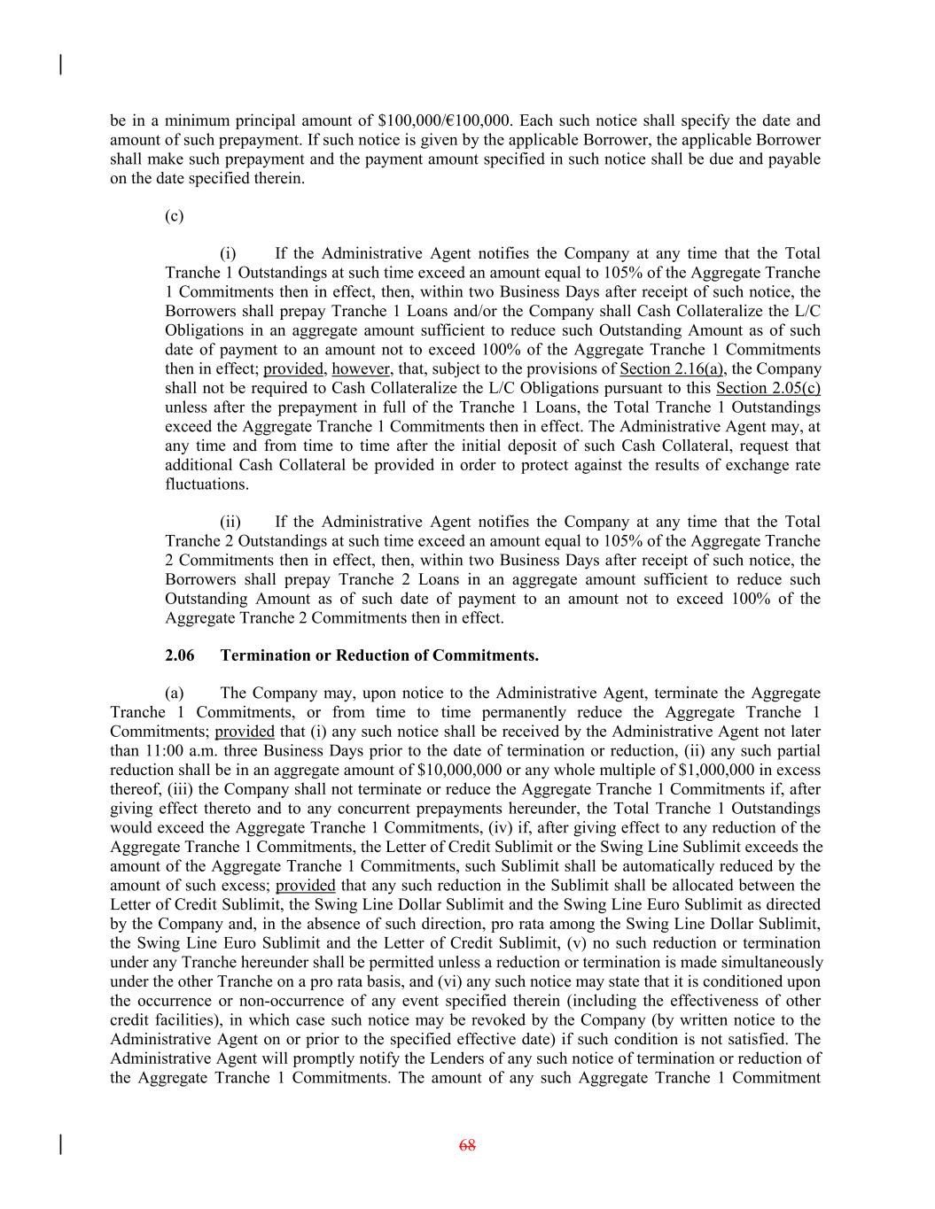 be in a minimum principal amount of $100,000/€100,000. Each such notice shall specify the date and amount of such prepayment. If such notice is given by the applicable Borrower, the applicable Borrower shall make such prepayment and the payment amount specified in such notice shall be due and payable on the date specified therein. (c) (i) If the Administrative Agent notifies the Company at any time that the Total Tranche 1 Outstandings at such time exceed an amount equal to 105% of the Aggregate Tranche 1 Commitments then in effect, then, within two Business Days after receipt of such notice, the Borrowers shall prepay Tranche 1 Loans and/or the Company shall Cash Collateralize the L/C Obligations in an aggregate amount sufficient to reduce such Outstanding Amount as of such date of payment to an amount not to exceed 100% of the Aggregate Tranche 1 Commitments then in effect; provided, however, that, subject to the provisions of Section 2.16(a), the Company shall not be required to Cash Collateralize the L/C Obligations pursuant to this Section 2.05(c) unless after the prepayment in full of the Tranche 1 Loans, the Total Tranche 1 Outstandings exceed the Aggregate Tranche 1 Commitments then in effect. The Administrative Agent may, at any time and from time to time after the initial deposit of such Cash Collateral, request that additional Cash Collateral be provided in order to protect against the results of exchange rate fluctuations. (ii) If the Administrative Agent notifies the Company at any time that the Total Tranche 2 Outstandings at such time exceed an amount equal to 105% of the Aggregate Tranche 2 Commitments then in effect, then, within two Business Days after receipt of such notice, the Borrowers shall prepay Tranche 2 Loans in an aggregate amount sufficient to reduce such Outstanding Amount as of such date of payment to an amount not to exceed 100% of the Aggregate Tranche 2 Commitments then in effect. 2.06 Termination or Reduction of Commitments. (a) The Company may, upon notice to the Administrative Agent, terminate the Aggregate Tranche 1 Commitments, or from time to time permanently reduce the Aggregate Tranche 1 Commitments; provided that (i) any such notice shall be received by the Administrative Agent not later than 11:00 a.m. three Business Days prior to the date of termination or reduction, (ii) any such partial reduction shall be in an aggregate amount of $10,000,000 or any whole multiple of $1,000,000 in excess thereof, (iii) the Company shall not terminate or reduce the Aggregate Tranche 1 Commitments if, after giving effect thereto and to any concurrent prepayments hereunder, the Total Tranche 1 Outstandings would exceed the Aggregate Tranche 1 Commitments, (iv) if, after giving effect to any reduction of the Aggregate Tranche 1 Commitments, the Letter of Credit Sublimit or the Swing Line Sublimit exceeds the amount of the Aggregate Tranche 1 Commitments, such Sublimit shall be automatically reduced by the amount of such excess; provided that any such reduction in the Sublimit shall be allocated between the Letter of Credit Sublimit, the Swing Line Dollar Sublimit and the Swing Line Euro Sublimit as directed by the Company and, in the absence of such direction, pro rata among the Swing Line Dollar Sublimit, the Swing Line Euro Sublimit and the Letter of Credit Sublimit, (v) no such reduction or termination under any Tranche hereunder shall be permitted unless a reduction or termination is made simultaneously under the other Tranche on a pro rata basis, and (vi) any such notice may state that it is conditioned upon the occurrence or non-occurrence of any event specified therein (including the effectiveness of other credit facilities), in which case such notice may be revoked by the Company (by written notice to the Administrative Agent on or prior to the specified effective date) if such condition is not satisfied. The Administrative Agent will promptly notify the Lenders of any such notice of termination or reduction of the Aggregate Tranche 1 Commitments. The amount of any such Aggregate Tranche 1 Commitment 68