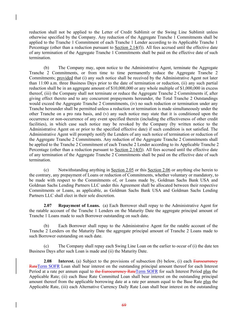 reduction shall not be applied to the Letter of Credit Sublimit or the Swing Line Sublimit unless otherwise specified by the Company. Any reduction of the Aggregate Tranche 1 Commitments shall be applied to the Tranche 1 Commitment of each Tranche 1 Lender according to its Applicable Tranche 1 Percentage (other than a reduction pursuant to Section 2.14(f)). All fees accrued until the effective date of any termination of the Aggregate Tranche 1 Commitments shall be paid on the effective date of such termination. (b) The Company may, upon notice to the Administrative Agent, terminate the Aggregate Tranche 2 Commitments, or from time to time permanently reduce the Aggregate Tranche 2 Commitments; provided that (i) any such notice shall be received by the Administrative Agent not later than 11:00 a.m. three Business Days prior to the date of termination or reduction, (ii) any such partial reduction shall be in an aggregate amount of $10,000,000 or any whole multiple of $1,000,000 in excess thereof, (iii) the Company shall not terminate or reduce the Aggregate Tranche 2 Commitments if, after giving effect thereto and to any concurrent prepayments hereunder, the Total Tranche 2 Outstandings would exceed the Aggregate Tranche 2 Commitments, (iv) no such reduction or termination under any Tranche hereunder shall be permitted unless a reduction or termination is made simultaneously under the other Tranche on a pro rata basis, and (v) any such notice may state that it is conditioned upon the occurrence or non-occurrence of any event specified therein (including the effectiveness of other credit facilities), in which case such notice may be revoked by the Company (by written notice to the Administrative Agent on or prior to the specified effective date) if such condition is not satisfied. The Administrative Agent will promptly notify the Lenders of any such notice of termination or reduction of the Aggregate Tranche 2 Commitments. Any reduction of the Aggregate Tranche 2 Commitments shall be applied to the Tranche 2 Commitment of each Tranche 2 Lender according to its Applicable Tranche 2 Percentage (other than a reduction pursuant to Section 2.14(f)). All fees accrued until the effective date of any termination of the Aggregate Tranche 2 Commitments shall be paid on the effective date of such termination. (c) Notwithstanding anything in Section 2.05 or this Section 2.06 or anything else herein to the contrary, any prepayment of Loans or reduction of Commitments, whether voluntary or mandatory, to be made with respect to the Commitments of, or Loans made by, Goldman Sachs Bank USA and Goldman Sachs Lending Partners LLC under this Agreement shall be allocated between their respective Commitments or Loans, as applicable, as Goldman Sachs Bank USA and Goldman Sachs Lending Partners LLC shall elect in their sole discretion. 2.07 Repayment of Loans. (a) Each Borrower shall repay to the Administrative Agent for the ratable account of the Tranche 1 Lenders on the Maturity Date the aggregate principal amount of Tranche 1 Loans made to such Borrower outstanding on such date. (b) Each Borrower shall repay to the Administrative Agent for the ratable account of the Tranche 2 Lenders on the Maturity Date the aggregate principal amount of Tranche 2 Loans made to such Borrower outstanding on such date. (c) The Company shall repay each Swing Line Loan on the earlier to occur of (i) the date ten Business Days after such Loan is made and (ii) the Maturity Date. 2.08 Interest. (a) Subject to the provisions of subsection (b) below, (i) each Eurocurrency RateTerm SOFR Loan shall bear interest on the outstanding principal amount thereof for each Interest Period at a rate per annum equal to the Eurocurrency RateTerm SOFR for such Interest Period plus the Applicable Rate; (ii) each Base Rate Committed Loan shall bear interest on the outstanding principal amount thereof from the applicable borrowing date at a rate per annum equal to the Base Rate plus the Applicable Rate, (iii) each Alternative Currency Daily Rate Loan shall bear interest on the outstanding 69