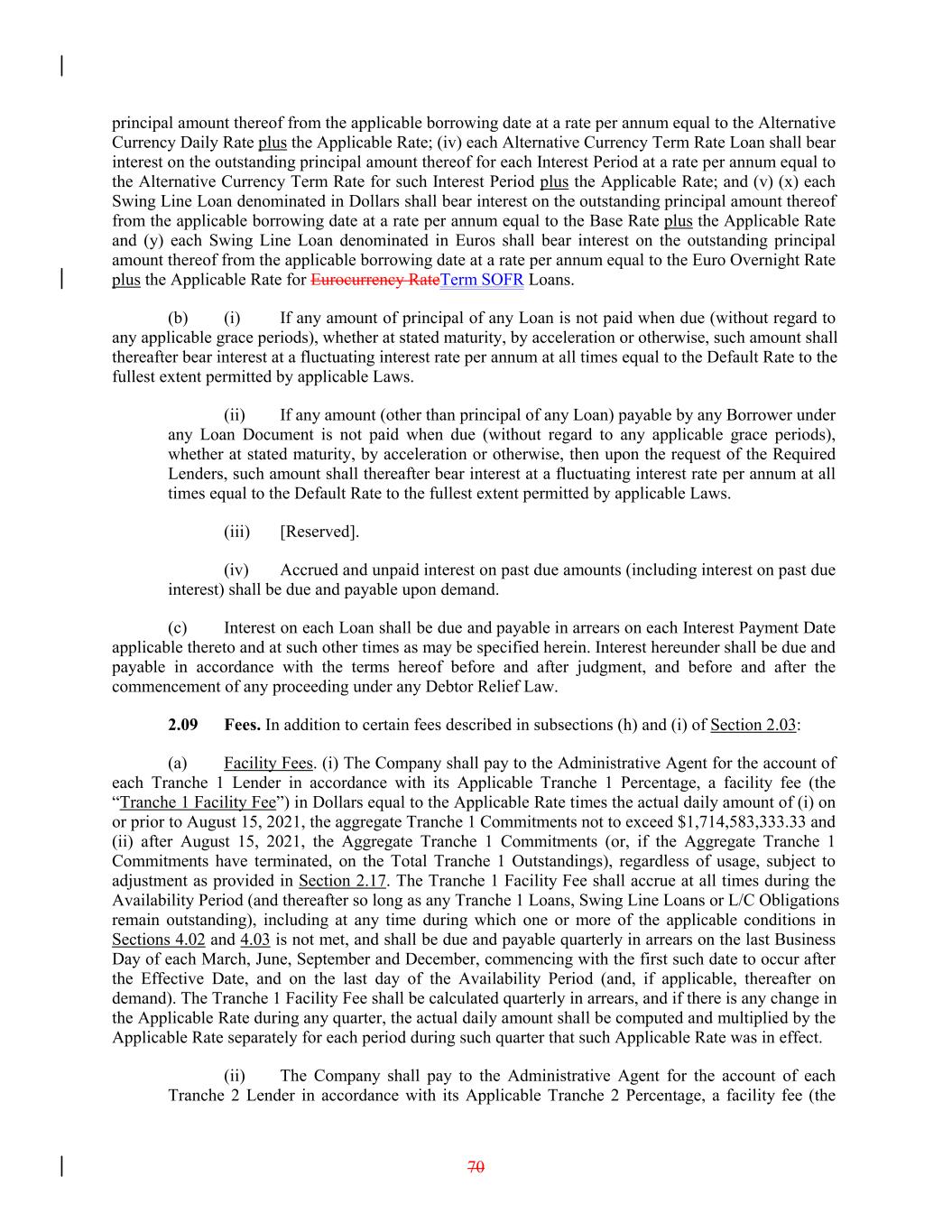 principal amount thereof from the applicable borrowing date at a rate per annum equal to the Alternative Currency Daily Rate plus the Applicable Rate; (iv) each Alternative Currency Term Rate Loan shall bear interest on the outstanding principal amount thereof for each Interest Period at a rate per annum equal to the Alternative Currency Term Rate for such Interest Period plus the Applicable Rate; and (v) (x) each Swing Line Loan denominated in Dollars shall bear interest on the outstanding principal amount thereof from the applicable borrowing date at a rate per annum equal to the Base Rate plus the Applicable Rate and (y) each Swing Line Loan denominated in Euros shall bear interest on the outstanding principal amount thereof from the applicable borrowing date at a rate per annum equal to the Euro Overnight Rate plus the Applicable Rate for Eurocurrency RateTerm SOFR Loans. (b) (i) If any amount of principal of any Loan is not paid when due (without regard to any applicable grace periods), whether at stated maturity, by acceleration or otherwise, such amount shall thereafter bear interest at a fluctuating interest rate per annum at all times equal to the Default Rate to the fullest extent permitted by applicable Laws. (ii) If any amount (other than principal of any Loan) payable by any Borrower under any Loan Document is not paid when due (without regard to any applicable grace periods), whether at stated maturity, by acceleration or otherwise, then upon the request of the Required Lenders, such amount shall thereafter bear interest at a fluctuating interest rate per annum at all times equal to the Default Rate to the fullest extent permitted by applicable Laws. (iii) [Reserved]. (iv) Accrued and unpaid interest on past due amounts (including interest on past due interest) shall be due and payable upon demand. (c) Interest on each Loan shall be due and payable in arrears on each Interest Payment Date applicable thereto and at such other times as may be specified herein. Interest hereunder shall be due and payable in accordance with the terms hereof before and after judgment, and before and after the commencement of any proceeding under any Debtor Relief Law. 2.09 Fees. In addition to certain fees described in subsections (h) and (i) of Section 2.03: (a) Facility Fees. (i) The Company shall pay to the Administrative Agent for the account of each Tranche 1 Lender in accordance with its Applicable Tranche 1 Percentage, a facility fee (the “Tranche 1 Facility Fee”) in Dollars equal to the Applicable Rate times the actual daily amount of (i) on or prior to August 15, 2021, the aggregate Tranche 1 Commitments not to exceed $1,714,583,333.33 and (ii) after August 15, 2021, the Aggregate Tranche 1 Commitments (or, if the Aggregate Tranche 1 Commitments have terminated, on the Total Tranche 1 Outstandings), regardless of usage, subject to adjustment as provided in Section 2.17. The Tranche 1 Facility Fee shall accrue at all times during the Availability Period (and thereafter so long as any Tranche 1 Loans, Swing Line Loans or L/C Obligations remain outstanding), including at any time during which one or more of the applicable conditions in Sections 4.02 and 4.03 is not met, and shall be due and payable quarterly in arrears on the last Business Day of each March, June, September and December, commencing with the first such date to occur after the Effective Date, and on the last day of the Availability Period (and, if applicable, thereafter on demand). The Tranche 1 Facility Fee shall be calculated quarterly in arrears, and if there is any change in the Applicable Rate during any quarter, the actual daily amount shall be computed and multiplied by the Applicable Rate separately for each period during such quarter that such Applicable Rate was in effect. (ii) The Company shall pay to the Administrative Agent for the account of each Tranche 2 Lender in accordance with its Applicable Tranche 2 Percentage, a facility fee (the 70