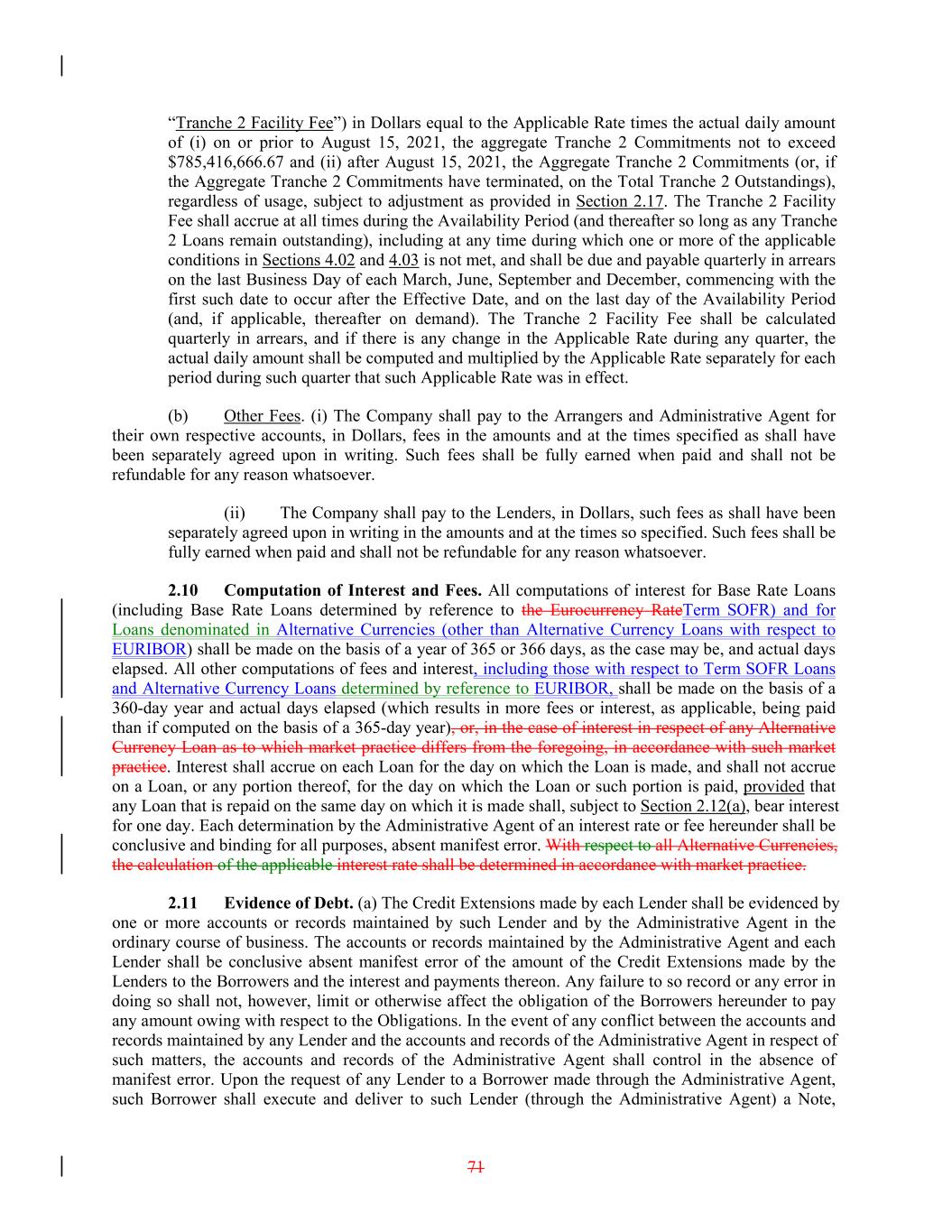“Tranche 2 Facility Fee”) in Dollars equal to the Applicable Rate times the actual daily amount of (i) on or prior to August 15, 2021, the aggregate Tranche 2 Commitments not to exceed $785,416,666.67 and (ii) after August 15, 2021, the Aggregate Tranche 2 Commitments (or, if the Aggregate Tranche 2 Commitments have terminated, on the Total Tranche 2 Outstandings), regardless of usage, subject to adjustment as provided in Section 2.17. The Tranche 2 Facility Fee shall accrue at all times during the Availability Period (and thereafter so long as any Tranche 2 Loans remain outstanding), including at any time during which one or more of the applicable conditions in Sections 4.02 and 4.03 is not met, and shall be due and payable quarterly in arrears on the last Business Day of each March, June, September and December, commencing with the first such date to occur after the Effective Date, and on the last day of the Availability Period (and, if applicable, thereafter on demand). The Tranche 2 Facility Fee shall be calculated quarterly in arrears, and if there is any change in the Applicable Rate during any quarter, the actual daily amount shall be computed and multiplied by the Applicable Rate separately for each period during such quarter that such Applicable Rate was in effect. (b) Other Fees. (i) The Company shall pay to the Arrangers and Administrative Agent for their own respective accounts, in Dollars, fees in the amounts and at the times specified as shall have been separately agreed upon in writing. Such fees shall be fully earned when paid and shall not be refundable for any reason whatsoever. (ii) The Company shall pay to the Lenders, in Dollars, such fees as shall have been separately agreed upon in writing in the amounts and at the times so specified. Such fees shall be fully earned when paid and shall not be refundable for any reason whatsoever. 2.10 Computation of Interest and Fees. All computations of interest for Base Rate Loans (including Base Rate Loans determined by reference to the Eurocurrency RateTerm SOFR) and for Loans denominated in Alternative Currencies (other than Alternative Currency Loans with respect to EURIBOR) shall be made on the basis of a year of 365 or 366 days, as the case may be, and actual days elapsed. All other computations of fees and interest, including those with respect to Term SOFR Loans and Alternative Currency Loans determined by reference to EURIBOR, shall be made on the basis of a 360-day year and actual days elapsed (which results in more fees or interest, as applicable, being paid than if computed on the basis of a 365-day year), or, in the case of interest in respect of any Alternative Currency Loan as to which market practice differs from the foregoing, in accordance with such market practice. Interest shall accrue on each Loan for the day on which the Loan is made, and shall not accrue on a Loan, or any portion thereof, for the day on which the Loan or such portion is paid, provided that any Loan that is repaid on the same day on which it is made shall, subject to Section 2.12(a), bear interest for one day. Each determination by the Administrative Agent of an interest rate or fee hereunder shall be conclusive and binding for all purposes, absent manifest error. With respect to all Alternative Currencies, the calculation of the applicable interest rate shall be determined in accordance with market practice. 2.11 Evidence of Debt. (a) The Credit Extensions made by each Lender shall be evidenced by one or more accounts or records maintained by such Lender and by the Administrative Agent in the ordinary course of business. The accounts or records maintained by the Administrative Agent and each Lender shall be conclusive absent manifest error of the amount of the Credit Extensions made by the Lenders to the Borrowers and the interest and payments thereon. Any failure to so record or any error in doing so shall not, however, limit or otherwise affect the obligation of the Borrowers hereunder to pay any amount owing with respect to the Obligations. In the event of any conflict between the accounts and records maintained by any Lender and the accounts and records of the Administrative Agent in respect of such matters, the accounts and records of the Administrative Agent shall control in the absence of manifest error. Upon the request of any Lender to a Borrower made through the Administrative Agent, such Borrower shall execute and deliver to such Lender (through the Administrative Agent) a Note, 71
