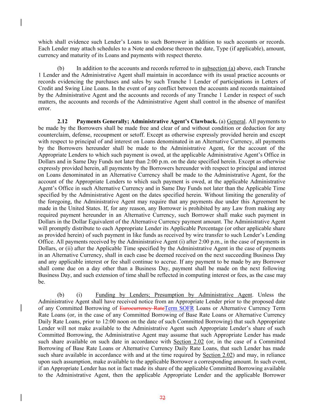 which shall evidence such Lender’s Loans to such Borrower in addition to such accounts or records. Each Lender may attach schedules to a Note and endorse thereon the date, Type (if applicable), amount, currency and maturity of its Loans and payments with respect thereto. (b) In addition to the accounts and records referred to in subsection (a) above, each Tranche 1 Lender and the Administrative Agent shall maintain in accordance with its usual practice accounts or records evidencing the purchases and sales by such Tranche 1 Lender of participations in Letters of Credit and Swing Line Loans. In the event of any conflict between the accounts and records maintained by the Administrative Agent and the accounts and records of any Tranche 1 Lender in respect of such matters, the accounts and records of the Administrative Agent shall control in the absence of manifest error. 2.12 Payments Generally; Administrative Agent’s Clawback. (a) General. All payments to be made by the Borrowers shall be made free and clear of and without condition or deduction for any counterclaim, defense, recoupment or setoff. Except as otherwise expressly provided herein and except with respect to principal of and interest on Loans denominated in an Alternative Currency, all payments by the Borrowers hereunder shall be made to the Administrative Agent, for the account of the Appropriate Lenders to which such payment is owed, at the applicable Administrative Agent’s Office in Dollars and in Same Day Funds not later than 2:00 p.m. on the date specified herein. Except as otherwise expressly provided herein, all payments by the Borrowers hereunder with respect to principal and interest on Loans denominated in an Alternative Currency shall be made to the Administrative Agent, for the account of the Appropriate Lenders to which such payment is owed, at the applicable Administrative Agent’s Office in such Alternative Currency and in Same Day Funds not later than the Applicable Time specified by the Administrative Agent on the dates specified herein. Without limiting the generality of the foregoing, the Administrative Agent may require that any payments due under this Agreement be made in the United States. If, for any reason, any Borrower is prohibited by any Law from making any required payment hereunder in an Alternative Currency, such Borrower shall make such payment in Dollars in the Dollar Equivalent of the Alternative Currency payment amount. The Administrative Agent will promptly distribute to each Appropriate Lender its Applicable Percentage (or other applicable share as provided herein) of such payment in like funds as received by wire transfer to such Lender’s Lending Office. All payments received by the Administrative Agent (i) after 2:00 p.m., in the case of payments in Dollars, or (ii) after the Applicable Time specified by the Administrative Agent in the case of payments in an Alternative Currency, shall in each case be deemed received on the next succeeding Business Day and any applicable interest or fee shall continue to accrue. If any payment to be made by any Borrower shall come due on a day other than a Business Day, payment shall be made on the next following Business Day, and such extension of time shall be reflected in computing interest or fees, as the case may be. (b) (i) Funding by Lenders; Presumption by Administrative Agent. Unless the Administrative Agent shall have received notice from an Appropriate Lender prior to the proposed date of any Committed Borrowing of Eurocurrency RateTerm SOFR Loans or Alternative Currency Term Rate Loans (or, in the case of any Committed Borrowing of Base Rate Loans or Alternative Currency Daily Rate Loans, prior to 12:00 noon on the date of such Committed Borrowing) that such Appropriate Lender will not make available to the Administrative Agent such Appropriate Lender’s share of such Committed Borrowing, the Administrative Agent may assume that such Appropriate Lender has made such share available on such date in accordance with Section 2.02 (or, in the case of a Committed Borrowing of Base Rate Loans or Alternative Currency Daily Rate Loans, that such Lender has made such share available in accordance with and at the time required by Section 2.02) and may, in reliance upon such assumption, make available to the applicable Borrower a corresponding amount. In such event, if an Appropriate Lender has not in fact made its share of the applicable Committed Borrowing available to the Administrative Agent, then the applicable Appropriate Lender and the applicable Borrower 72