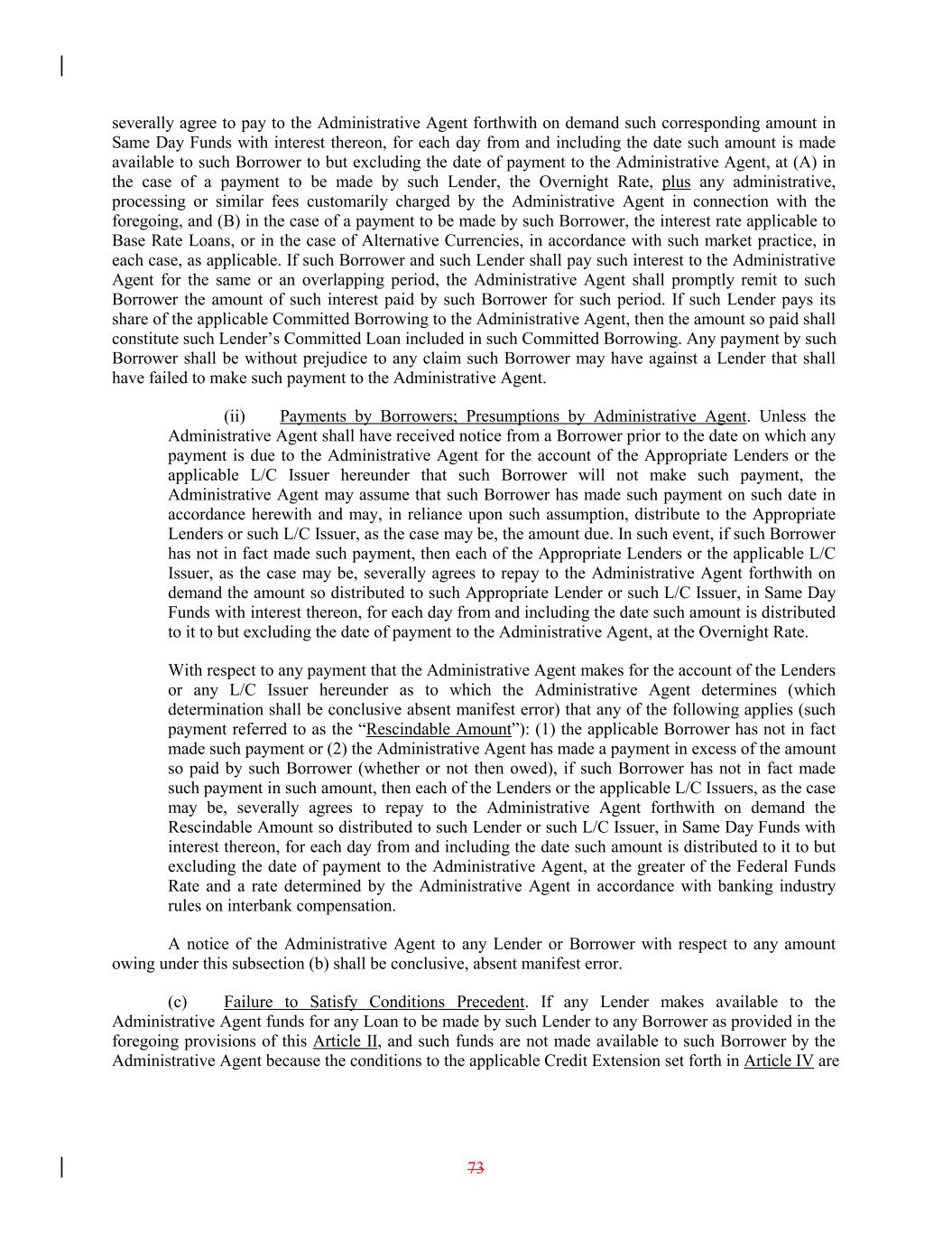 severally agree to pay to the Administrative Agent forthwith on demand such corresponding amount in Same Day Funds with interest thereon, for each day from and including the date such amount is made available to such Borrower to but excluding the date of payment to the Administrative Agent, at (A) in the case of a payment to be made by such Lender, the Overnight Rate, plus any administrative, processing or similar fees customarily charged by the Administrative Agent in connection with the foregoing, and (B) in the case of a payment to be made by such Borrower, the interest rate applicable to Base Rate Loans, or in the case of Alternative Currencies, in accordance with such market practice, in each case, as applicable. If such Borrower and such Lender shall pay such interest to the Administrative Agent for the same or an overlapping period, the Administrative Agent shall promptly remit to such Borrower the amount of such interest paid by such Borrower for such period. If such Lender pays its share of the applicable Committed Borrowing to the Administrative Agent, then the amount so paid shall constitute such Lender’s Committed Loan included in such Committed Borrowing. Any payment by such Borrower shall be without prejudice to any claim such Borrower may have against a Lender that shall have failed to make such payment to the Administrative Agent. (ii) Payments by Borrowers; Presumptions by Administrative Agent. Unless the Administrative Agent shall have received notice from a Borrower prior to the date on which any payment is due to the Administrative Agent for the account of the Appropriate Lenders or the applicable L/C Issuer hereunder that such Borrower will not make such payment, the Administrative Agent may assume that such Borrower has made such payment on such date in accordance herewith and may, in reliance upon such assumption, distribute to the Appropriate Lenders or such L/C Issuer, as the case may be, the amount due. In such event, if such Borrower has not in fact made such payment, then each of the Appropriate Lenders or the applicable L/C Issuer, as the case may be, severally agrees to repay to the Administrative Agent forthwith on demand the amount so distributed to such Appropriate Lender or such L/C Issuer, in Same Day Funds with interest thereon, for each day from and including the date such amount is distributed to it to but excluding the date of payment to the Administrative Agent, at the Overnight Rate. With respect to any payment that the Administrative Agent makes for the account of the Lenders or any L/C Issuer hereunder as to which the Administrative Agent determines (which determination shall be conclusive absent manifest error) that any of the following applies (such payment referred to as the “Rescindable Amount”): (1) the applicable Borrower has not in fact made such payment or (2) the Administrative Agent has made a payment in excess of the amount so paid by such Borrower (whether or not then owed), if such Borrower has not in fact made such payment in such amount, then each of the Lenders or the applicable L/C Issuers, as the case may be, severally agrees to repay to the Administrative Agent forthwith on demand the Rescindable Amount so distributed to such Lender or such L/C Issuer, in Same Day Funds with interest thereon, for each day from and including the date such amount is distributed to it to but excluding the date of payment to the Administrative Agent, at the greater of the Federal Funds Rate and a rate determined by the Administrative Agent in accordance with banking industry rules on interbank compensation. A notice of the Administrative Agent to any Lender or Borrower with respect to any amount owing under this subsection (b) shall be conclusive, absent manifest error. (c) Failure to Satisfy Conditions Precedent. If any Lender makes available to the Administrative Agent funds for any Loan to be made by such Lender to any Borrower as provided in the foregoing provisions of this Article II, and such funds are not made available to such Borrower by the Administrative Agent because the conditions to the applicable Credit Extension set forth in Article IV are 73