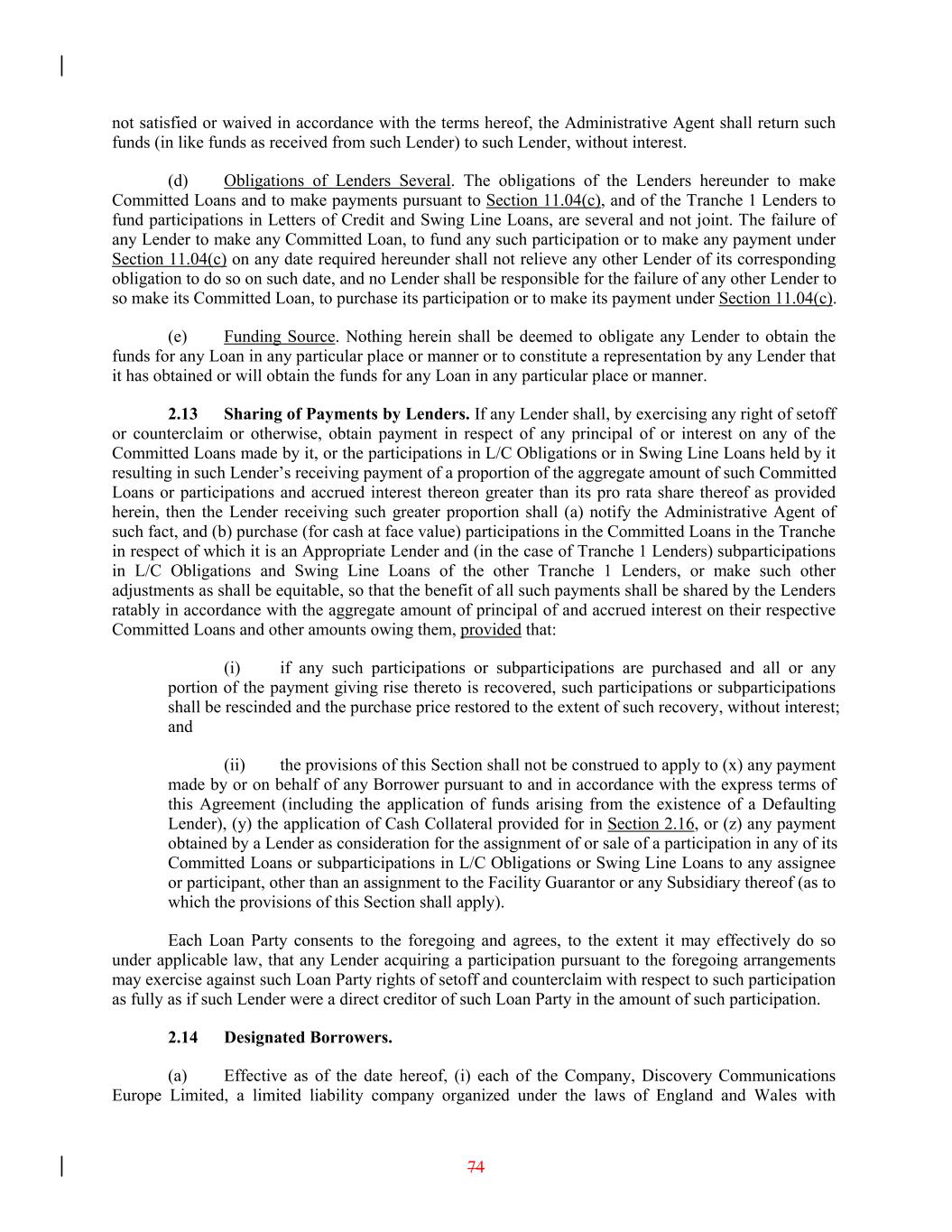not satisfied or waived in accordance with the terms hereof, the Administrative Agent shall return such funds (in like funds as received from such Lender) to such Lender, without interest. (d) Obligations of Lenders Several. The obligations of the Lenders hereunder to make Committed Loans and to make payments pursuant to Section 11.04(c), and of the Tranche 1 Lenders to fund participations in Letters of Credit and Swing Line Loans, are several and not joint. The failure of any Lender to make any Committed Loan, to fund any such participation or to make any payment under Section 11.04(c) on any date required hereunder shall not relieve any other Lender of its corresponding obligation to do so on such date, and no Lender shall be responsible for the failure of any other Lender to so make its Committed Loan, to purchase its participation or to make its payment under Section 11.04(c). (e) Funding Source. Nothing herein shall be deemed to obligate any Lender to obtain the funds for any Loan in any particular place or manner or to constitute a representation by any Lender that it has obtained or will obtain the funds for any Loan in any particular place or manner. 2.13 Sharing of Payments by Lenders. If any Lender shall, by exercising any right of setoff or counterclaim or otherwise, obtain payment in respect of any principal of or interest on any of the Committed Loans made by it, or the participations in L/C Obligations or in Swing Line Loans held by it resulting in such Lender’s receiving payment of a proportion of the aggregate amount of such Committed Loans or participations and accrued interest thereon greater than its pro rata share thereof as provided herein, then the Lender receiving such greater proportion shall (a) notify the Administrative Agent of such fact, and (b) purchase (for cash at face value) participations in the Committed Loans in the Tranche in respect of which it is an Appropriate Lender and (in the case of Tranche 1 Lenders) subparticipations in L/C Obligations and Swing Line Loans of the other Tranche 1 Lenders, or make such other adjustments as shall be equitable, so that the benefit of all such payments shall be shared by the Lenders ratably in accordance with the aggregate amount of principal of and accrued interest on their respective Committed Loans and other amounts owing them, provided that: (i) if any such participations or subparticipations are purchased and all or any portion of the payment giving rise thereto is recovered, such participations or subparticipations shall be rescinded and the purchase price restored to the extent of such recovery, without interest; and (ii) the provisions of this Section shall not be construed to apply to (x) any payment made by or on behalf of any Borrower pursuant to and in accordance with the express terms of this Agreement (including the application of funds arising from the existence of a Defaulting Lender), (y) the application of Cash Collateral provided for in Section 2.16, or (z) any payment obtained by a Lender as consideration for the assignment of or sale of a participation in any of its Committed Loans or subparticipations in L/C Obligations or Swing Line Loans to any assignee or participant, other than an assignment to the Facility Guarantor or any Subsidiary thereof (as to which the provisions of this Section shall apply). Each Loan Party consents to the foregoing and agrees, to the extent it may effectively do so under applicable law, that any Lender acquiring a participation pursuant to the foregoing arrangements may exercise against such Loan Party rights of setoff and counterclaim with respect to such participation as fully as if such Lender were a direct creditor of such Loan Party in the amount of such participation. 2.14 Designated Borrowers. (a) Effective as of the date hereof, (i) each of the Company, Discovery Communications Europe Limited, a limited liability company organized under the laws of England and Wales with 74