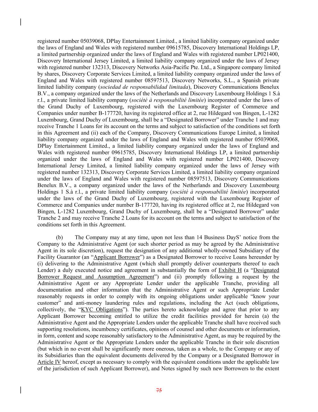 registered number 05039068, DPlay Entertainment Limited., a limited liability company organized under the laws of England and Wales with registered number 09615785, Discovery International Holdings LP, a limited partnership organized under the laws of England and Wales with registered number LP021400, Discovery International Jersey Limited, a limited liability company organized under the laws of Jersey with registered number 132313, Discovery Networks Asia-Pacific Pte. Ltd., a Singapore company limited by shares, Discovery Corporate Services Limited, a limited liability company organized under the laws of England and Wales with registered number 08597513, Discovery Networks, S.L., a Spanish private limited liability company (sociedad de responsabilidad limitada), Discovery Communications Benelux B.V., a company organized under the laws of the Netherlands and Discovery Luxembourg Holdings 1 S.à r.l., a private limited liability company (société à responsabilité limitée) incorporated under the laws of the Grand Duchy of Luxembourg, registered with the Luxembourg Register of Commerce and Companies under number B-177720, having its registered office at 2, rue Hildegard von Bingen, L-1282 Luxembourg, Grand Duchy of Luxembourg, shall be a “Designated Borrower” under Tranche 1 and may receive Tranche 1 Loans for its account on the terms and subject to satisfaction of the conditions set forth in this Agreement and (ii) each of the Company, Discovery Communications Europe Limited, a limited liability company organized under the laws of England and Wales with registered number 05039068, DPlay Entertainment Limited., a limited liability company organized under the laws of England and Wales with registered number 09615785, Discovery International Holdings LP, a limited partnership organized under the laws of England and Wales with registered number LP021400, Discovery International Jersey Limited, a limited liability company organized under the laws of Jersey with registered number 132313, Discovery Corporate Services Limited, a limited liability company organized under the laws of England and Wales with registered number 08597513, Discovery Communications Benelux B.V., a company organized under the laws of the Netherlands and Discovery Luxembourg Holdings 1 S.à r.l., a private limited liability company (société à responsabilité limitée) incorporated under the laws of the Grand Duchy of Luxembourg, registered with the Luxembourg Register of Commerce and Companies under number B-177720, having its registered office at 2, rue Hildegard von Bingen, L-1282 Luxembourg, Grand Duchy of Luxembourg, shall be a “Designated Borrower” under Tranche 2 and may receive Tranche 2 Loans for its account on the terms and subject to satisfaction of the conditions set forth in this Agreement. (b) The Company may at any time, upon not less than 14 Business DayS’ notice from the Company to the Administrative Agent (or such shorter period as may be agreed by the Administrative Agent in its sole discretion), request the designation of any additional wholly-owned Subsidiary of the Facility Guarantor (an “Applicant Borrower”) as a Designated Borrower to receive Loans hereunder by (i) delivering to the Administrative Agent (which shall promptly deliver counterparts thereof to each Lender) a duly executed notice and agreement in substantially the form of Exhibit H (a “Designated Borrower Request and Assumption Agreement”) and (ii) promptly following a request by the Administrative Agent or any Appropriate Lender under the applicable Tranche, providing all documentation and other information that the Administrative Agent or such Appropriate Lender reasonably requests in order to comply with its ongoing obligations under applicable “know your customer” and anti-money laundering rules and regulations, including the Act (such obligations, collectively, the “KYC Obligations”). The parties hereto acknowledge and agree that prior to any Applicant Borrower becoming entitled to utilize the credit facilities provided for herein (a) the Administrative Agent and the Appropriate Lenders under the applicable Tranche shall have received such supporting resolutions, incumbency certificates, opinions of counsel and other documents or information, in form, content and scope reasonably satisfactory to the Administrative Agent, as may be required by the Administrative Agent or the Appropriate Lenders under the applicable Tranche in their sole discretion (but which in no event shall be significantly more onerous, taken as a whole, to the Company or any of its Subsidiaries than the equivalent documents delivered by the Company or a Designated Borrower in Article IV hereof, except as necessary to comply with the equivalent conditions under the applicable law of the jurisdiction of such Applicant Borrower), and Notes signed by such new Borrowers to the extent 75