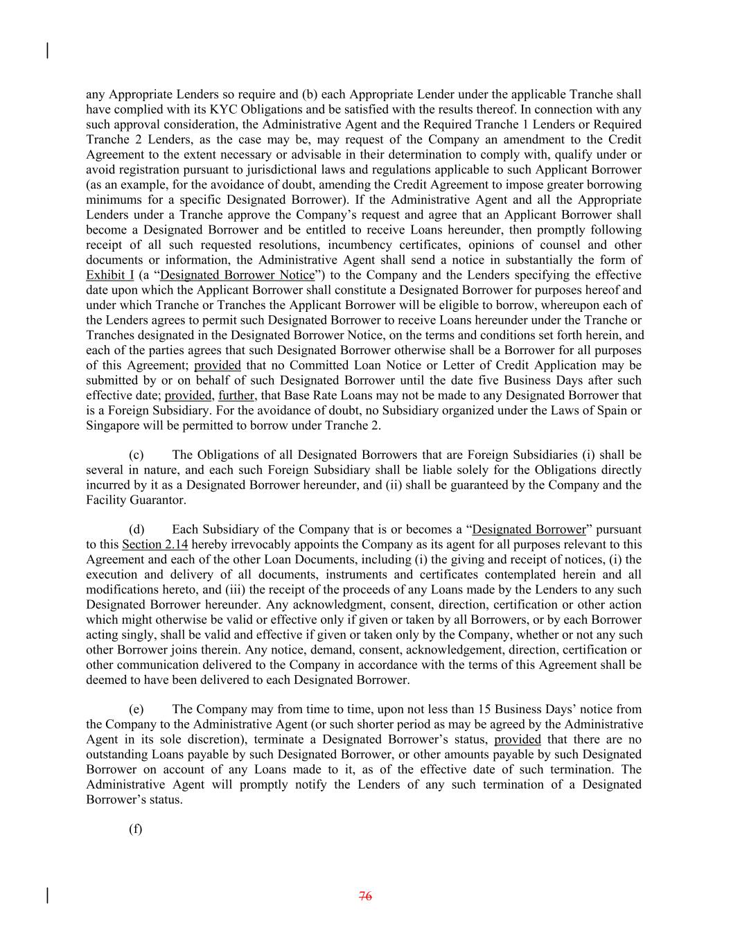 any Appropriate Lenders so require and (b) each Appropriate Lender under the applicable Tranche shall have complied with its KYC Obligations and be satisfied with the results thereof. In connection with any such approval consideration, the Administrative Agent and the Required Tranche 1 Lenders or Required Tranche 2 Lenders, as the case may be, may request of the Company an amendment to the Credit Agreement to the extent necessary or advisable in their determination to comply with, qualify under or avoid registration pursuant to jurisdictional laws and regulations applicable to such Applicant Borrower (as an example, for the avoidance of doubt, amending the Credit Agreement to impose greater borrowing minimums for a specific Designated Borrower). If the Administrative Agent and all the Appropriate Lenders under a Tranche approve the Company’s request and agree that an Applicant Borrower shall become a Designated Borrower and be entitled to receive Loans hereunder, then promptly following receipt of all such requested resolutions, incumbency certificates, opinions of counsel and other documents or information, the Administrative Agent shall send a notice in substantially the form of Exhibit I (a “Designated Borrower Notice”) to the Company and the Lenders specifying the effective date upon which the Applicant Borrower shall constitute a Designated Borrower for purposes hereof and under which Tranche or Tranches the Applicant Borrower will be eligible to borrow, whereupon each of the Lenders agrees to permit such Designated Borrower to receive Loans hereunder under the Tranche or Tranches designated in the Designated Borrower Notice, on the terms and conditions set forth herein, and each of the parties agrees that such Designated Borrower otherwise shall be a Borrower for all purposes of this Agreement; provided that no Committed Loan Notice or Letter of Credit Application may be submitted by or on behalf of such Designated Borrower until the date five Business Days after such effective date; provided, further, that Base Rate Loans may not be made to any Designated Borrower that is a Foreign Subsidiary. For the avoidance of doubt, no Subsidiary organized under the Laws of Spain or Singapore will be permitted to borrow under Tranche 2. (c) The Obligations of all Designated Borrowers that are Foreign Subsidiaries (i) shall be several in nature, and each such Foreign Subsidiary shall be liable solely for the Obligations directly incurred by it as a Designated Borrower hereunder, and (ii) shall be guaranteed by the Company and the Facility Guarantor. (d) Each Subsidiary of the Company that is or becomes a “Designated Borrower” pursuant to this Section 2.14 hereby irrevocably appoints the Company as its agent for all purposes relevant to this Agreement and each of the other Loan Documents, including (i) the giving and receipt of notices, (i) the execution and delivery of all documents, instruments and certificates contemplated herein and all modifications hereto, and (iii) the receipt of the proceeds of any Loans made by the Lenders to any such Designated Borrower hereunder. Any acknowledgment, consent, direction, certification or other action which might otherwise be valid or effective only if given or taken by all Borrowers, or by each Borrower acting singly, shall be valid and effective if given or taken only by the Company, whether or not any such other Borrower joins therein. Any notice, demand, consent, acknowledgement, direction, certification or other communication delivered to the Company in accordance with the terms of this Agreement shall be deemed to have been delivered to each Designated Borrower. (e) The Company may from time to time, upon not less than 15 Business Days’ notice from the Company to the Administrative Agent (or such shorter period as may be agreed by the Administrative Agent in its sole discretion), terminate a Designated Borrower’s status, provided that there are no outstanding Loans payable by such Designated Borrower, or other amounts payable by such Designated Borrower on account of any Loans made to it, as of the effective date of such termination. The Administrative Agent will promptly notify the Lenders of any such termination of a Designated Borrower’s status. (f) 76